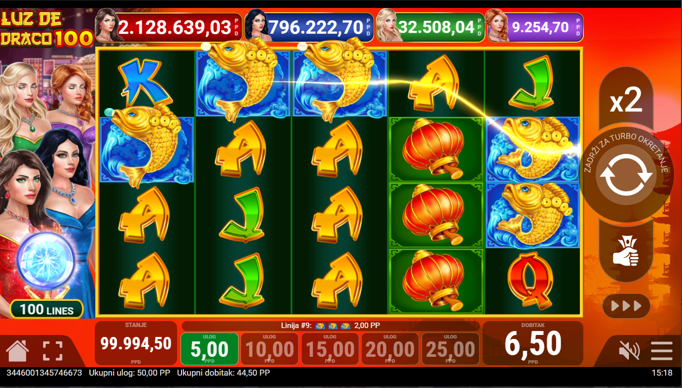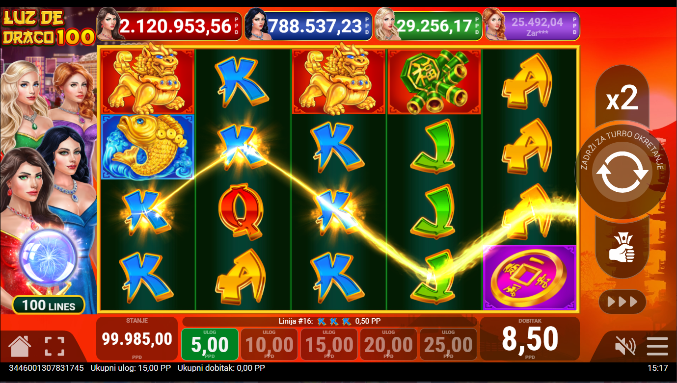 Odaberi svoj ulog, pritisni Spin i pusti da zmajevi pokažu svoju moć! U Luz de Draco 100, što više simbola uskladiš, to žešće plamte tvoji dobici. Posebni simboli donose dodatne nagrade, besplatne vrtnje i prilike za ogromne dobitke. Igraj pametno, ali i s dozom hrabrosti, jer svaki zmaj nagrađuje one koji se ne boje vatre!