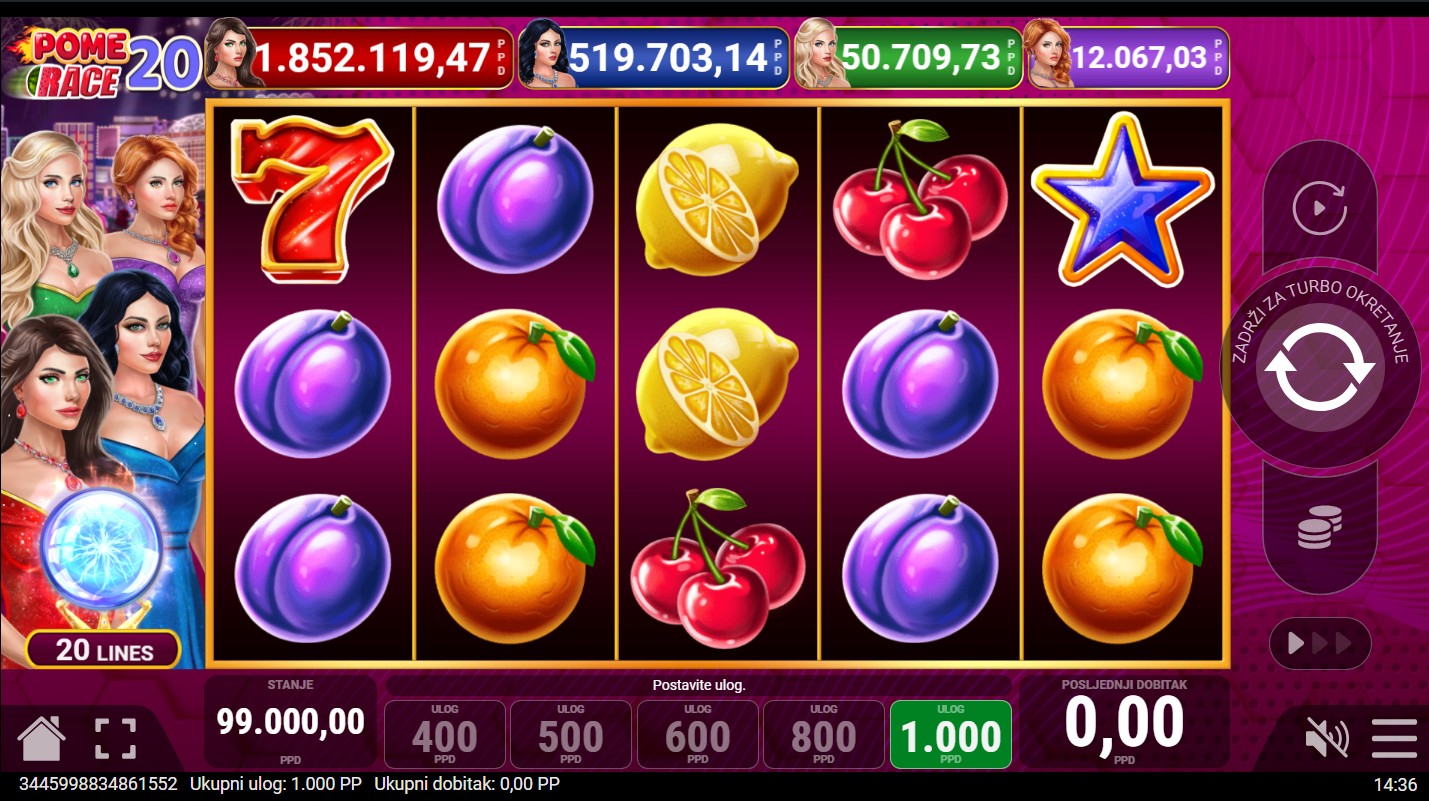 Pome Race 20 ima RTP od 96,27%, što znači da pruža vrlo solidne šanse za dobitak tijekom igre. Volatilnost je niska, što znači da igra često donosi dobitke, ali manjih iznosa. Idealna je za igrače koji vole stabilnu i dugotrajnu igru s čestim nagradama, bez velikih rizika, dok uzbuđenje dolazi iz stalnih pobjeda i aktiviranja bonus značajki.