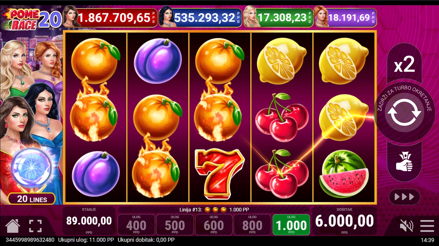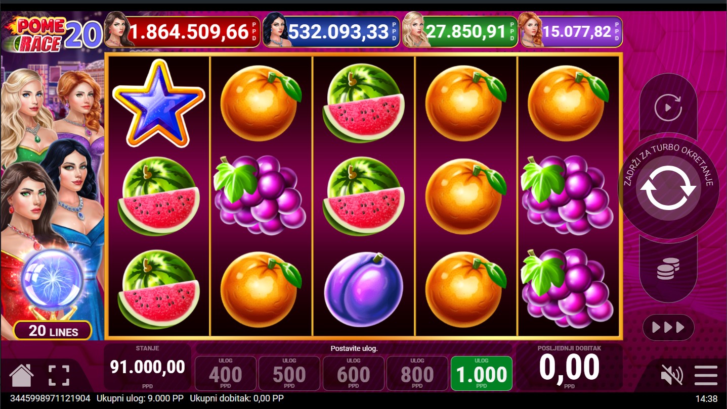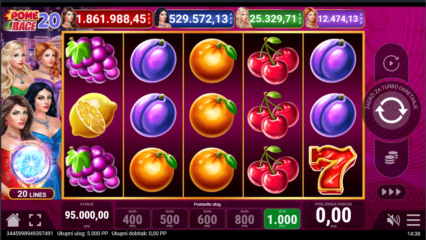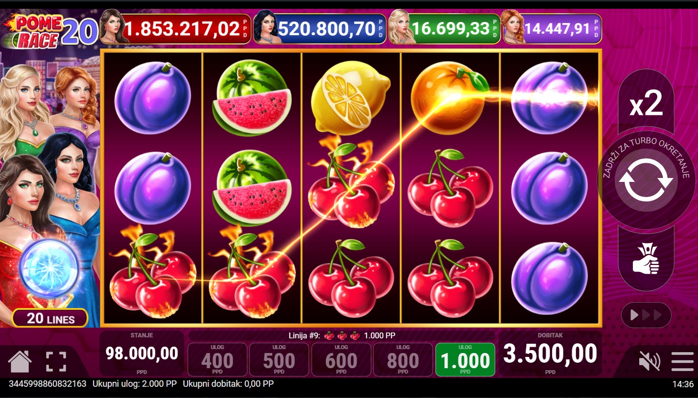 Pripremi se za dvostruko više zabave u Pome Race 20, uzbudljivoj voćnoj slot igri renomiranog providera Pateplay! Ova dinamična slot avantura odvija se na 5 bubnjeva i 20 isplatnih linija, donoseći još više mogućnosti za dobitne kombinacije i napetu voćnu utrku punu iznenađenja. Uz klasične voćne simbole, igra nudi i Extra Cash tajanstveni bonus, koji se može aktivirati nasumično i donijeti dodatne nagrade. Tu je i četverorazinski jackpot s razinama Red, Blue, Green i Purple, koji pruža priliku za osvajanje vrijednih jackpot nagrada u svakom trenutku. Ako uživaš u klasičnim slotovima s modernim značajkama i adrenalinom voćne utrke, Pome Race 20 donosi pravu dozu uzbuđenja!