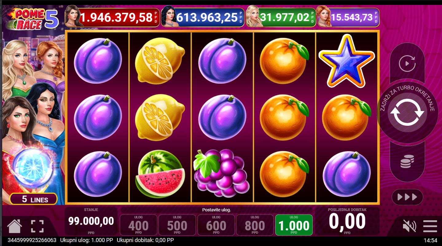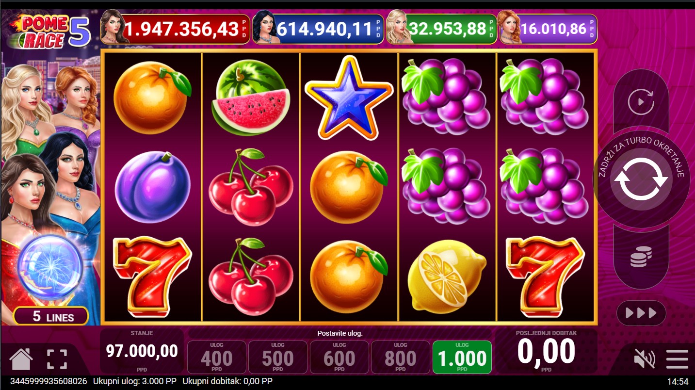 Pome Race 5 vodi te u uzbudljivu utrku voćnih simbola! Ova klasična slot igra poznatog providera Pateplay donosi brzu akciju i čistu zabavu na 5 bubnjeva i 5 isplatnih linija, idealnu za ljubitelje tradicionalnih igara s modernim značajkama. Igra donosi priliku za osvajanje četverorazinskog jackpota: Red, Blue, Green i Purple, koji se može aktivirati u bilo kojem trenutku. Uz to, nasumični Extra Cash tajanstveni bonus unosi dodatno uzbuđenje i može donijeti vrijedne iznose iznenađenja. Ako voliš jednostavne, ali napete slot igre koje pružaju klasični šarm i mogućnost velikih iznenađenja, Pome Race 5 savršen je izbor!