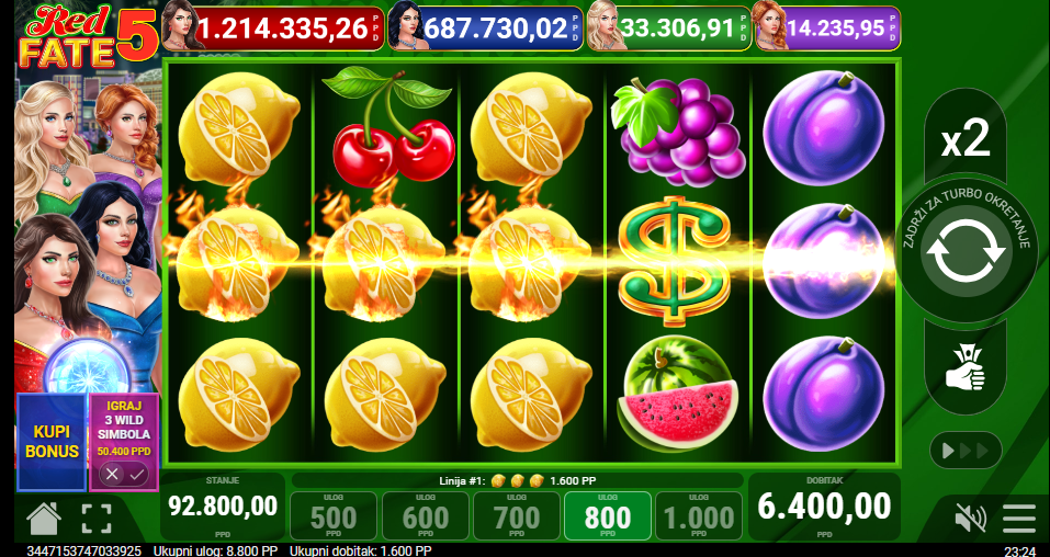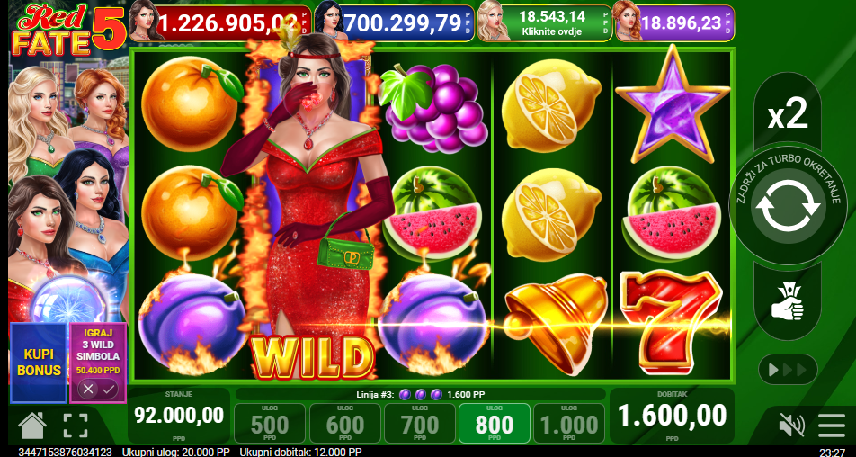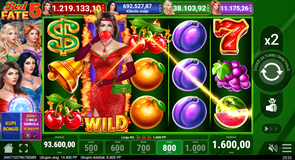 Redfate 5 od Pateplay donosi jednostavnu igru koja kombinira voćne simbole i klasičan slot izgled s modernim detaljima. Sedmice, zvjezdice i trešnje plešu na bubnjevima dok se značajke, poput proširujućih Wildova i Jackpot sustava, provlače ispod površine. S opcijom Buy Bonus igrač može aktivirati posevnu rundu, a četiri Regal Jackpot sustava dodaju sloj iznenađenja!