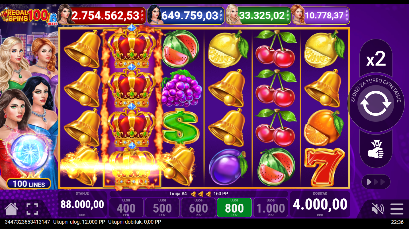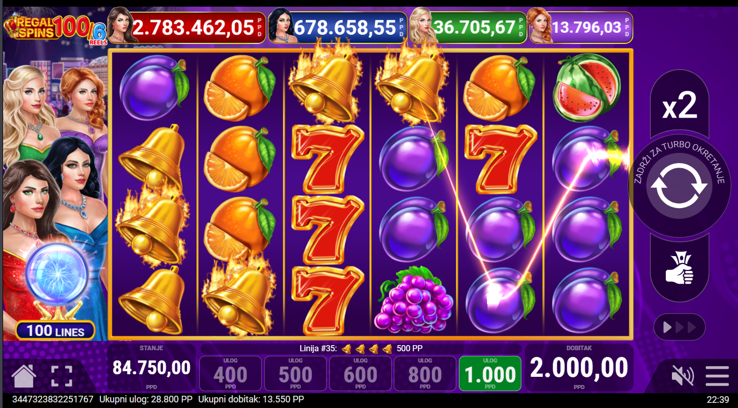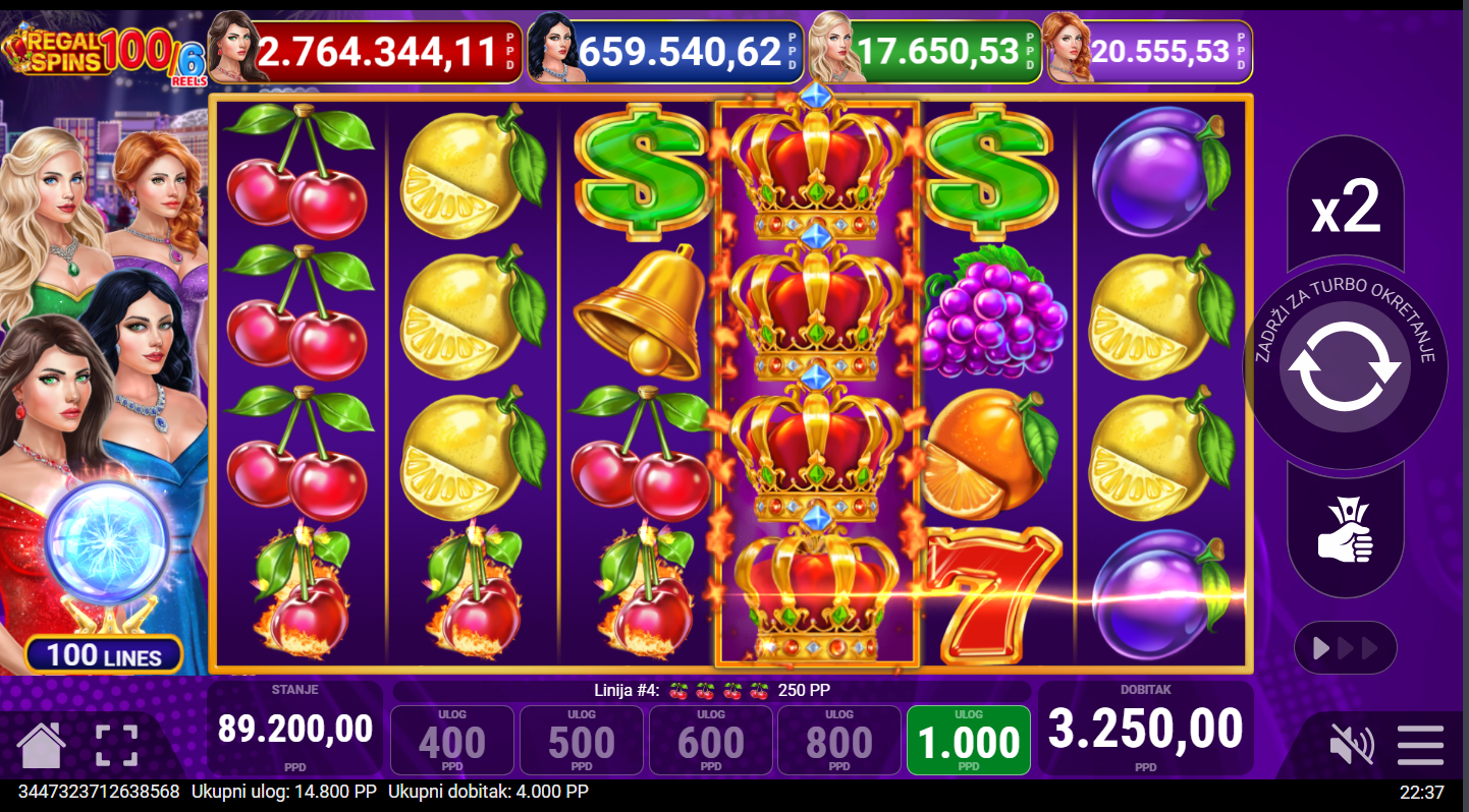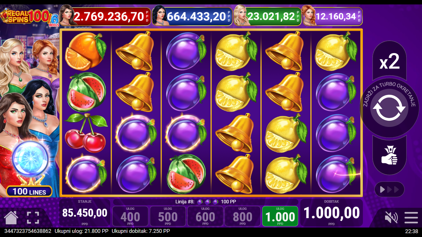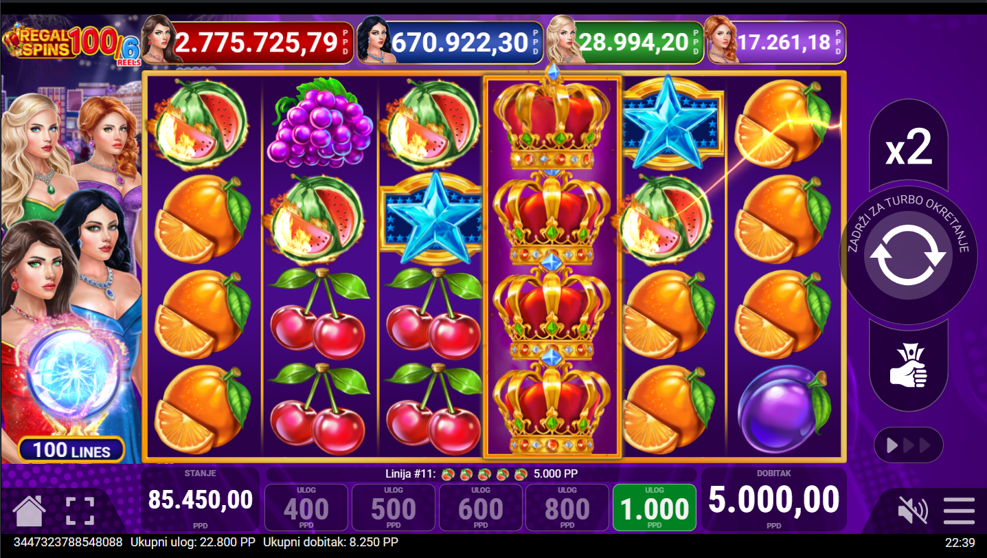 Regal Spins 100/6 od Pateplaya donosi elegantan slot koji kombinira luksuz i klasiku! Voćni simboli nikad nisu izgledali ovako sjajno- trešnje naranče i sedmice vrte se u raskošnom okruženju zlatnih okvira i svjetlucavih efekata. Ono što ovu verziju čini posebnom je šesti bubanj. On dodaje još više akcije i prilika za uzbudljive kombinacije. Proširujući Wild simboli, dva tipa Scattera u čak četiri nivoa Jackpota osiguravaju da svaki spin bude pun iznenađenja.