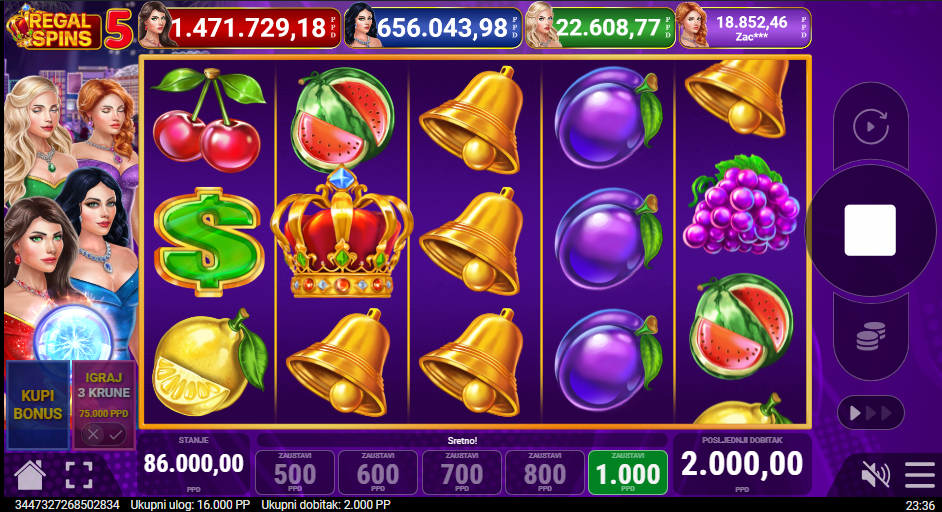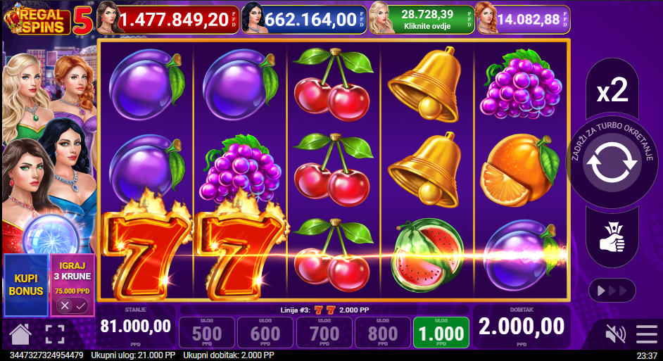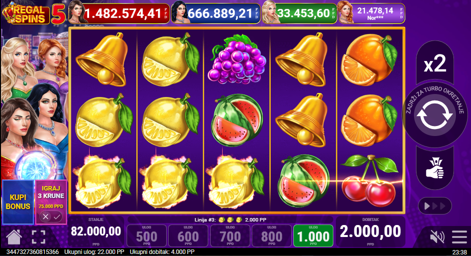 Regal Spins 5 od Pateplay donosi elegantni minimalistički slot koji nudi brzu, jasnu i napetu igru! S raskošnim zlatnim okvirom i sjajnim animacijama svaki spin donosi dojam pravog casino glamura! Iako je jednostavnija od većih serijala, Regal Spins 5 zadržava sve ono što čini Pateplay prepoznatljivim. Na bubnjevima igrača čekaju trešnje, limuni, lubenice i zlatne sedmice, a tu je proširujući wild koji donosi dodatnu dozu uzbuđenja.