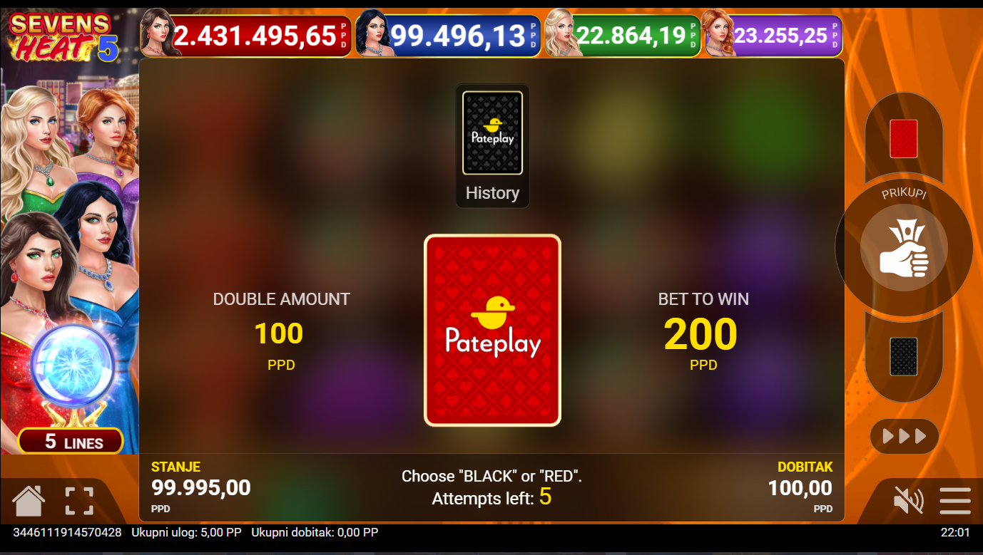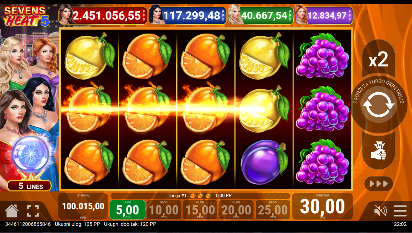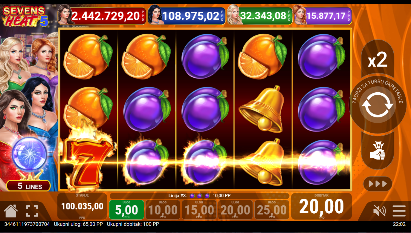 Pripremi se za vrući val sreće, Sevens Heat 5, od Pateplay, dolazi s eksplozivnom energijom klasičnih sedmica i vatrenih dobitaka! Sve je brzo, jednostavno i prepuno adrenalina. Kad se simboli sedmica počnu slagati, osjetiš instant napetost kao da si usred pravog kasino spektakla. Ovo je igra koja ne komplicira, samo grije i nagrađuje!