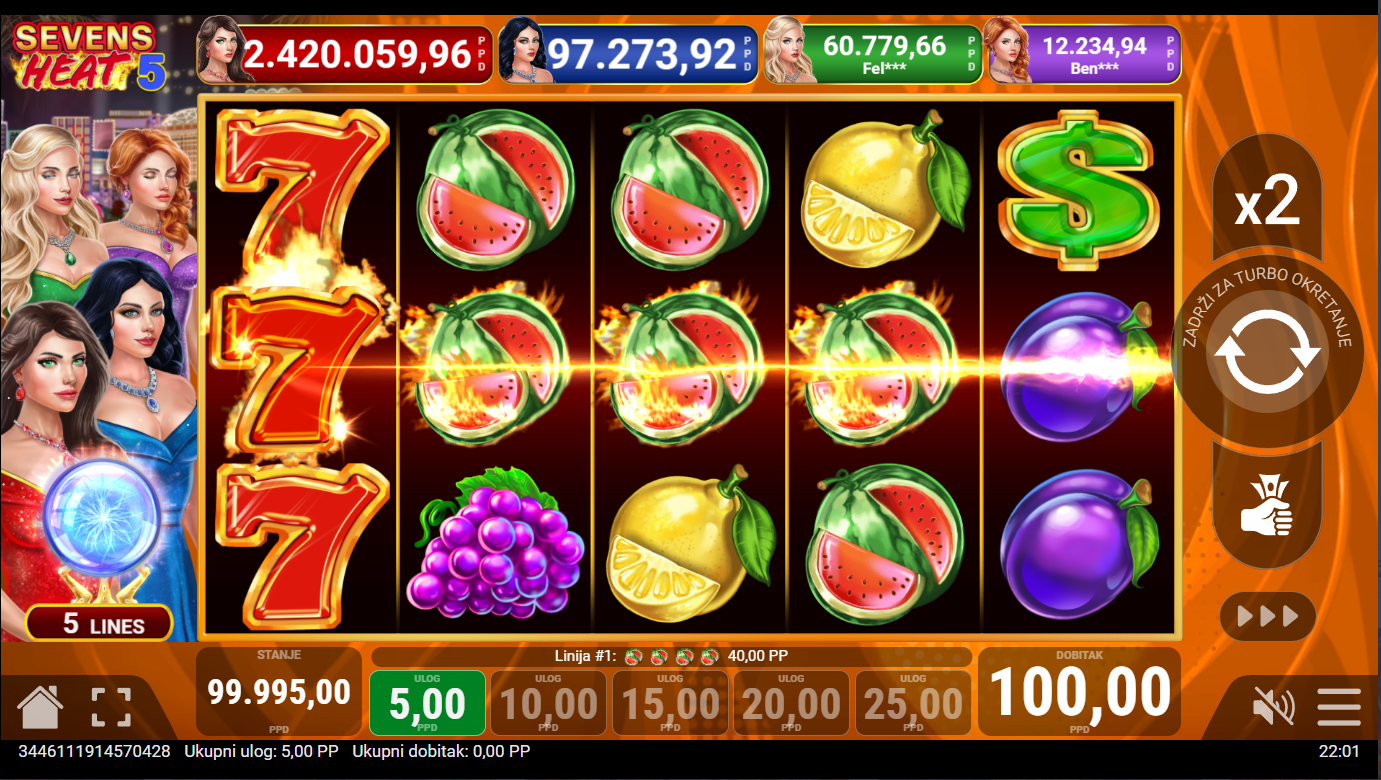 S oko 95% RTP-a i srednjom volatilnošću, Sevens Heat 5 daje ti balans između čestih dobitaka i povremenih većih heat trenutaka. Prava igra za one koji vole brzi ritam, čiste linije i osjećaj da je veliki dobitak doslovno jedan spin daleko.
