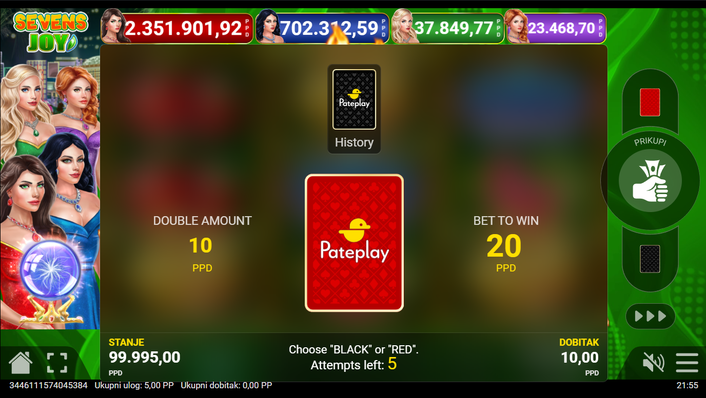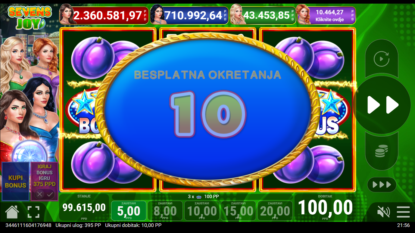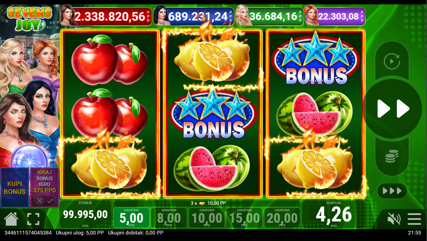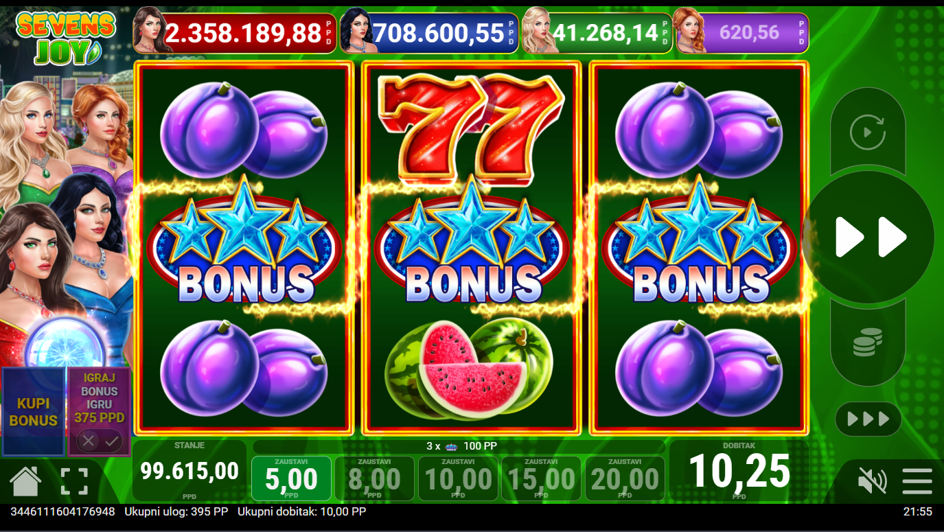 Sevens Joy ima srednju volatilnost i RTP od oko 95%, što donosi česte dobitke uz mogućnost povremenih velikih pogodaka. To je igra koja te drži u ritmu i nagrađuje strpljenje, jednostavna, brza i uvijek zabavna. Ako voliš čiste, jasne slotove bez komplikacija, Sevens Joy je pun pogodak.