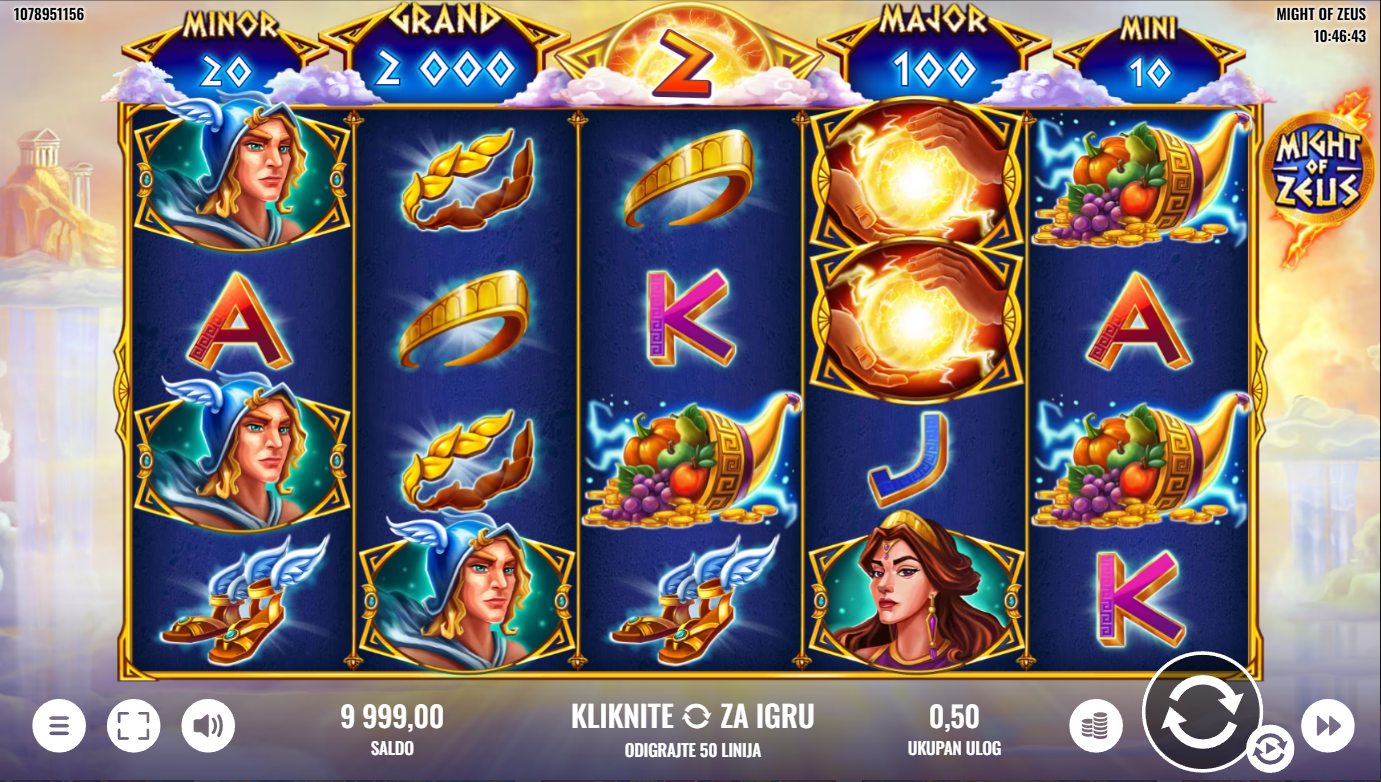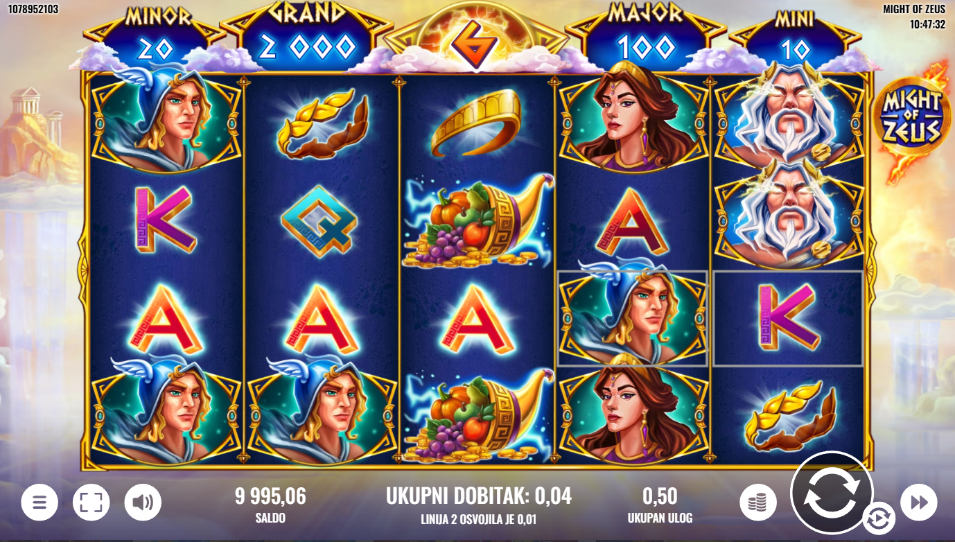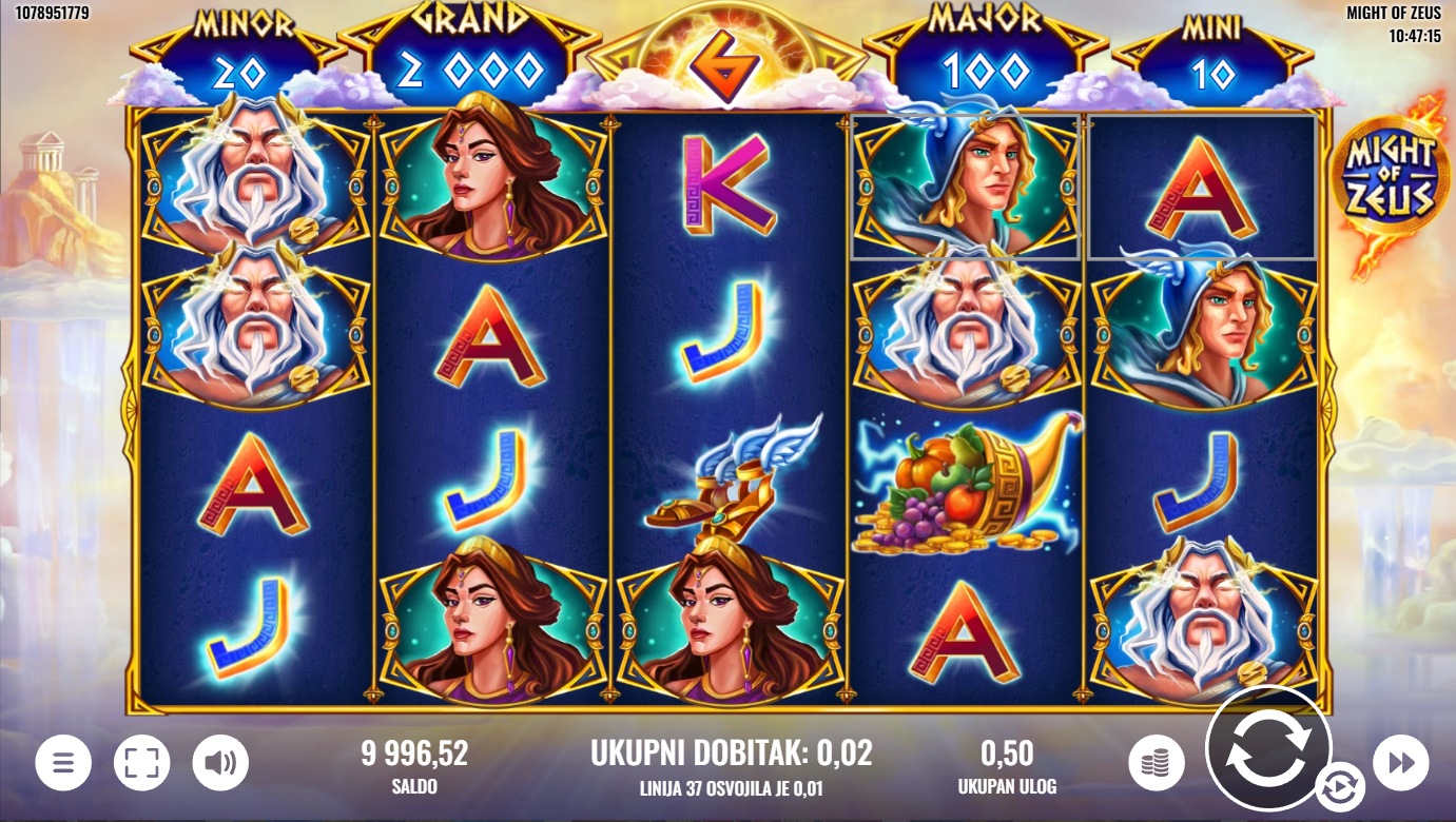 Postavi ulog, pritisni Spin i gledaj kako se simboli sudaraju pod Zeusovim munjama. Wild simboli i bonus simboli otvaraju vrata prema besplatnim vrtnjama, multiplikatorima i dodatnim iznenađenjima. Igra je jednostavna, ali svaki spin može eksplodirati u veliki dobitak, posebno kad Zeus odluči baciti svoju munju. Akcija bez čekanja, samo boom! na valjcima.