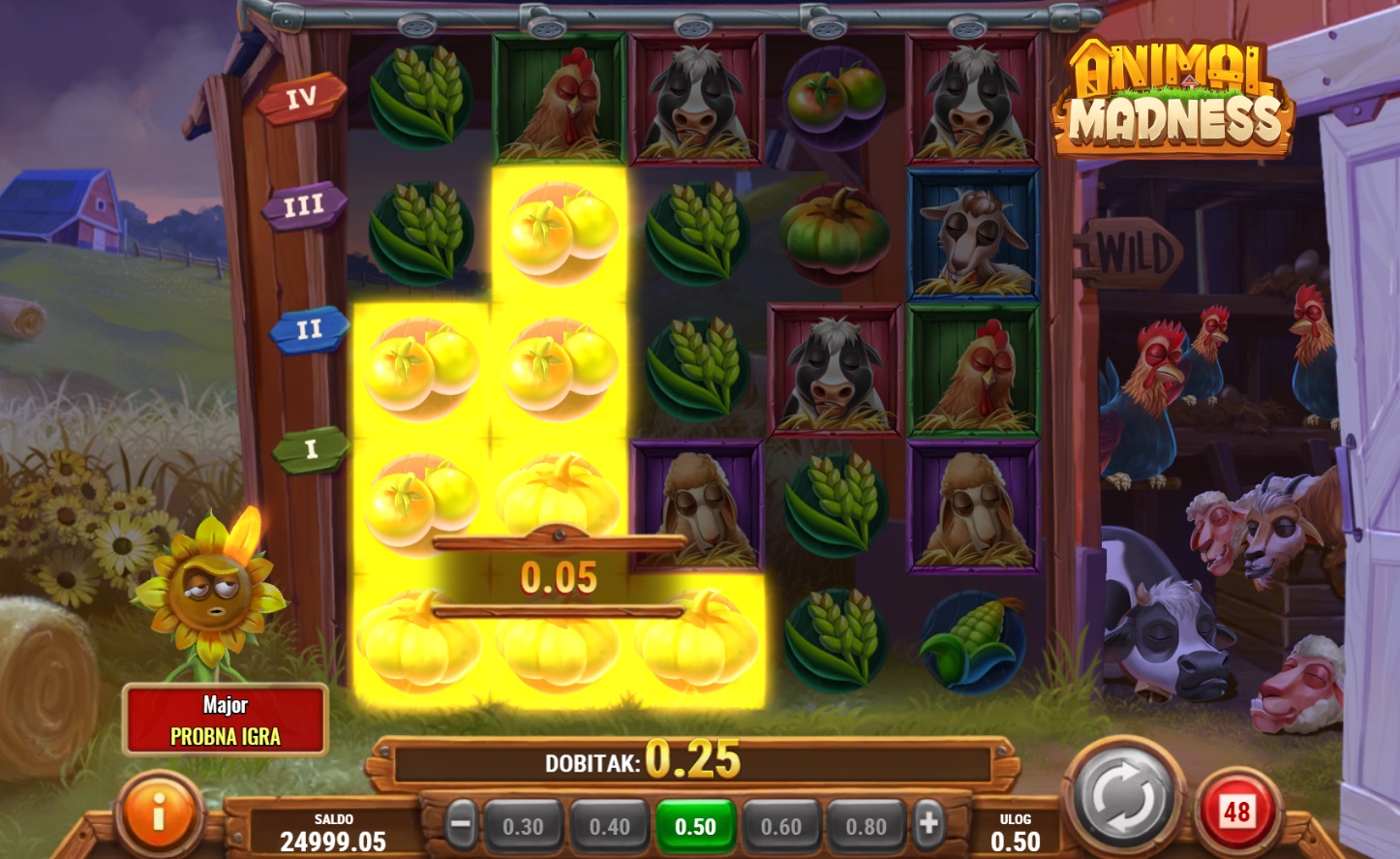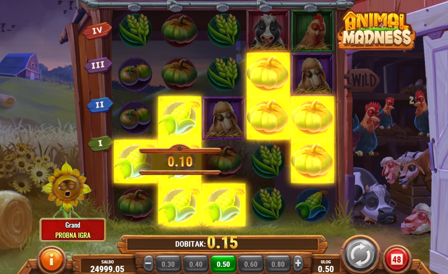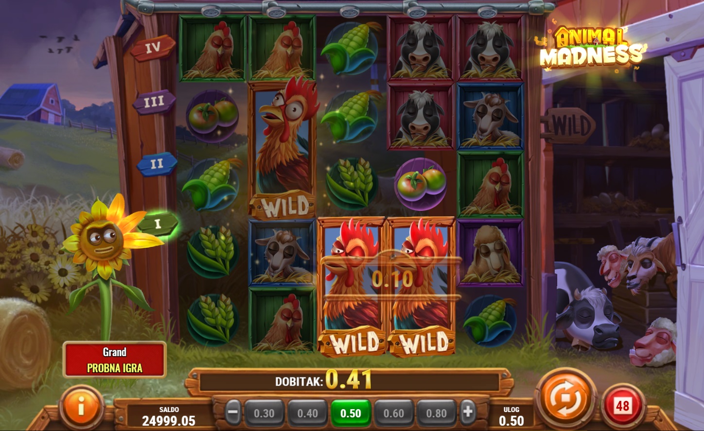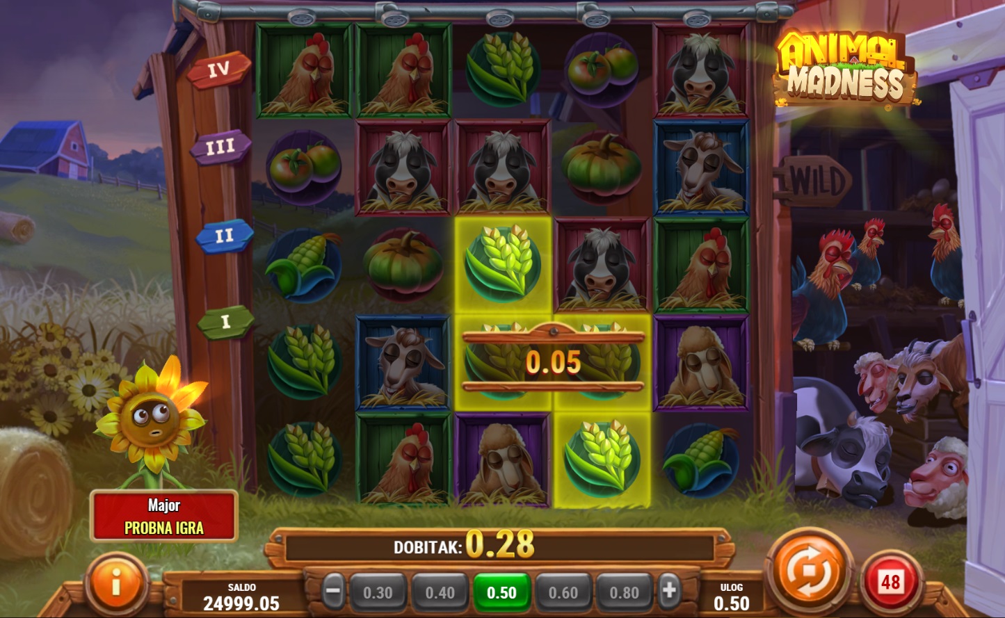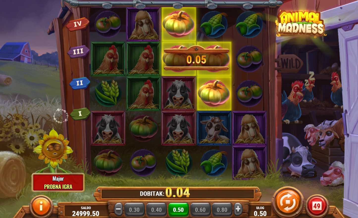 Animal Madness je zabavna i dinamična slot igra s 5x5 mrežom padajućih simbola. Ova igra pruža nevjerojatne mogućnosti za dobitak zahvaljujući bonusima poput lavina simbola i raznolikim Wild simbolima koji se šire po igraćoj ploči. Svoju sreću možeš okušati u nekoliko bonus igara, uključujući Sunflower bonus i Rabbit uništavanja, koji pružaju dodatne šanse za pobjedu. Živopisni simboli i razigrana atmosfera čine ovu igru savršenom za sve koji traže uzbuđenje i zabavu.