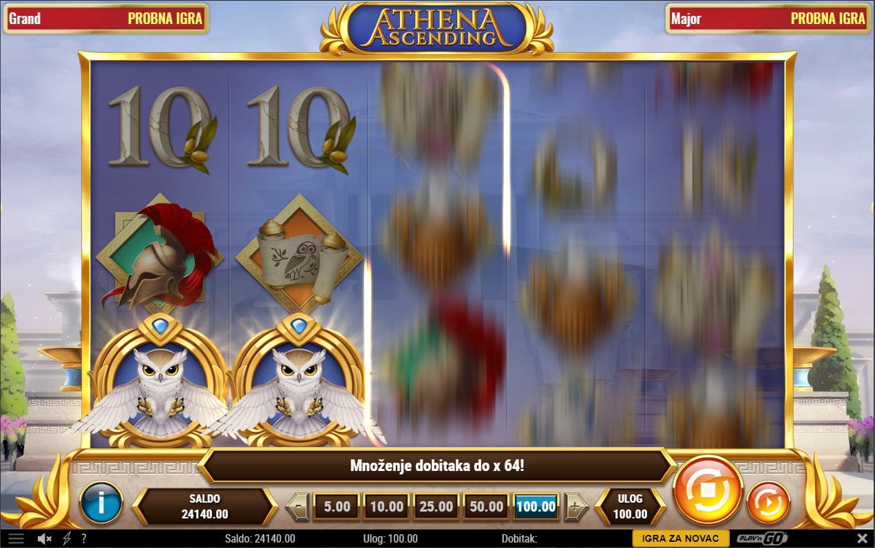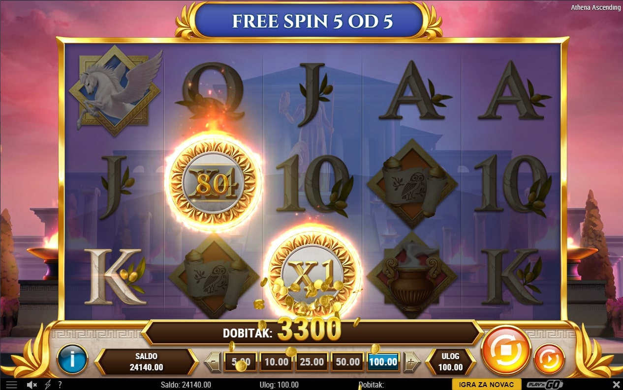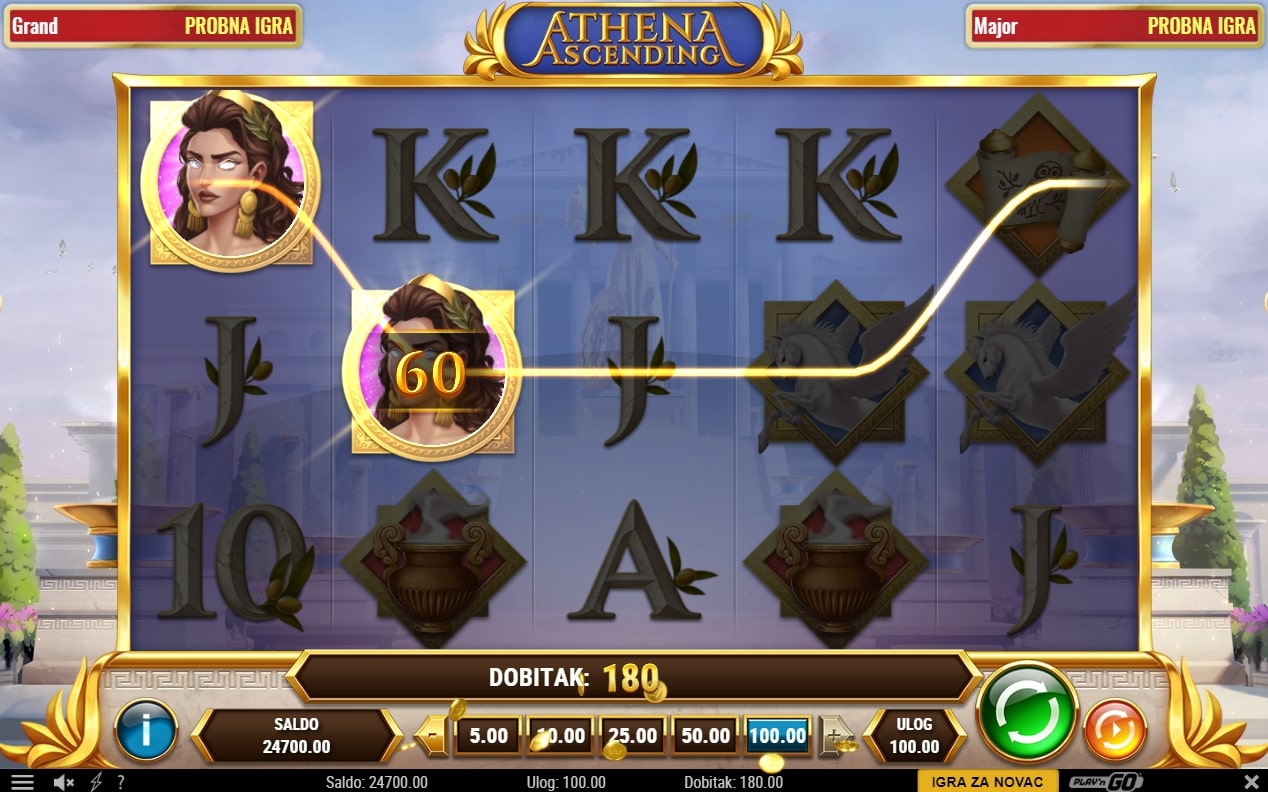 Athena Ascending povijesna je slot igra koja vodi igrača u kolijevku demokracije u potrazi za fantastičnim dobicima. Simboli su inspirirani starogrčkom mitologijom, a najviše isplaćuju oni Atene i Pegazusa. Besplatne vrtnje ostvaruju se nizanjem simbola sove koja označava mudrost po kojoj je Atena poznata, dok 'W' simbol mijenja druge simbole u potrazi za dobicima. Zaigraj Athena Ascending te ostvari nadnaravne nagrade!
