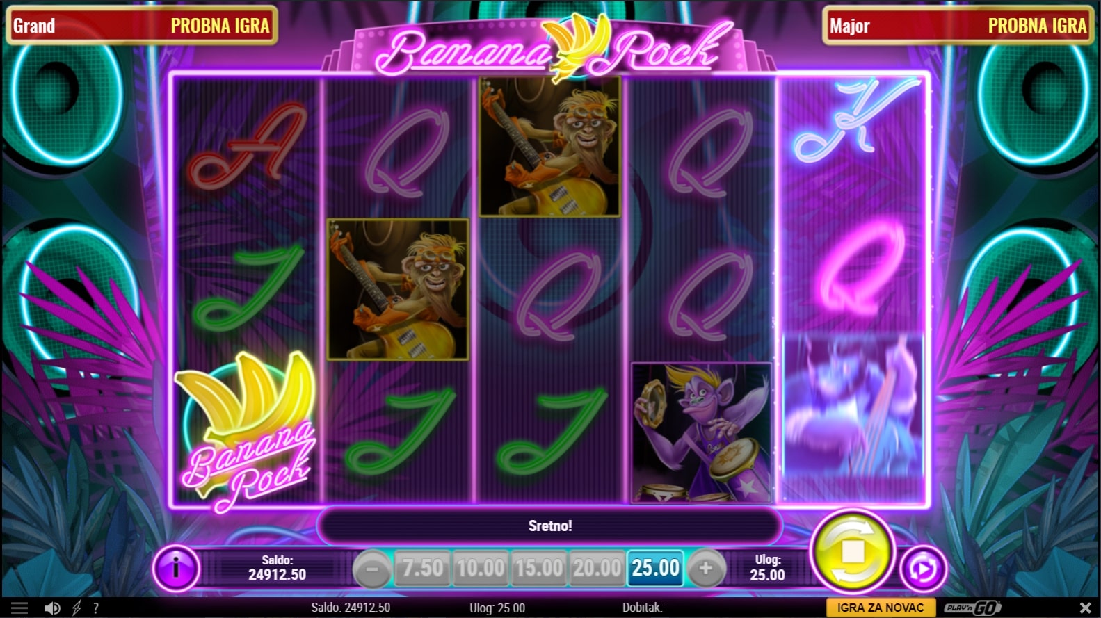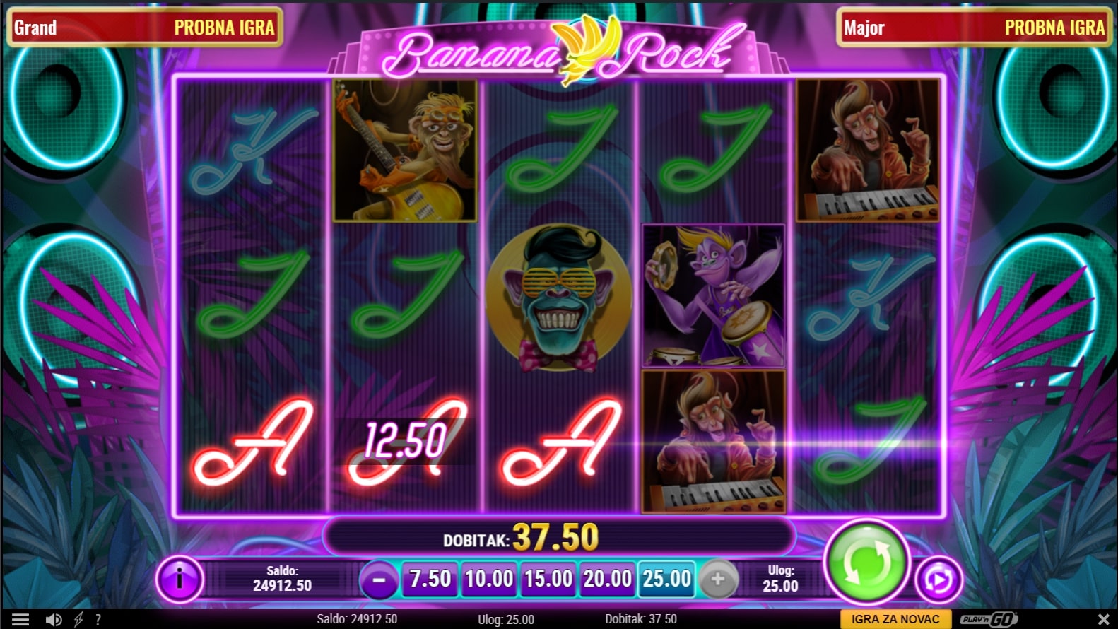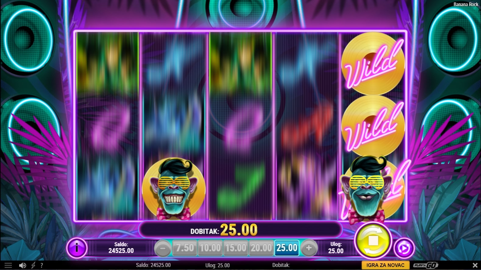 Banana Rock slot je igra zabavnog karaktera što vodi igrača u svijet majmuna-glazbenika popraćen vrhunskom svirkom i nezaboravnim dobicima. Najviše isplaćuju upravo simboli s ilustracijama majmuna, dok Wild simboli pomažu u stvaranju dobitaka djelujući kao zamjena za druge simbole. Uz to, igrač može aktivirati besplatne vrtnje, ali i ponovnu Rock 'n' Rollin vrtnju što se pokreće javljanjem dva Wild majmuna sa sunčanim naočalama. Zaigraj Banana Rock te osvoji fenomenalne nagrade!