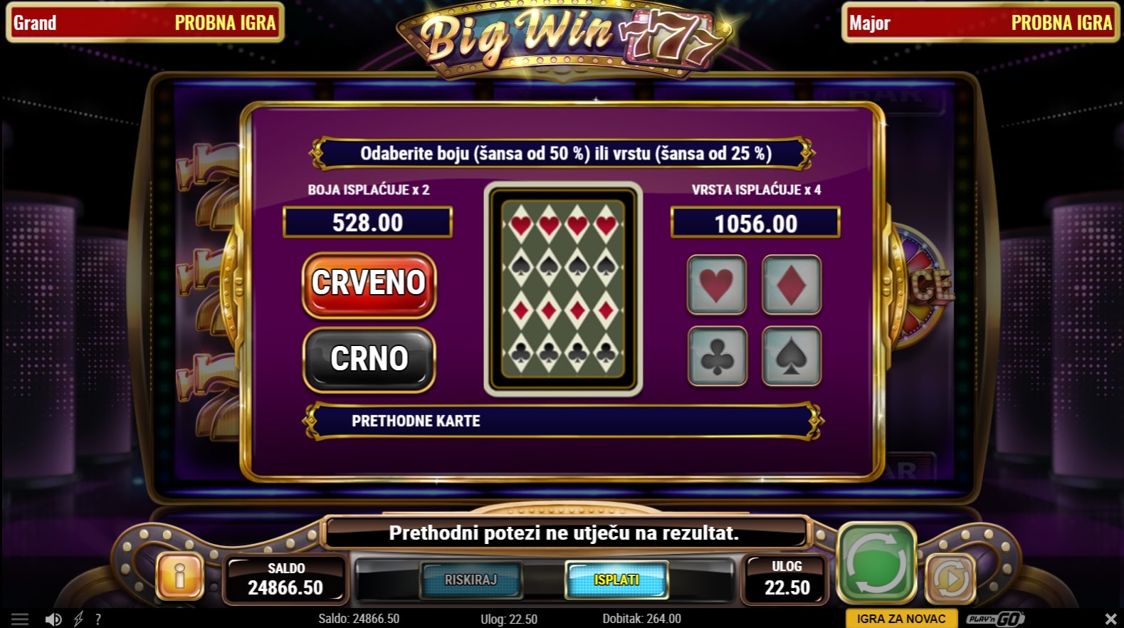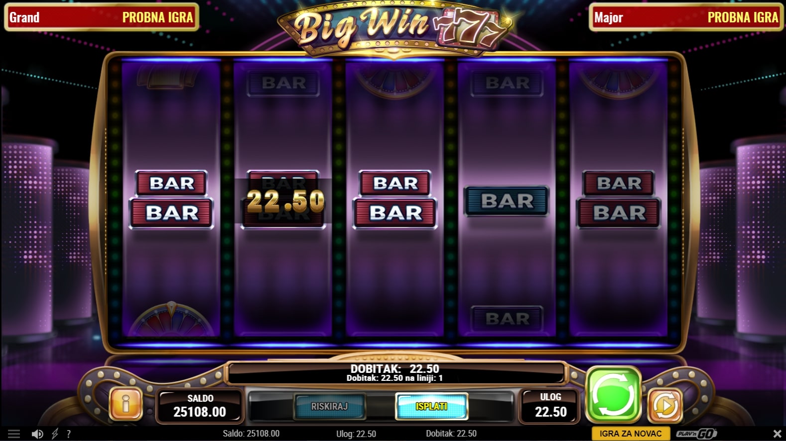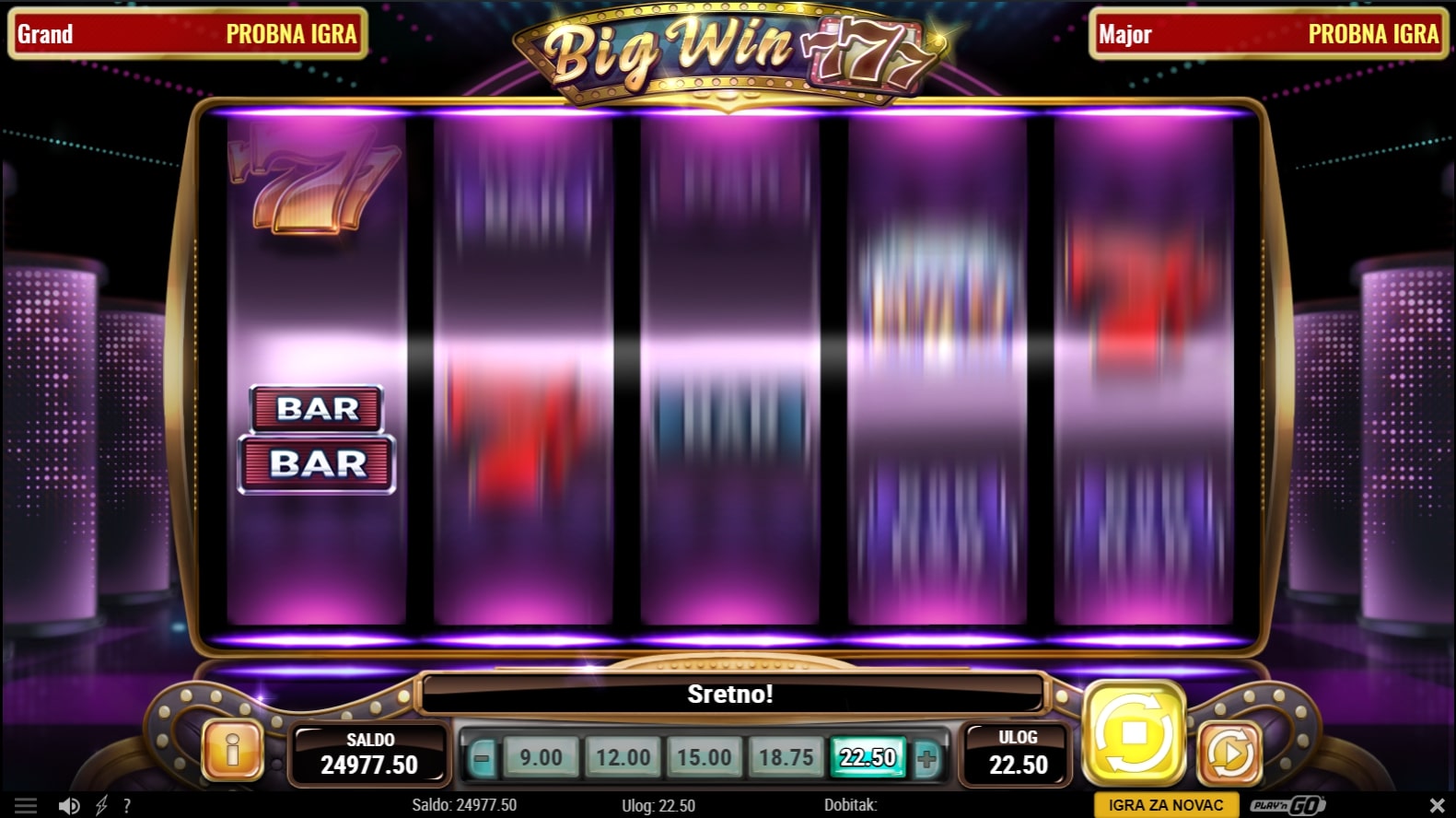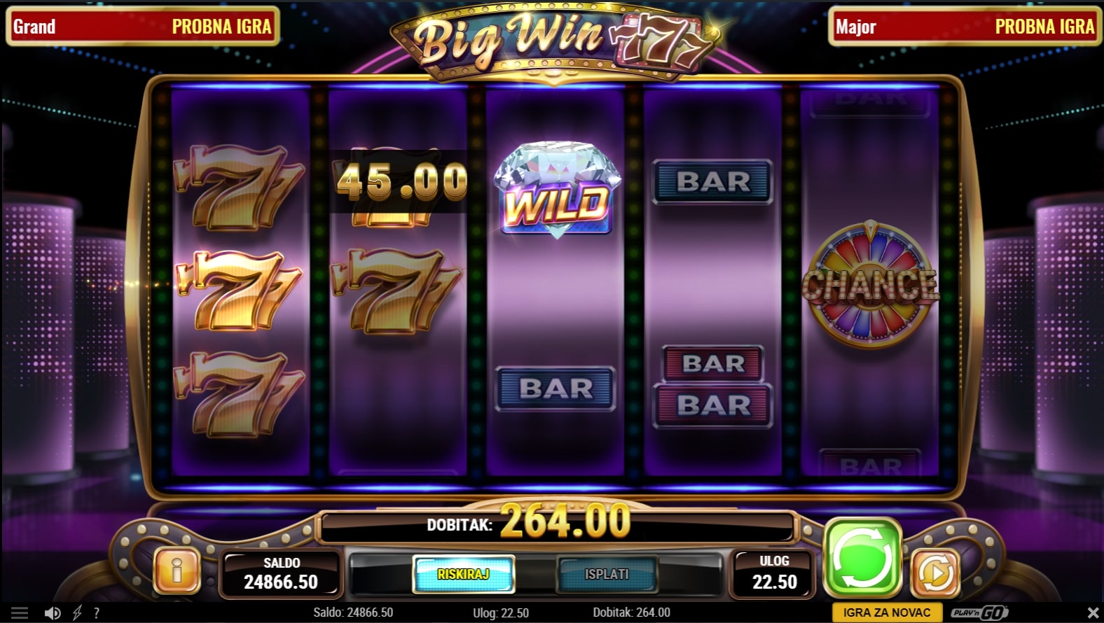 Big Win 777 slot je igra retro tematike koja vodi igrača u svijet sedmica i fantastičnih dobitaka. Očekivano, najviše isplaćuju simboli sedmica, dok igra uz to sadrži razne simbole poluga. U stvaranju dobitaka može pomoći simbol dijamanta koji mijenja druge simbole, a simboli kola sreće vode igrača do besplatnih vrtnji. U slučaju dobitka, igrač ga može 'poduplati' pogađanjem boje ili znaka karte okrenute licem prema dolje. Zaigraj Big Win 777 te osvoji vrhunske nagrade!