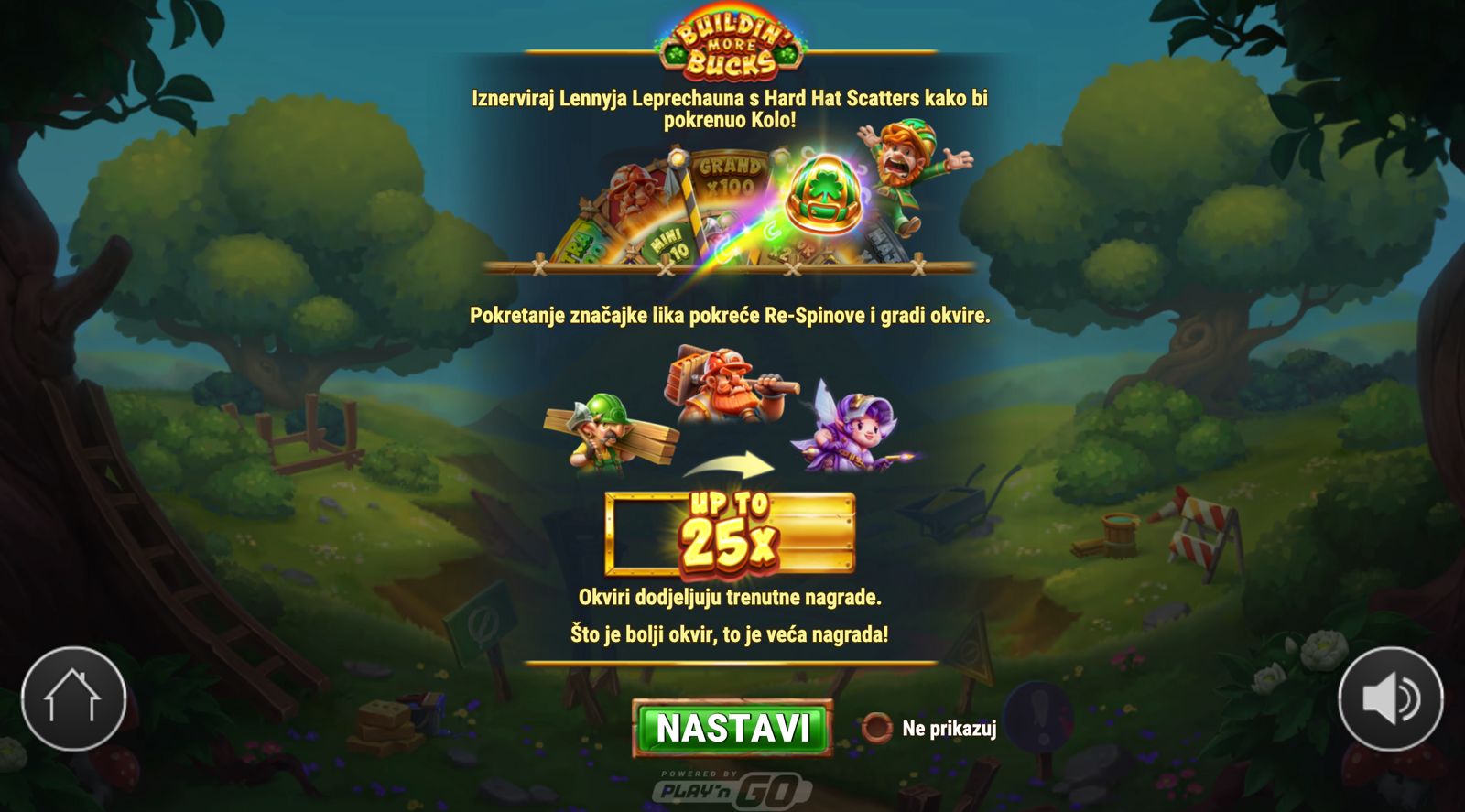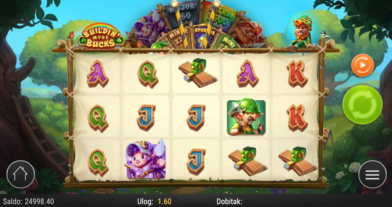Buildin’ More Bucks igra se na 5 rola, a cilj je složiti iste simbole na aktivnim linijama, počevši s lijeve strane. Simboli donose različite razine dobitaka, dok jednostavna pravila omogućuju brzo snalaženje i intuitivno igranje. Postavi željeni ulog, zavrti role i uživaj u uzbudljivom rastu dobitaka koji svaki spin može donijeti!