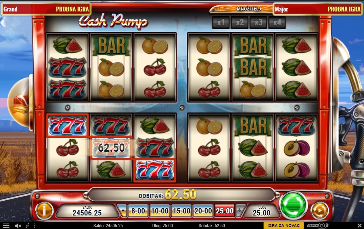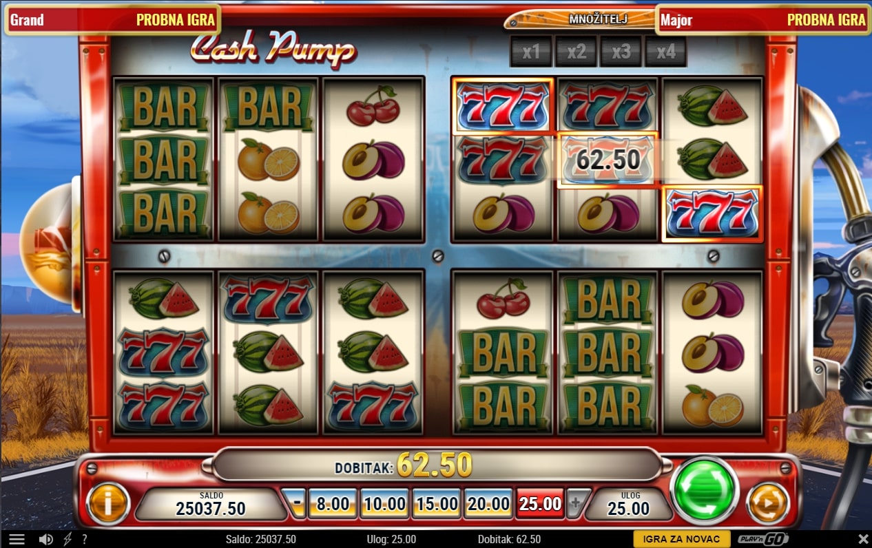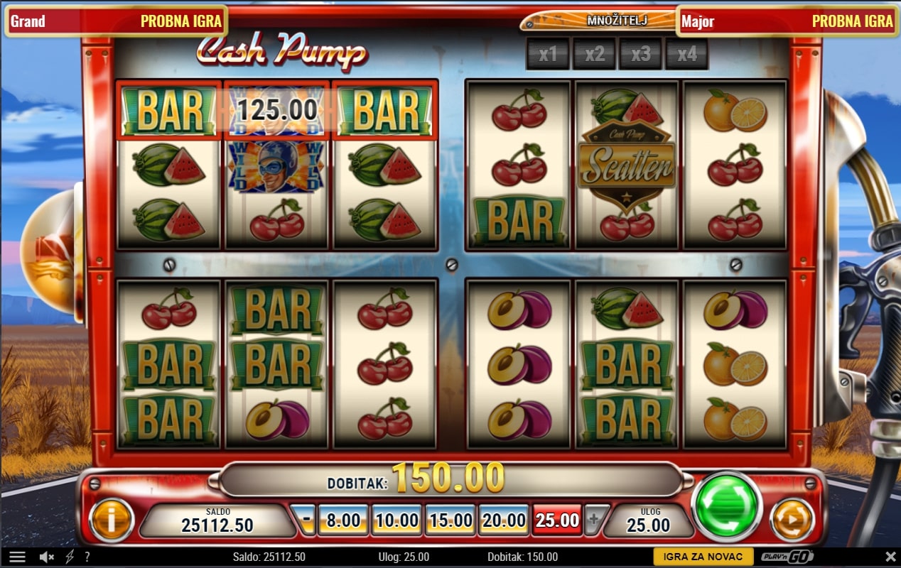 Cash Pump slot je igra koja vodi igrača niz američke pustinjske rute gdje cesta nema granica, a vrhunski dobici služe kao gorivo za ostatak turneje. Igra je posebno inovativna po tome što se paralelno vrte četiri igre gdje najviše isplaćuju simboli sedmica i poluga. Unutar igre nasumično se mogu pojaviti naslagani Wild simboli, a besplatne vrtnje osvajaju se slaganjem Scatter simbola. Zaigraj Cash Pump te osvoji fenomenalne nagrade!