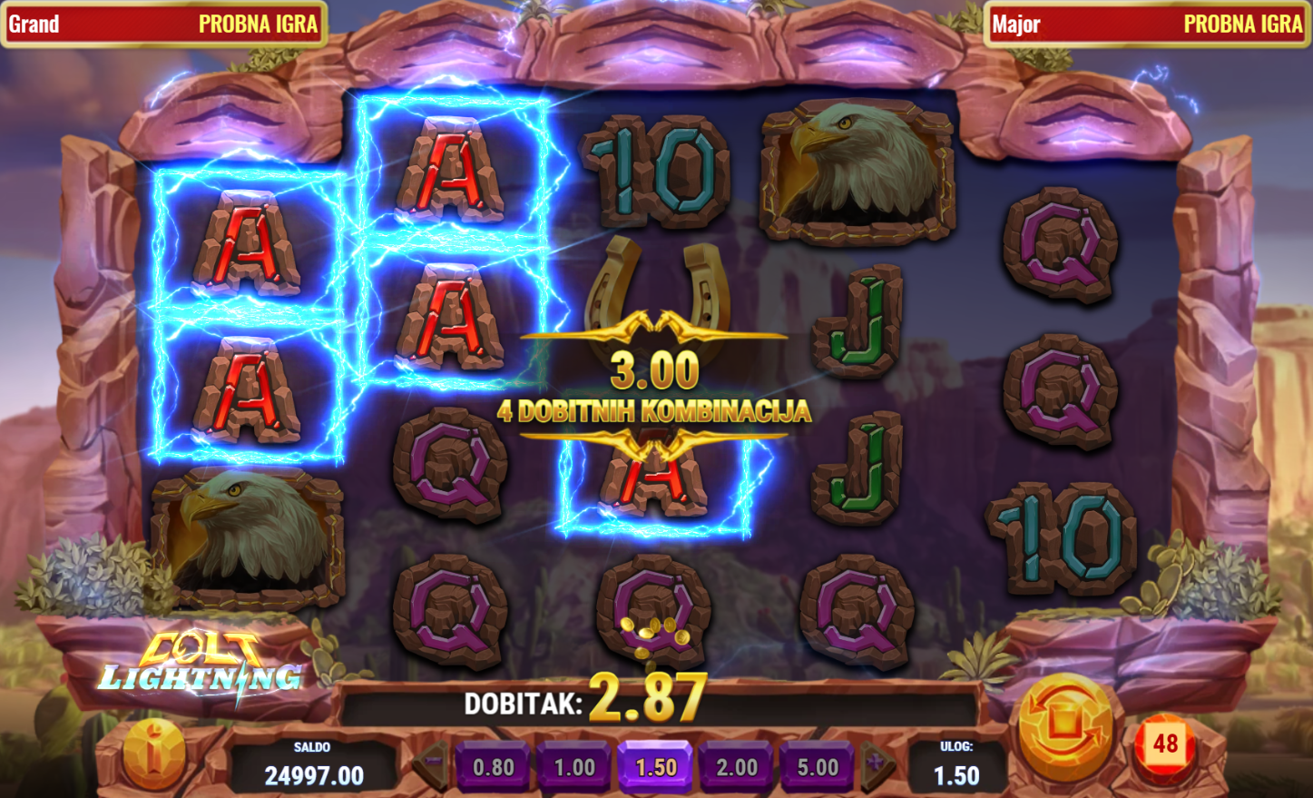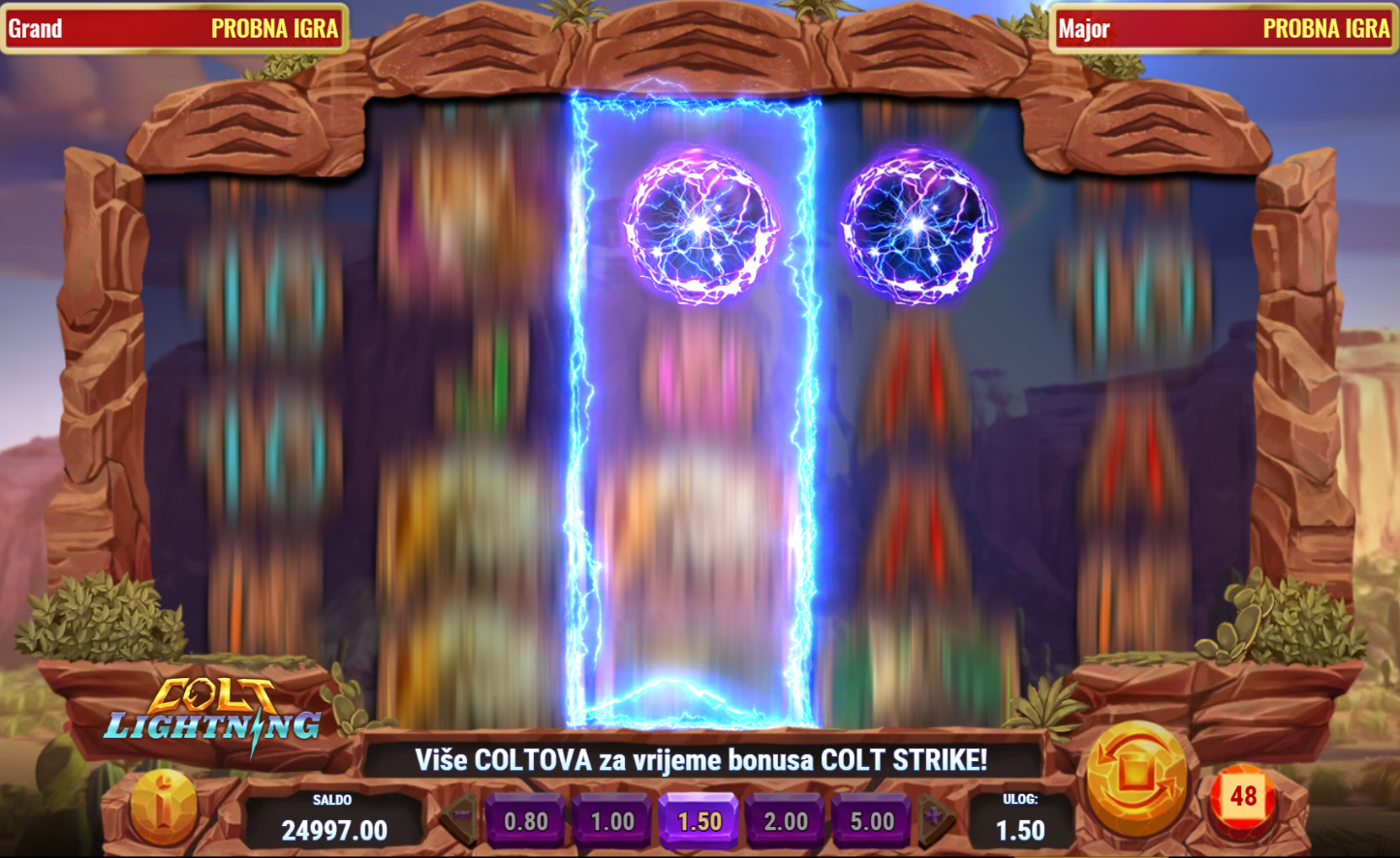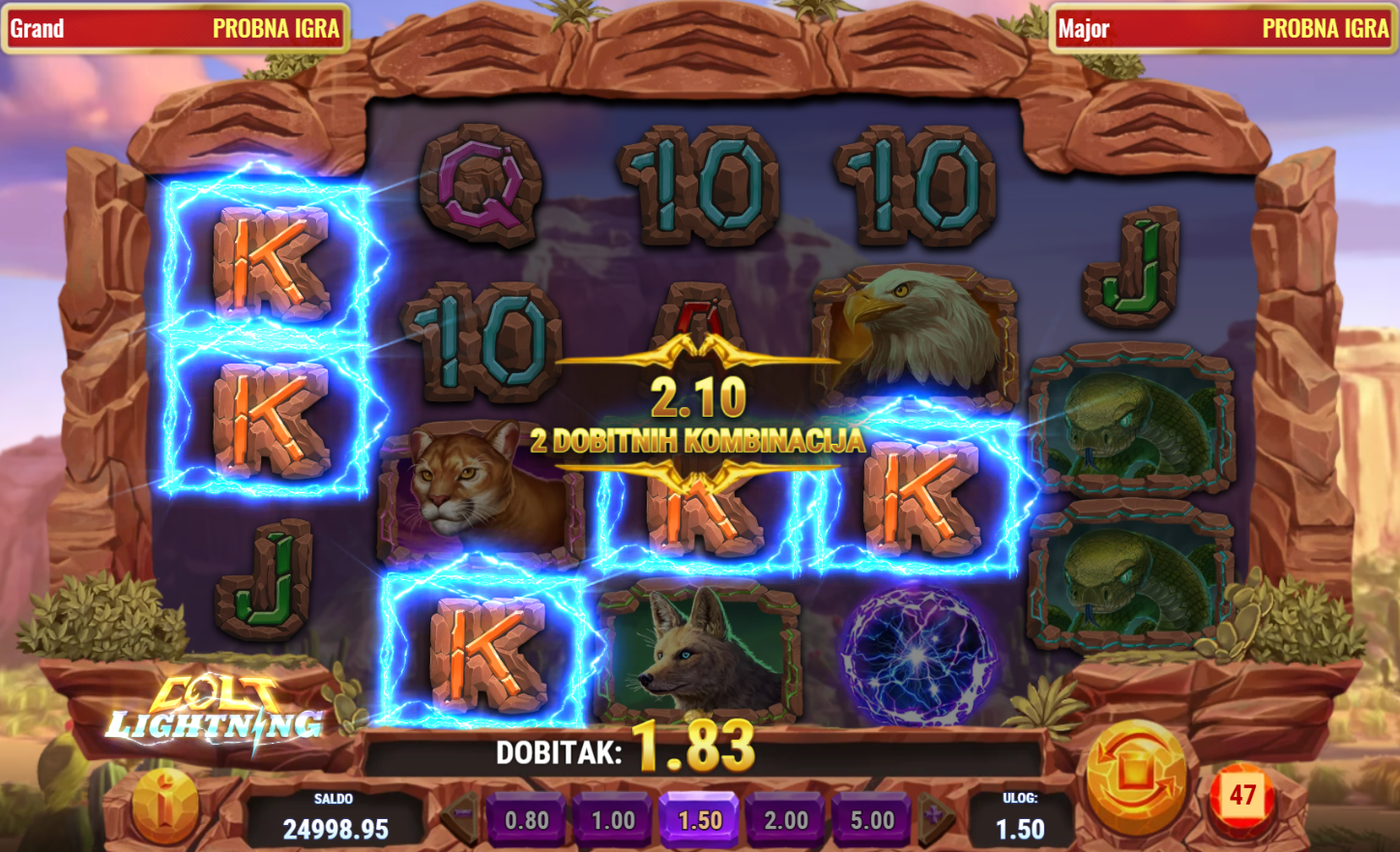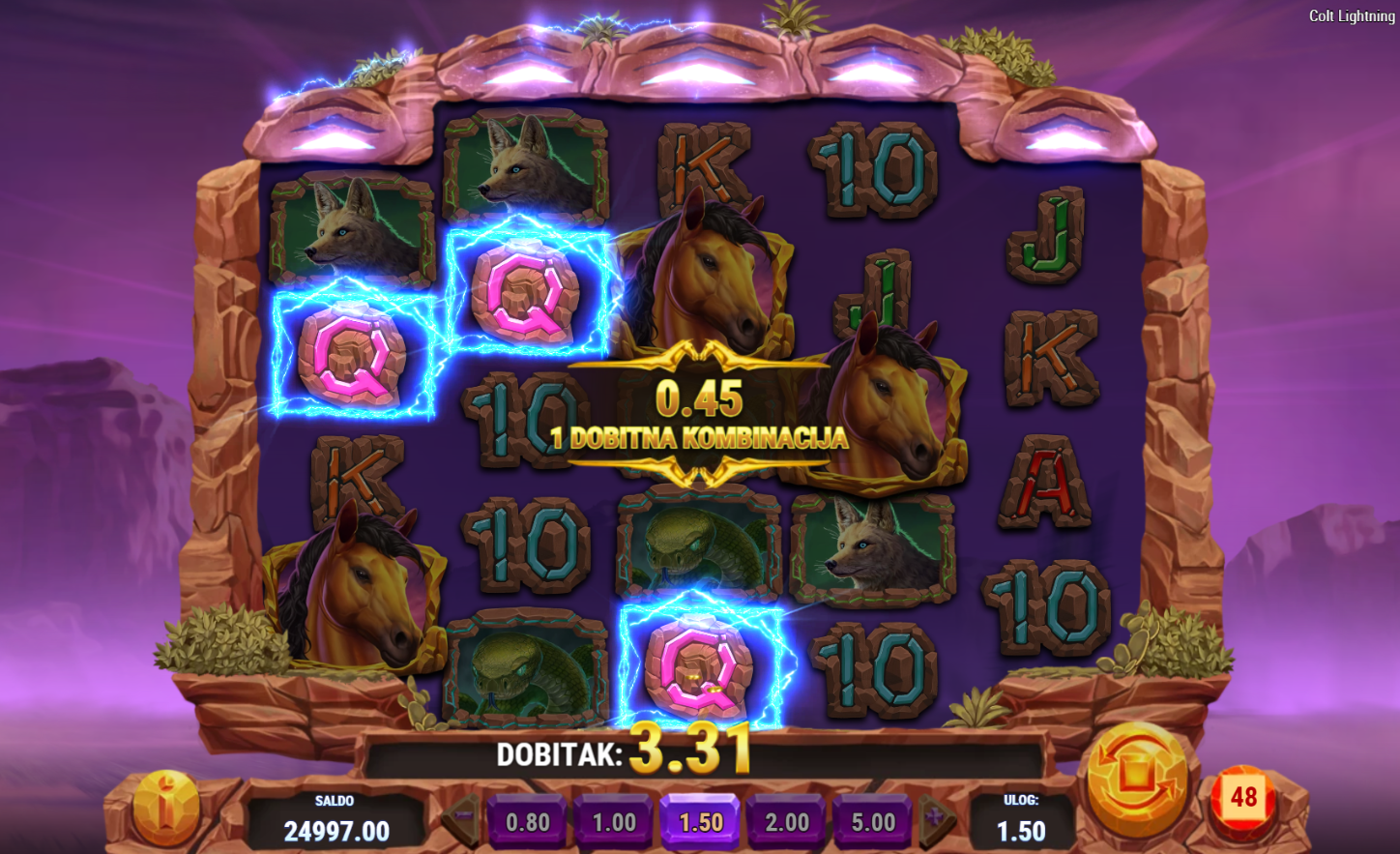 Colt Lightning donosi uzbudljivu akciju na pet rola uz mogućnost aktivacije do 12 348 potencijalnih dobitnih kombinacija. U ovoj igri, Wild simboli pomažu ti kreirati dobitne linije, dok bonus značajke poput Colt Strike i Rapid Re-Spin povećavaju tvoje šanse za veće nagrade. Kada aktiviraš besplatne vrtnje, simboli Coltova se pretvaraju u moćne Super Colt simbole koji udvostručuju tvoje dobitke. Uz dinamičan gameplay i rastuće role, Colt Lightning pruža neprekidno uzbuđenje na svakom koraku!