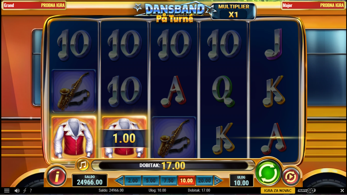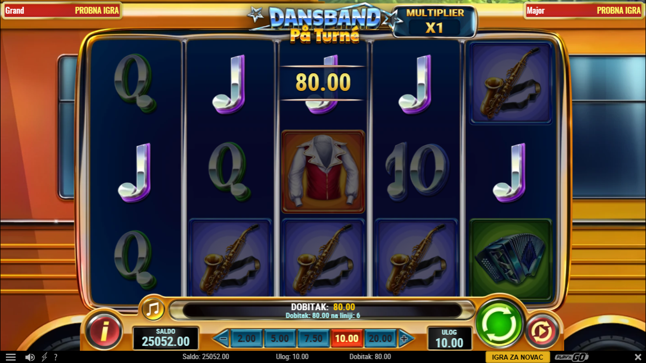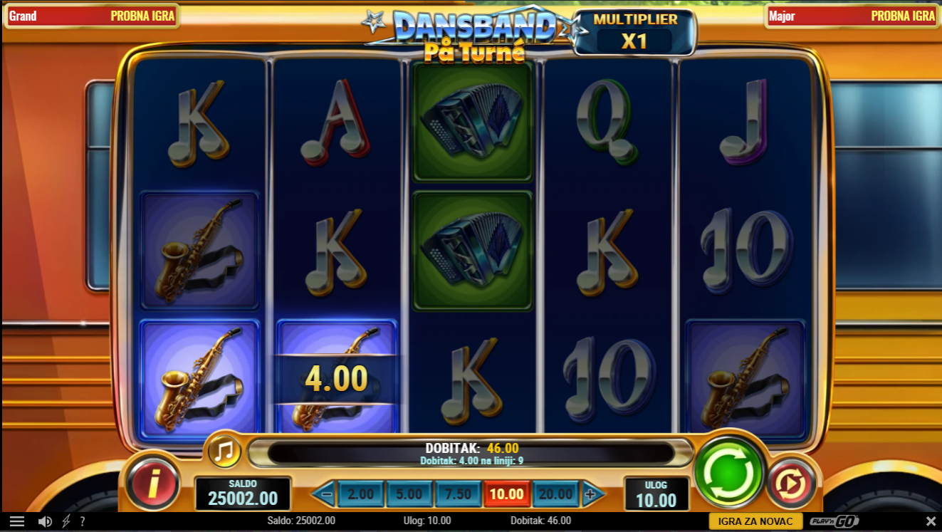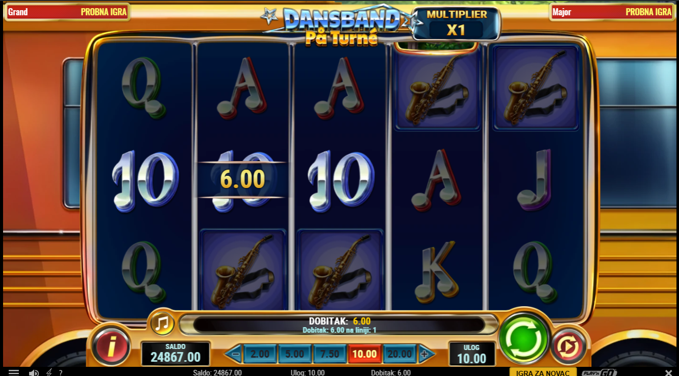 Dansband Pa Turne od Playn'Go donosi živopisno putovanje kroz svijet dance band spektakla, gdje svaki spin donosi ritam, boje i pravi koncertni ugođaj. Simboli su inspirirani glazbenim instrumentima, bendom i pozornicom, a sve je praćeno veselim vizualima koji stvaraju osjećaj da si dio turneje. Igra nudi kombinaciju opuštenog tempa i povremenih eksplozivnih značajki koje podižu atmosferu baš kao na pravom nastupu!