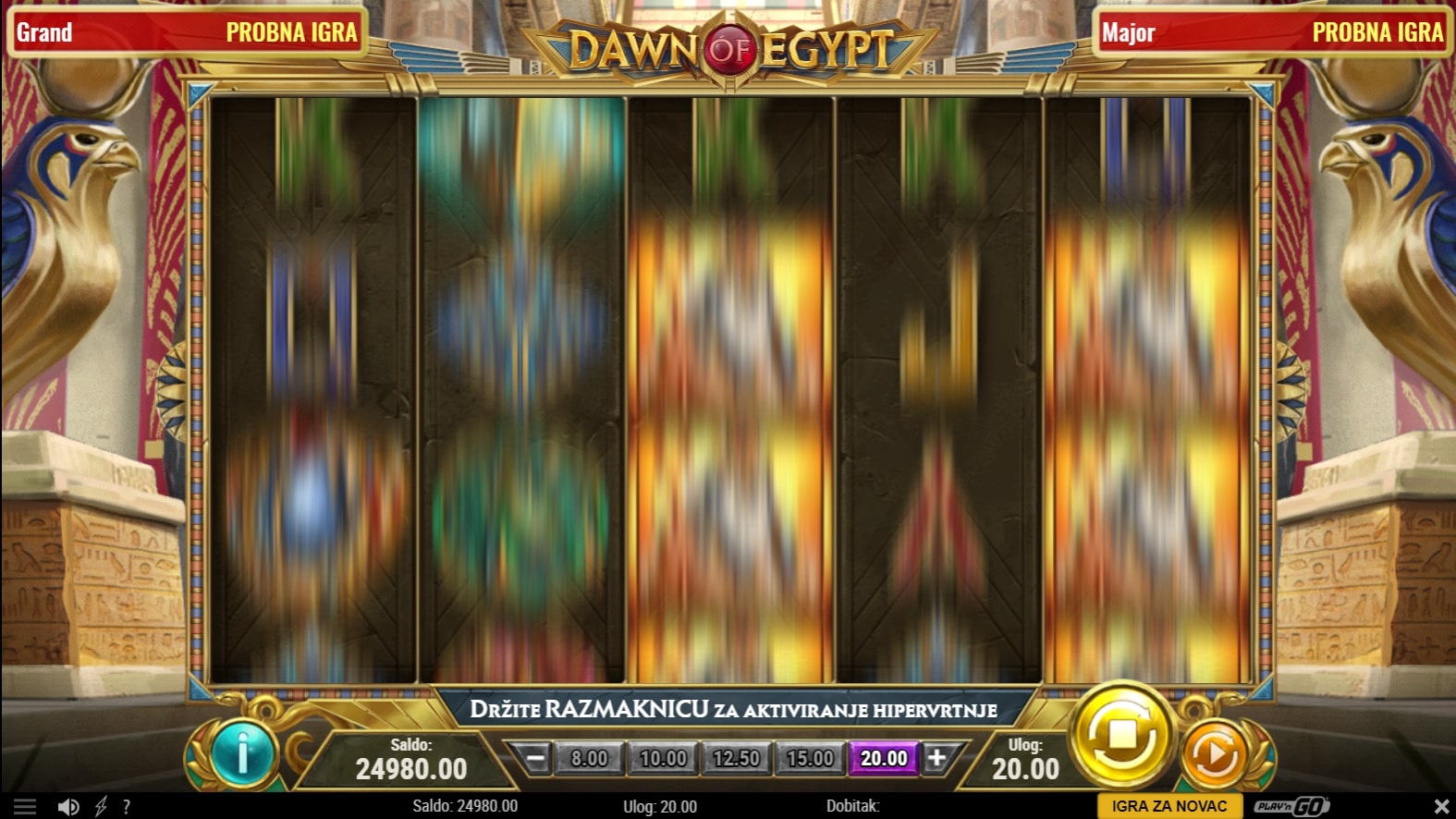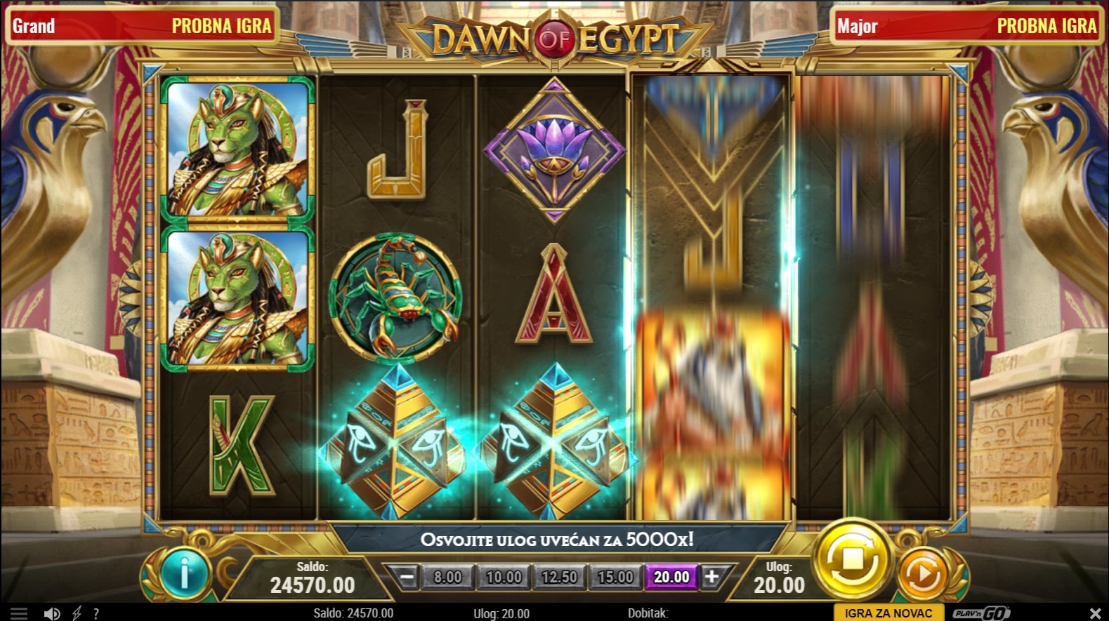 Dawn of Egypt slot je igra povijesne tematike koja vodi igrača u kolijevku civilizacije u lov na blaga drevnog Egipta. Simboli su inspirirani egipatskom mitologijom, a najviše isplaćuju oni s ilustracijama bogova. Uz to, skarabej simbol (kukac) može zamijeniti druge simbole u potrazi za dobicima, dok simbol piramide služi kao ulaznica za Kolo bogova koje igrača vodi u obećanu zemlju besplatnih vrtnji. Zaigraj Dawn of Egypt te osvoji legendarne dobitke!