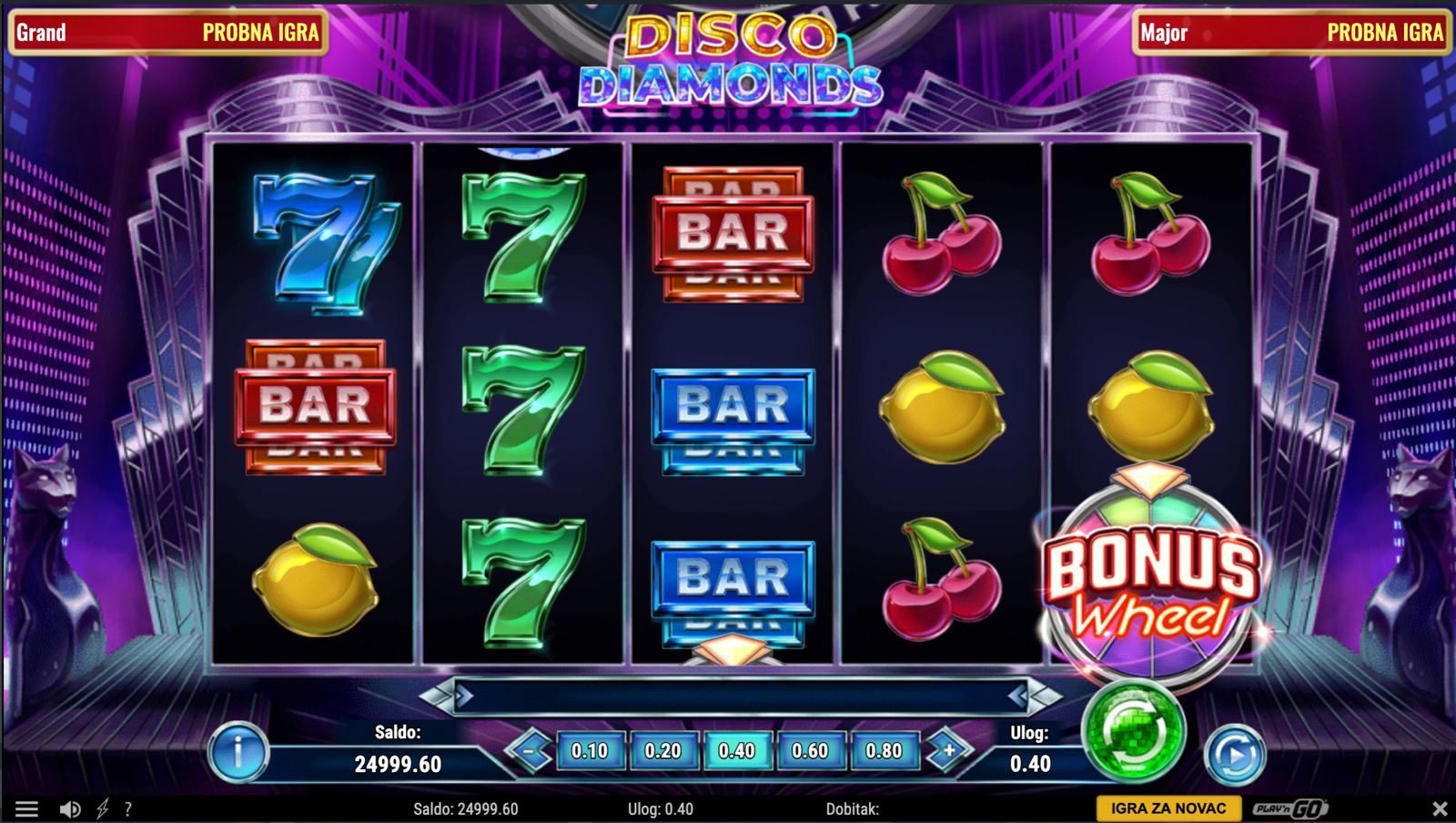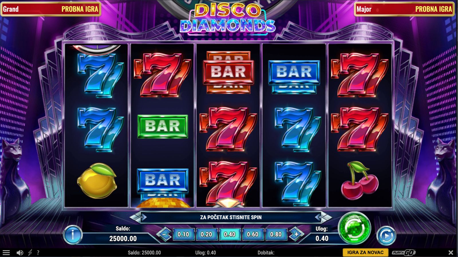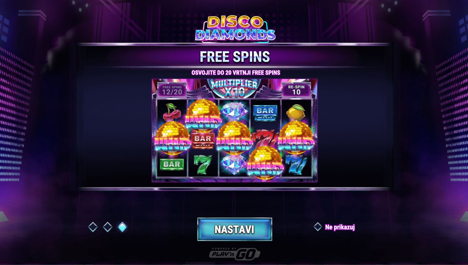 Disco Diamonds je slot igra proizvođača Play’n GO koja donosi sjajnu disco atmosferu i zabavu na pet koluta i tri reda. Umjesto klasičnih linija, koristi 243 načina za dobitak, a simboli uključuju voće, BAR simbole, sedmice i dijamante. Glavni element igre su disco kugle koje djeluju kao wild simboli, dok posebne zlatne kugle pokreću dodatne značajke. Cijela igra je obogaćena energičnom glazbom i vizualnim efektima koji podsjećaju na plesne podije 70-ih.