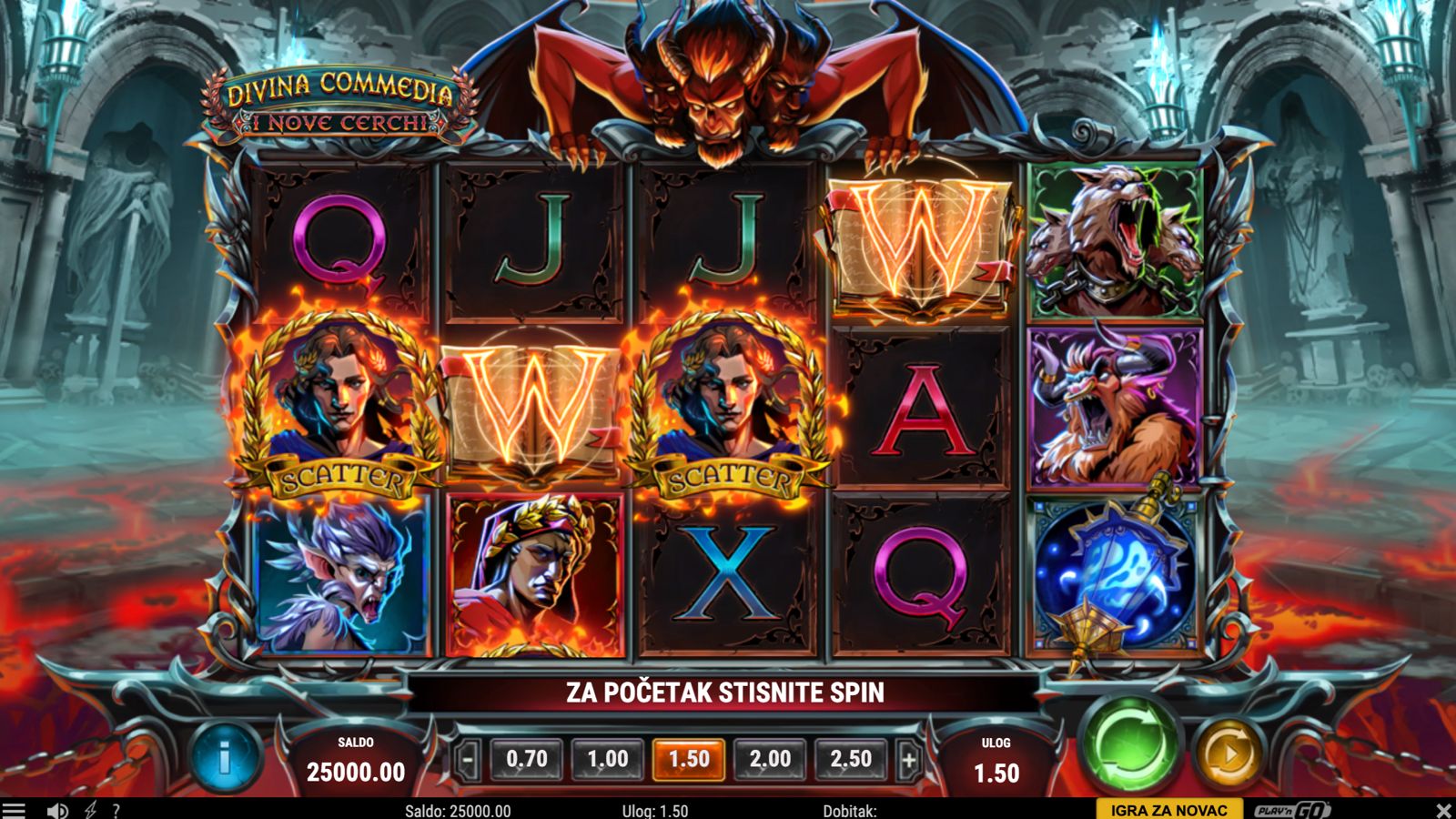 Divina Commedia I Nove Cerchi igra se na 5 rola, a cilj je složiti iste simbole na aktivnim linijama počevši s lijeve strane kako bi se ostvarili dobitci. Simboli inspirirani poetikom i motivima devet krugova pakla donose razne razine nagrada, dok jednostavna pravila omogućuju brzo i intuitivno igranje. Postavi željeni ulog, zavrti role i prepusti se epskoj avanturi kroz mistične sfere!