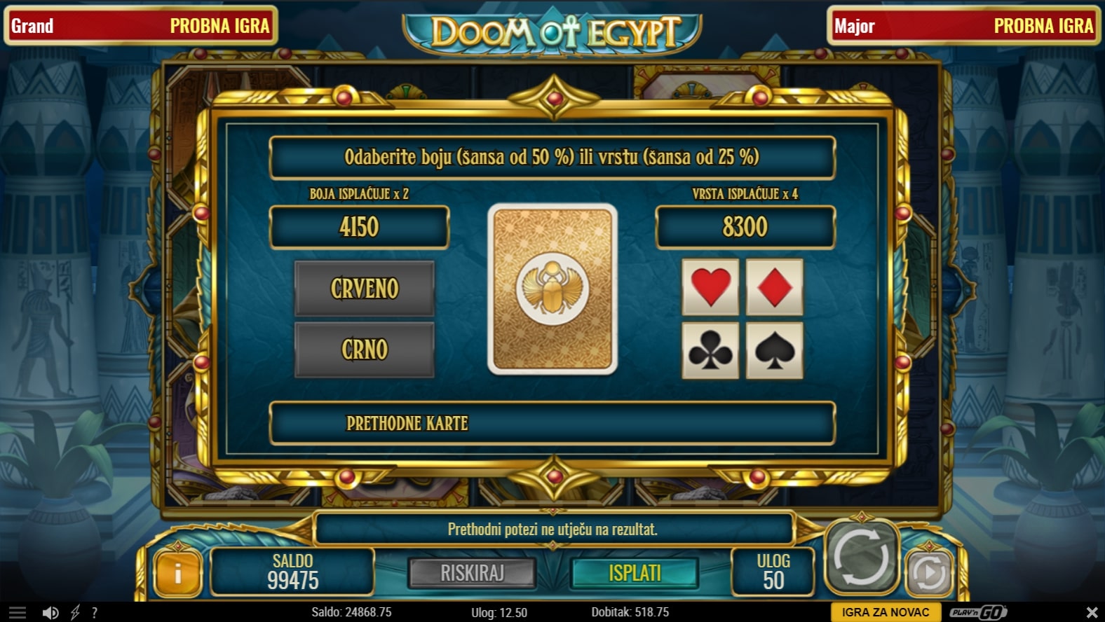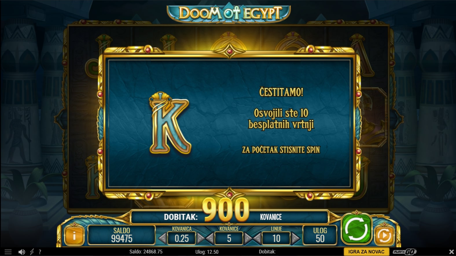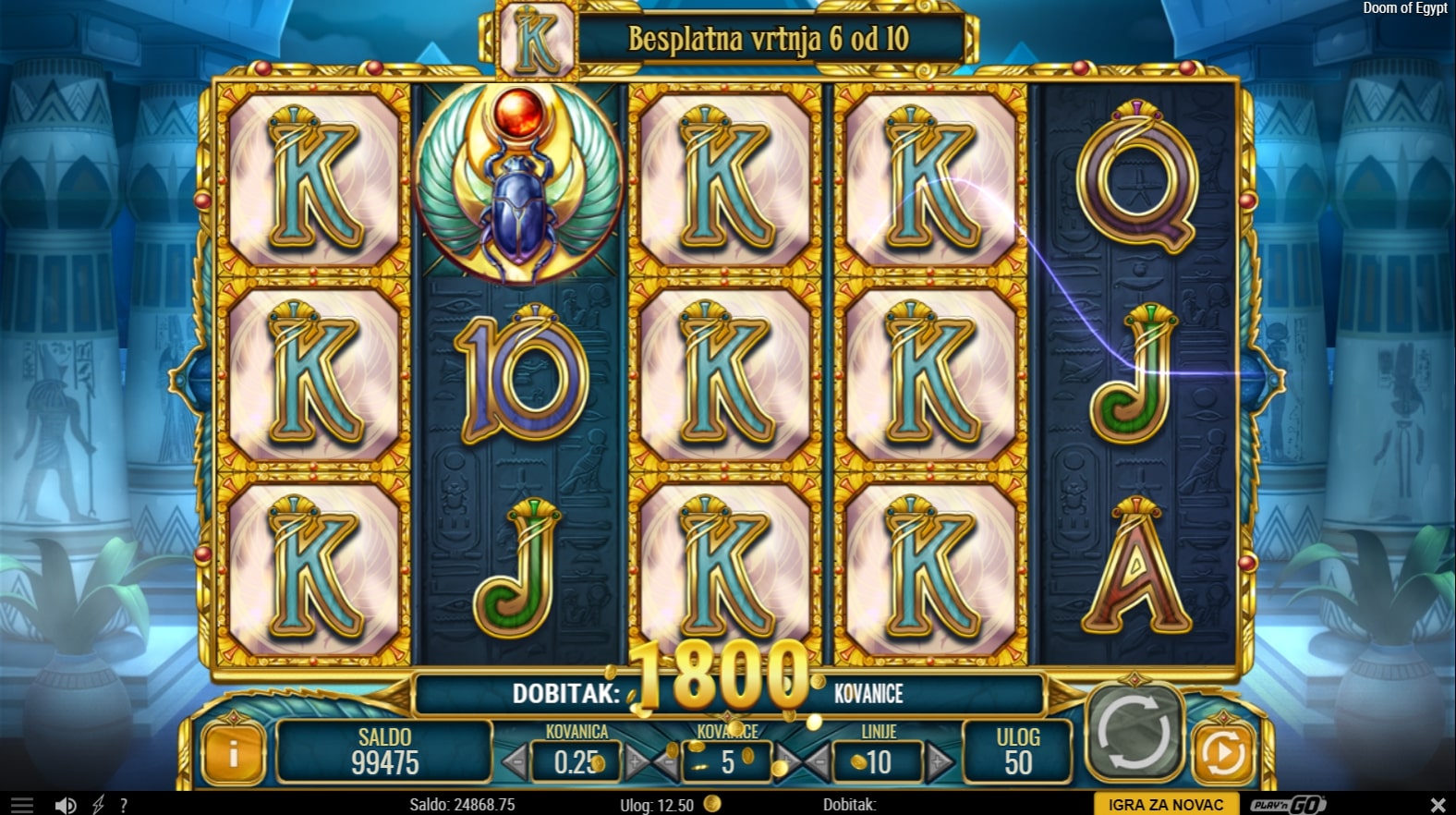 Doom of Egypt slot je igra povijesne tematike koja igrača vodi u kolijevku civilizacije u potragu za epskim dobicima. Najviše isplaćuju simboli raznih egipatskih bogova, dok je simbol skarabeja alfa i omega igre. On ne samo da mijenja druge simbole u potrazi za dobicima, već uz to nizanjem može aktivirati besplatne vrtnje. U slučaju dobitka, igrač ga može udvostručiti pogađanjem boje ili znaka karte okrenute licem prema dolje. Zaigraj Doom of Egypt te osvoji tajanstvene nagrade!