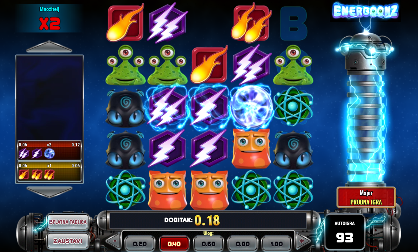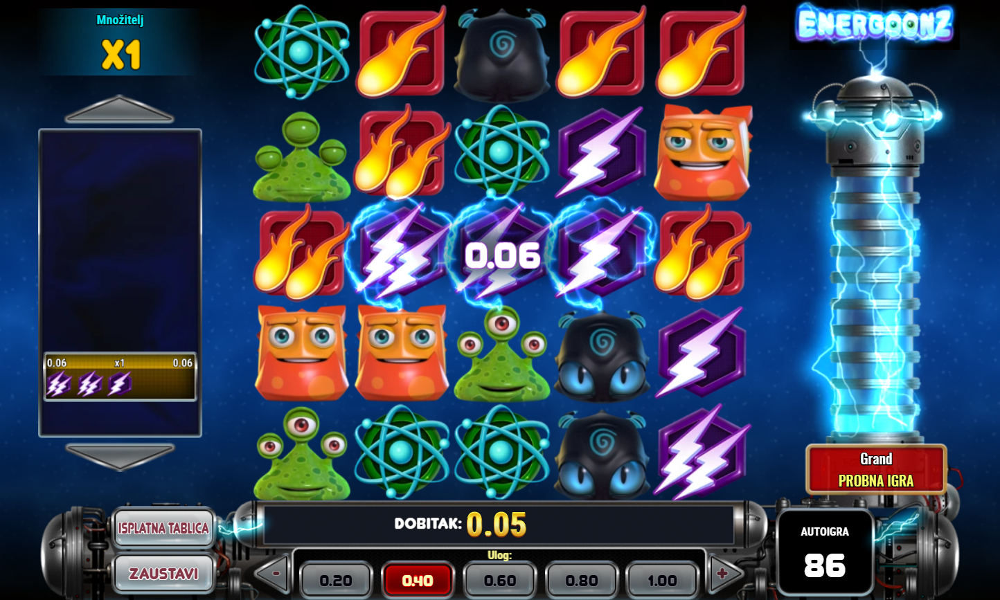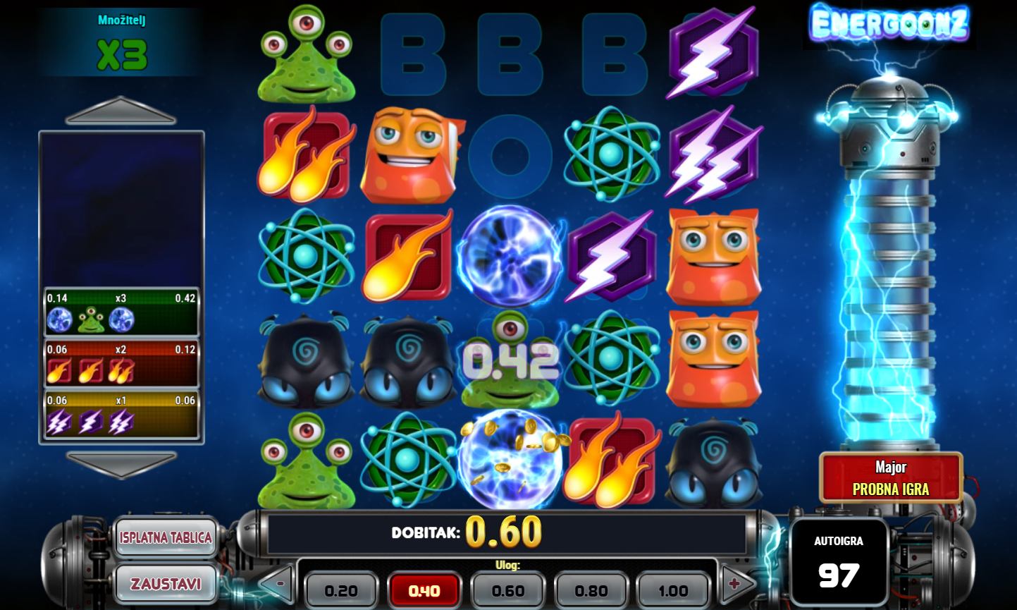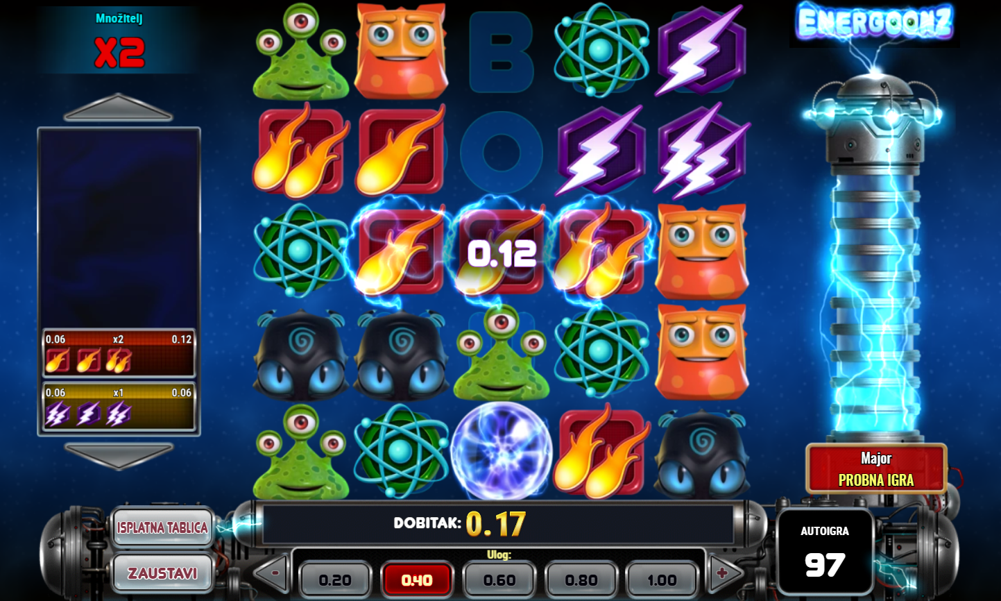 U igri Energoonz, istražit ćeš svijet pun energije, šarenih simbola i uzbudljivih mogućnosti za dobitak. Ovaj videoautomat s 5x5 pločom nudi inovativan gameplay gdje simboli padaju i formiraju dobitne kombinacije u nizu. Uz mogućnost osvajanja nagrada pomoću zamjenskih simbola, mnoštvo bonus rundi i specijalnih nagrada čeka samo tebe. Energoonz je savršena igra za one koji traže dinamičnu akciju i priliku za velike dobitke. Isprobaj Energoonz i pusti simbole da te odvedu do nevjerojatnih nagrada!