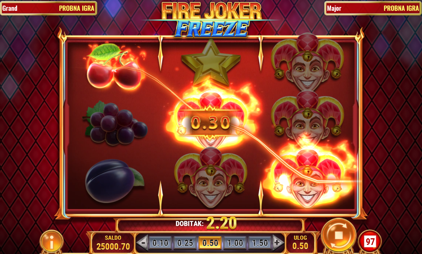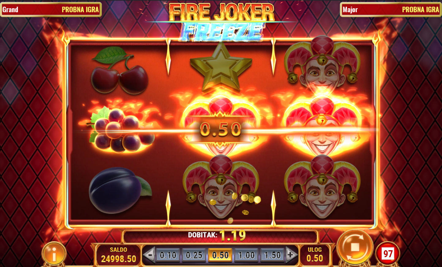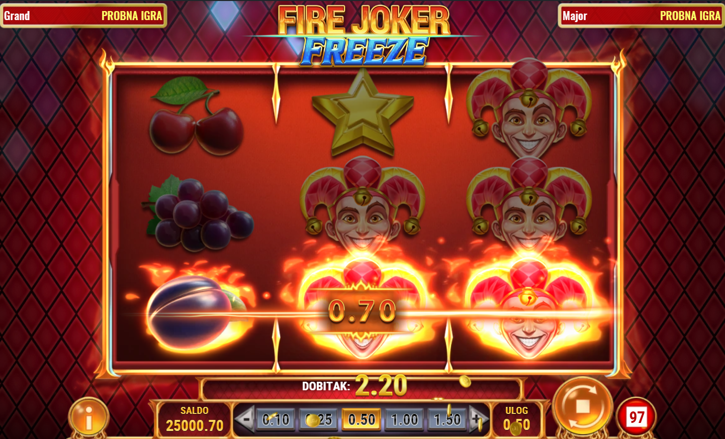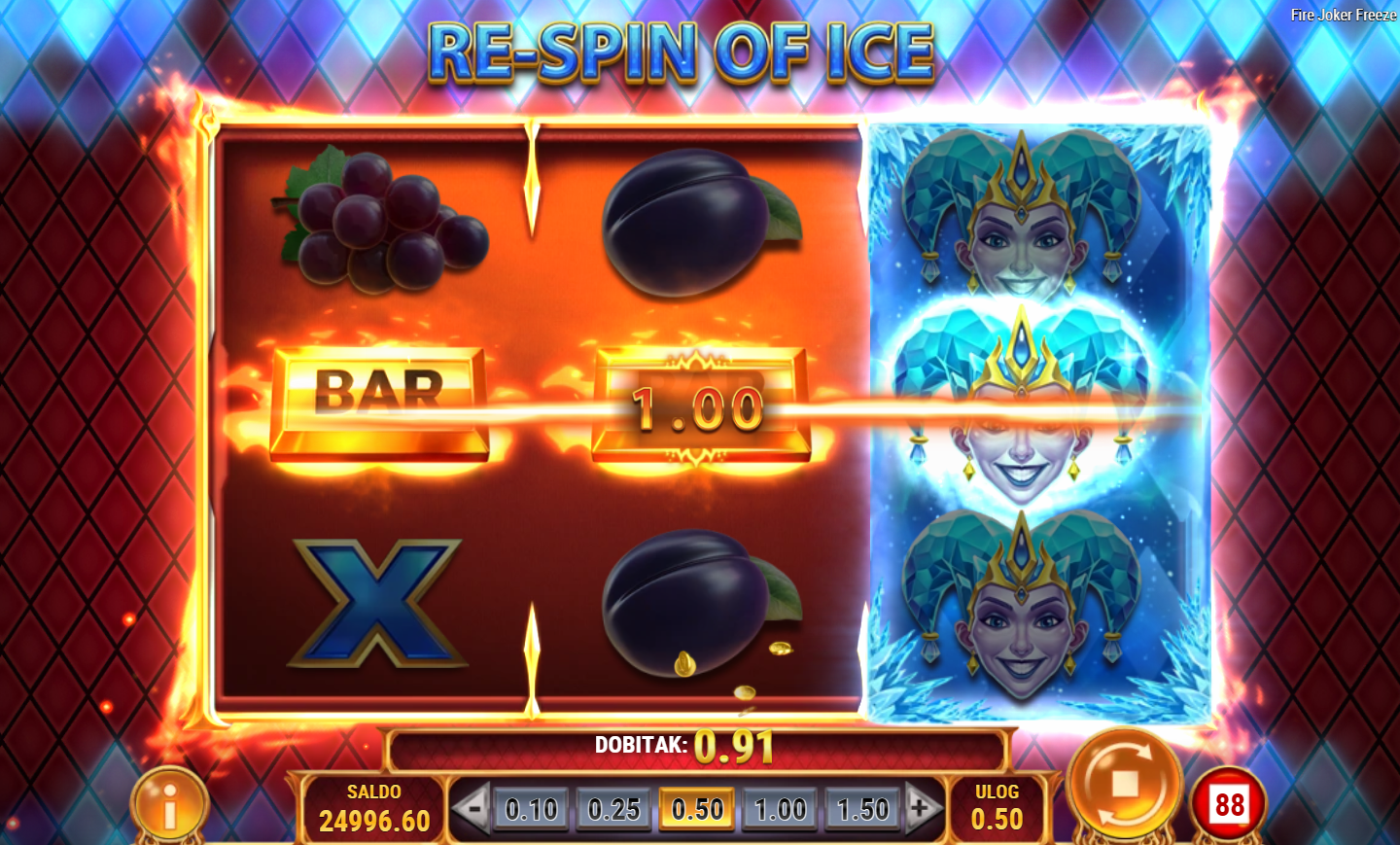 Fire Joker Freeze se igra na 3 role s 5 dobitnih linija. Tijekom igre, cilj ti je složiti dobitne kombinacije simbola s lijeva nadesno. U slučaju vrtnje bez dobitka, mogu se aktivirati Re-Spin of Ice ili Re-Spin of Fire, pružajući ti drugu šansu za dobitak. Ako su sve role ispunjene istim simbolima, aktivira se Wheel of fire and ice, gdje se možeš okušati u osvajanju multiplikatora. Kolo počinje s najnižim multiplikatorima, ali imaš šansu napredovati do većih dobitaka kako kolo napreduje.
