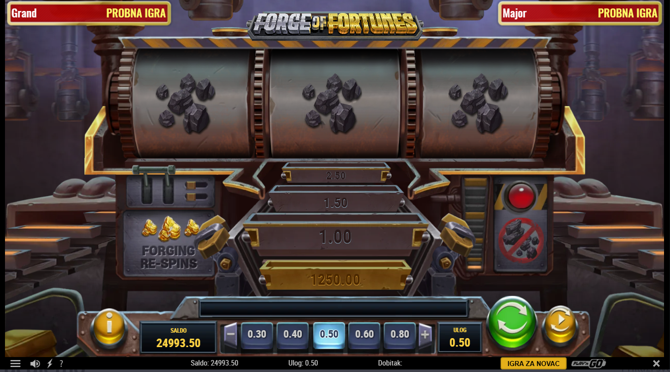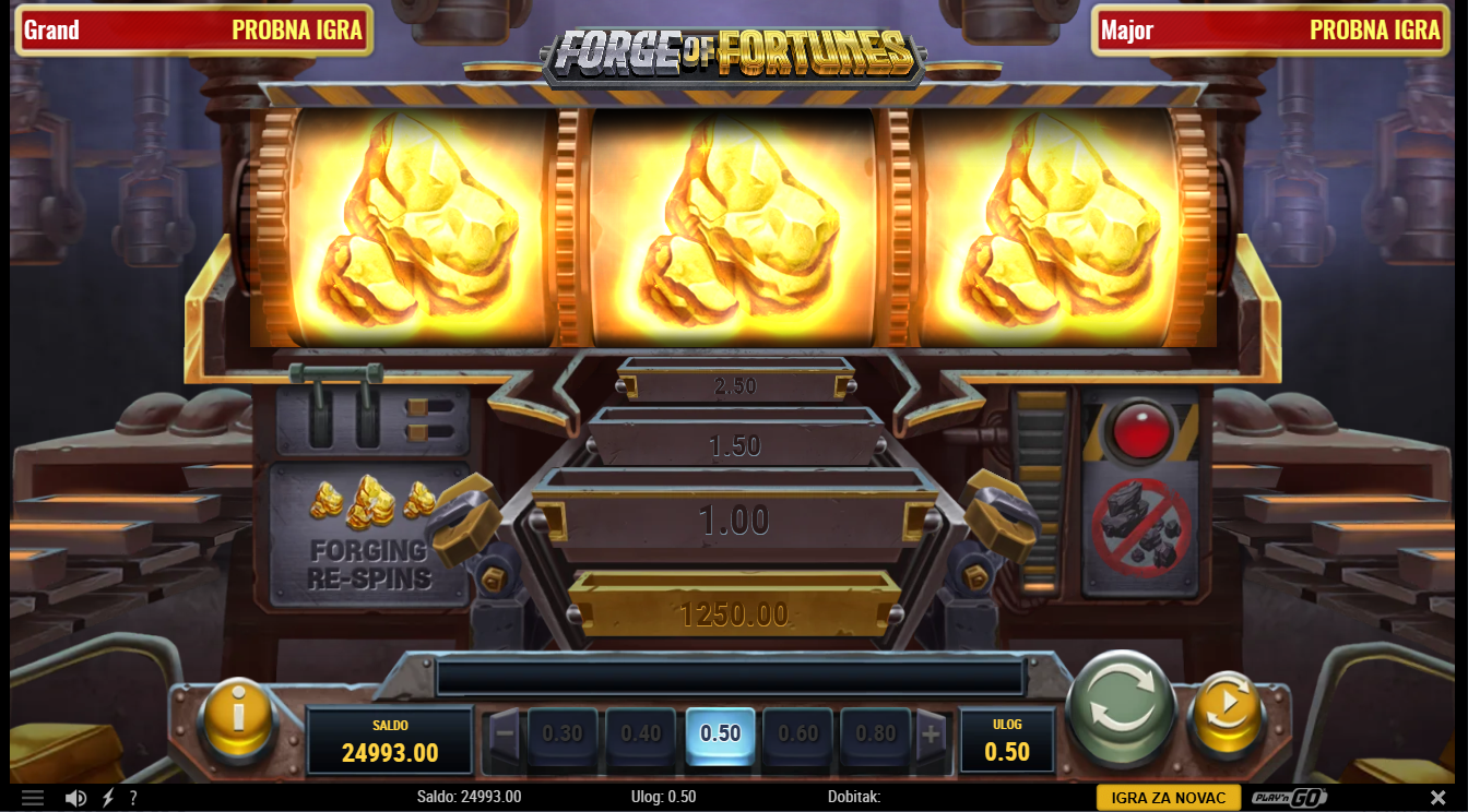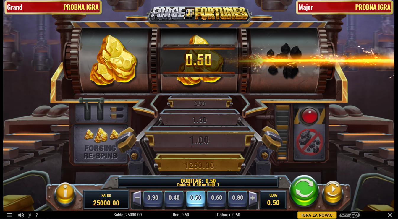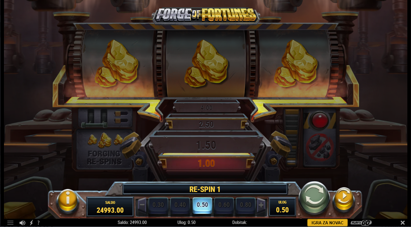 Odaberi ulog i nadaj se da će se pojaviti tri zlatna nuggeta jer tada se pokreće značajka Forging Respins, gdje kontinuirani respinovi pojačavaju multiplikatore dok se zlato slaže, ali ugljen vraća multiplikator unatrag, a slag prekida rundu. Svaki novi zlatni naboj nosi potencijalno sve veći dobitak dok traje serija respinova.