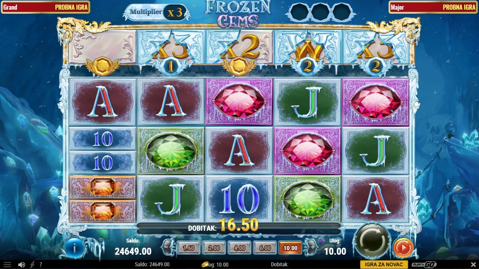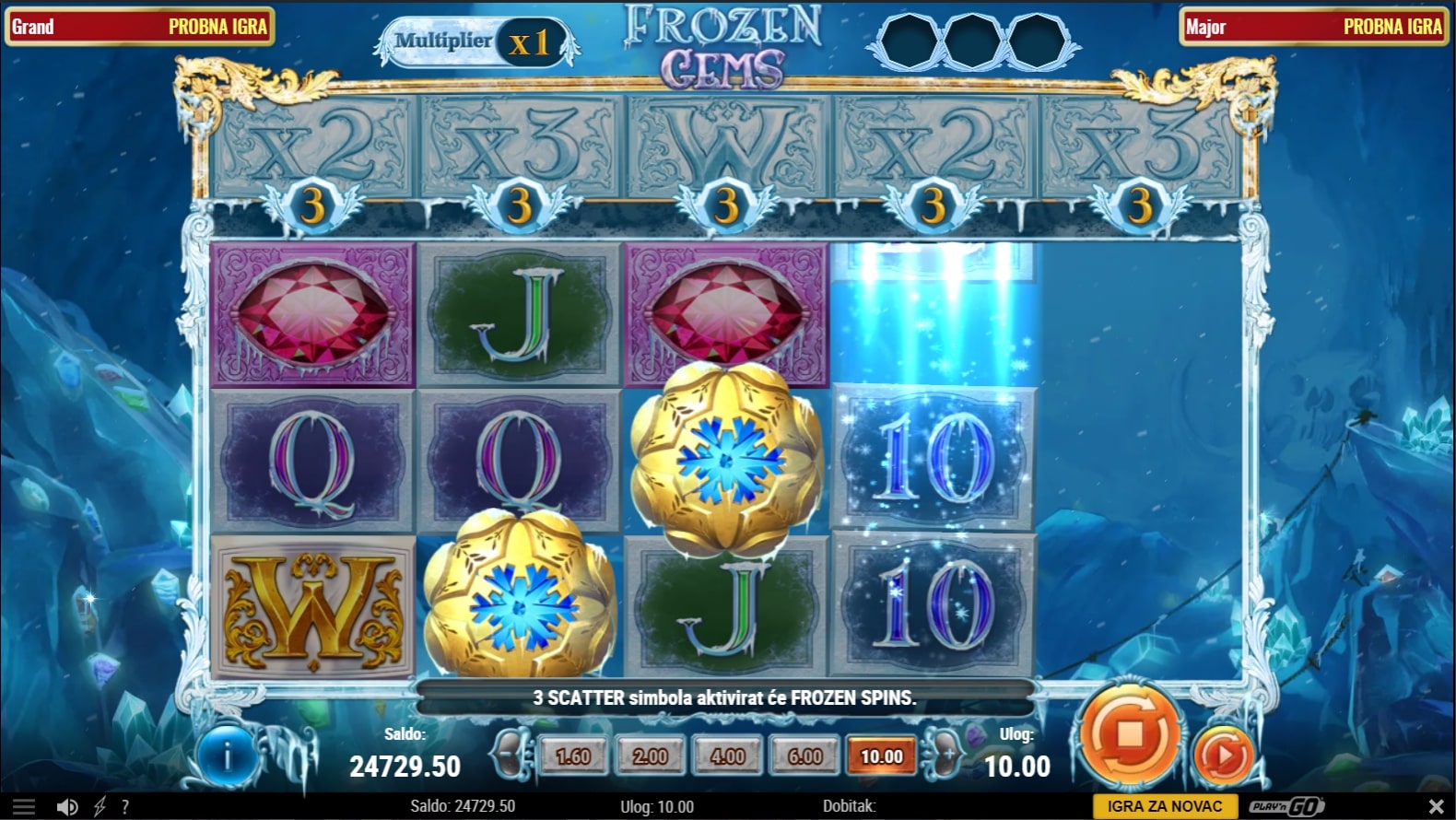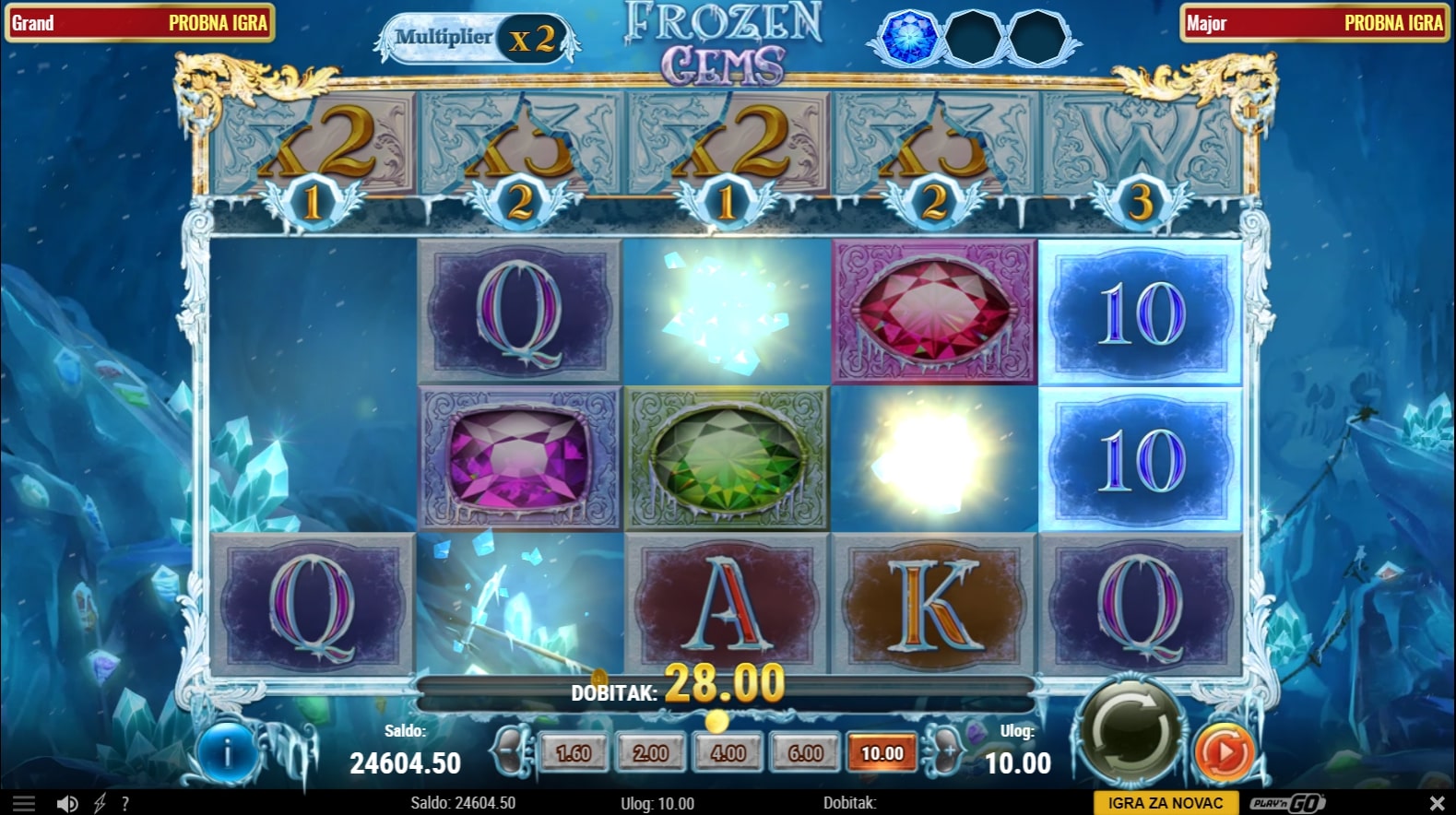 Frozen Gems slot je igra koja miješa svijet dragulja sa svijetom vječnog snijega i leda. Najviše isplaćuje razno drago kamenje, dok igra uz to sadrži posebne simbole koji će igraču pomoći na putu ka vrhunskim dobicima. Tako simbol 'W' može zamijeniti druge simbol, a simbol zlatne kugle s pahuljicom aktivira iznimno isplative ledene vrtnje. Zaigraj Frozen Gems te osvoji vrhunske nagrade!