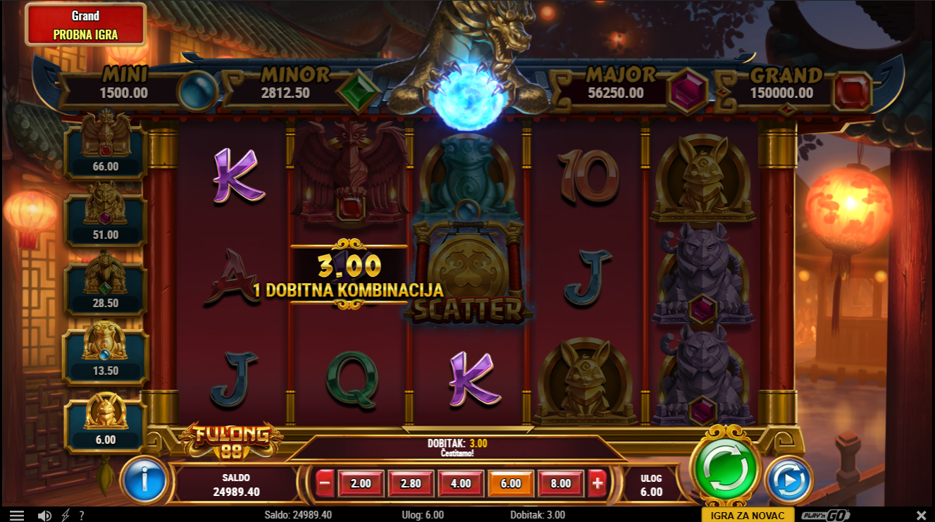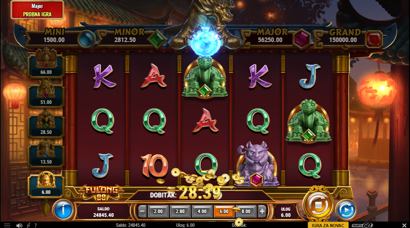 Fulong 88 od Playn'Go otvara vrata u svijet istočnjačke simbolike, zlatnih zmajeva i tradicionalnih znakova sreće koji stvaraju jedinstvenu atmosferu. Igra odiše luksuzom, bogatim crvenim i zlatnim tonovima te glatkim animacijama koje naglašavaju svaku vrtnju! Ključni elementi inspirirani su kineskom kulturo, što stvara elegantan, mističan i vrlo privlačan vizualan identitet. Poseban naglasak stavljen je na zmaja, koji se pojavljuje kao moćan simbol i donosi najnapetije trenutke.