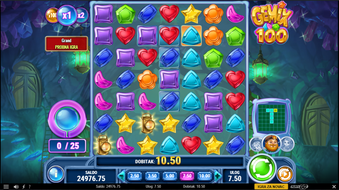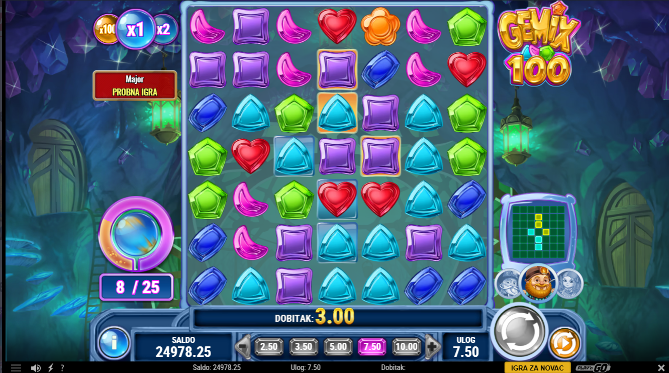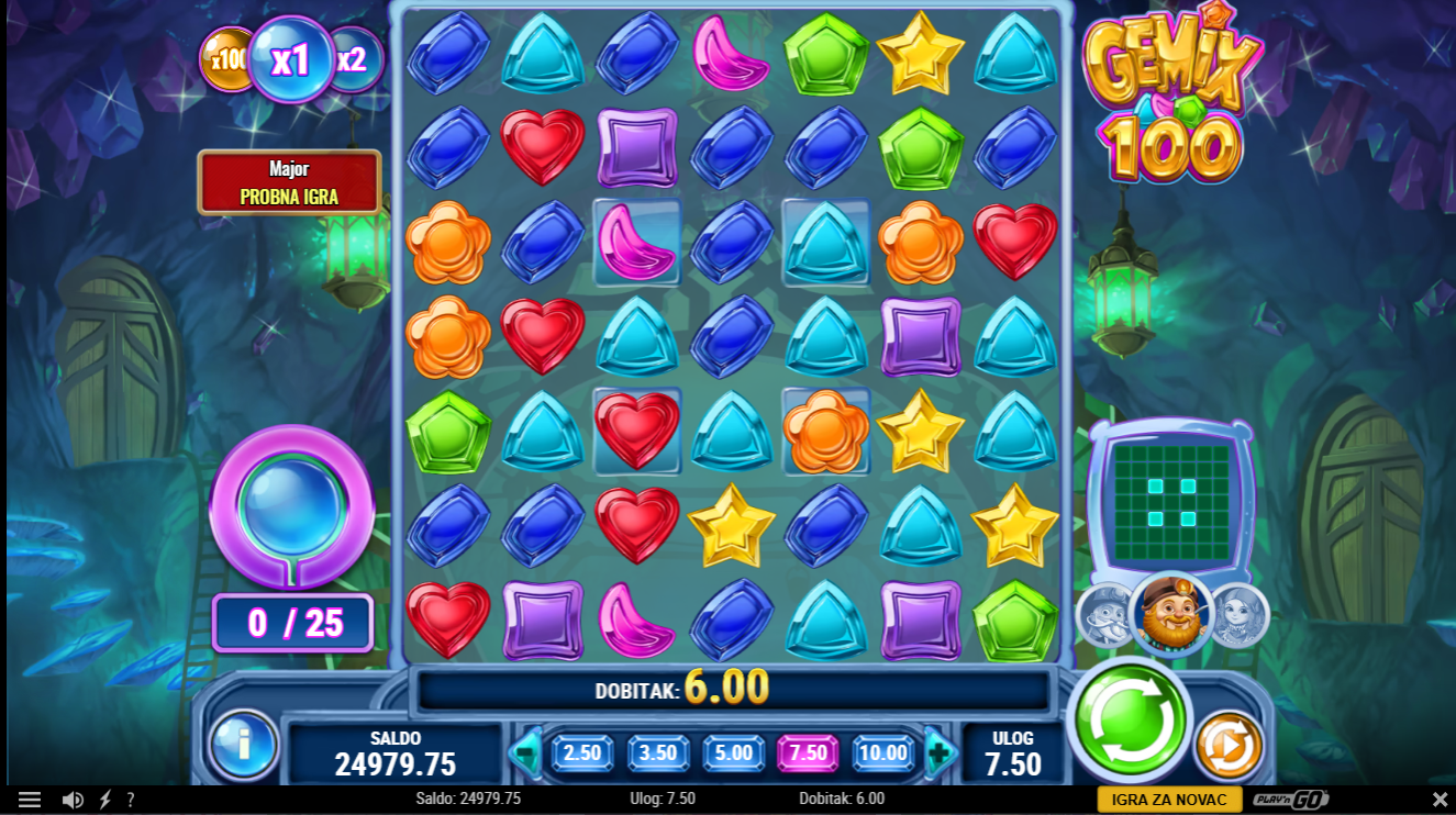 Gemix 100 od Playn'Go donosi energiju i čaroliju jednog od najpoznatijih hitova Playn'Go. Igra te vodi kroz tri prekrasna svijeta, od bajkovitih kraljevstava do mističnih kristalnih pejzaža, svaki sa svojim čuvarom. Vizuali su znatno unaprijeđeni, boje su jače, efekti snažniji, a svaka eksplozija simbola izgleda poput malog svjetlosnog spektakla. Kaskadni sustav omogućuje stalnu dinamiku jer se nakon svakog uklonjenog seta simbola otvaraju nove mogućnosti. Moćni čuvari mogu se nasumično pojaviti i aktivirati svoje posebne sposobnosti.