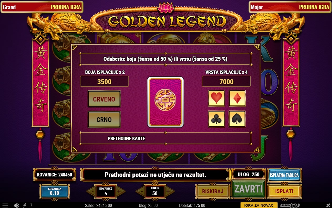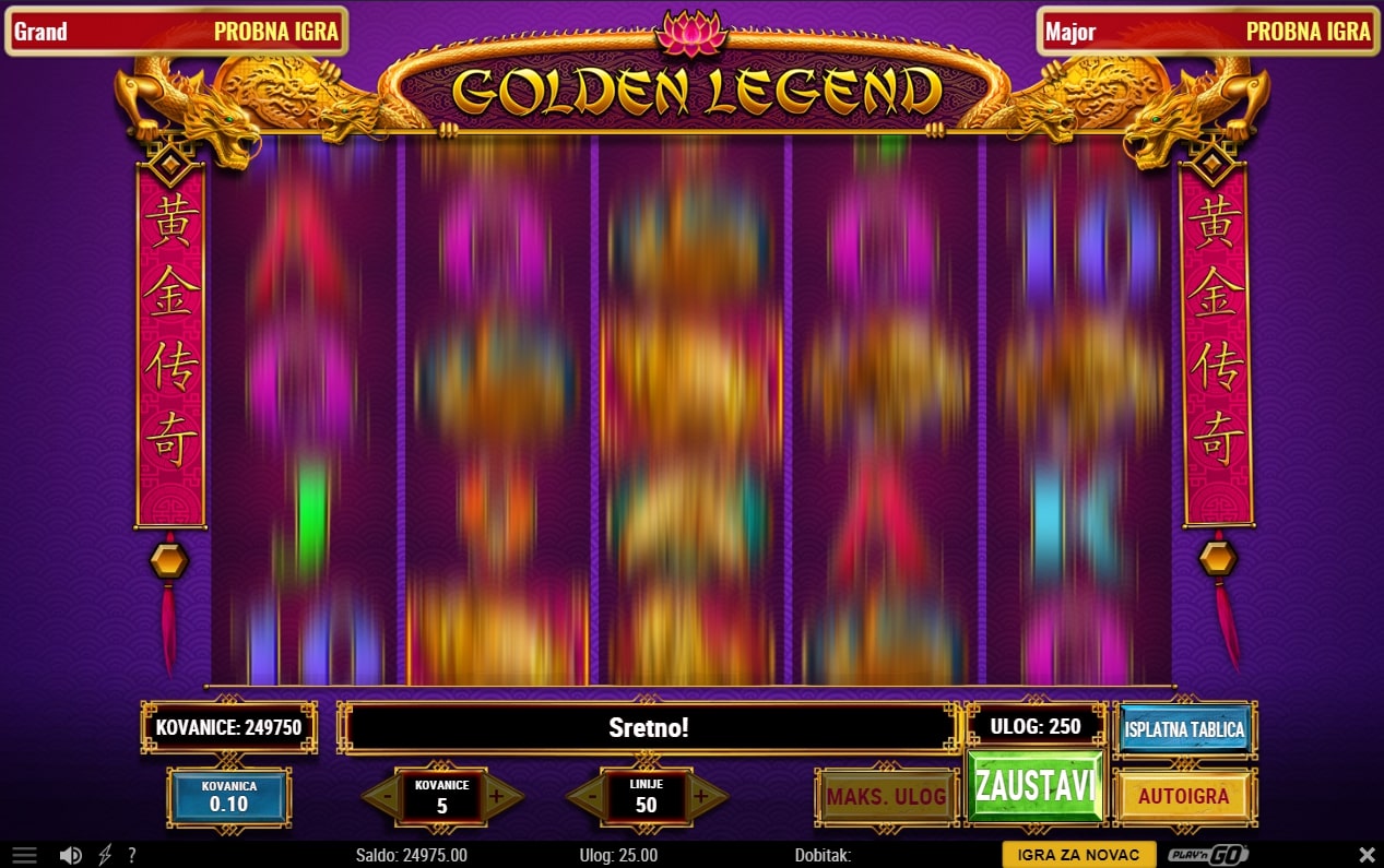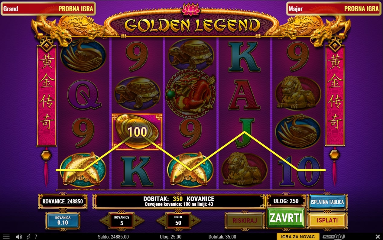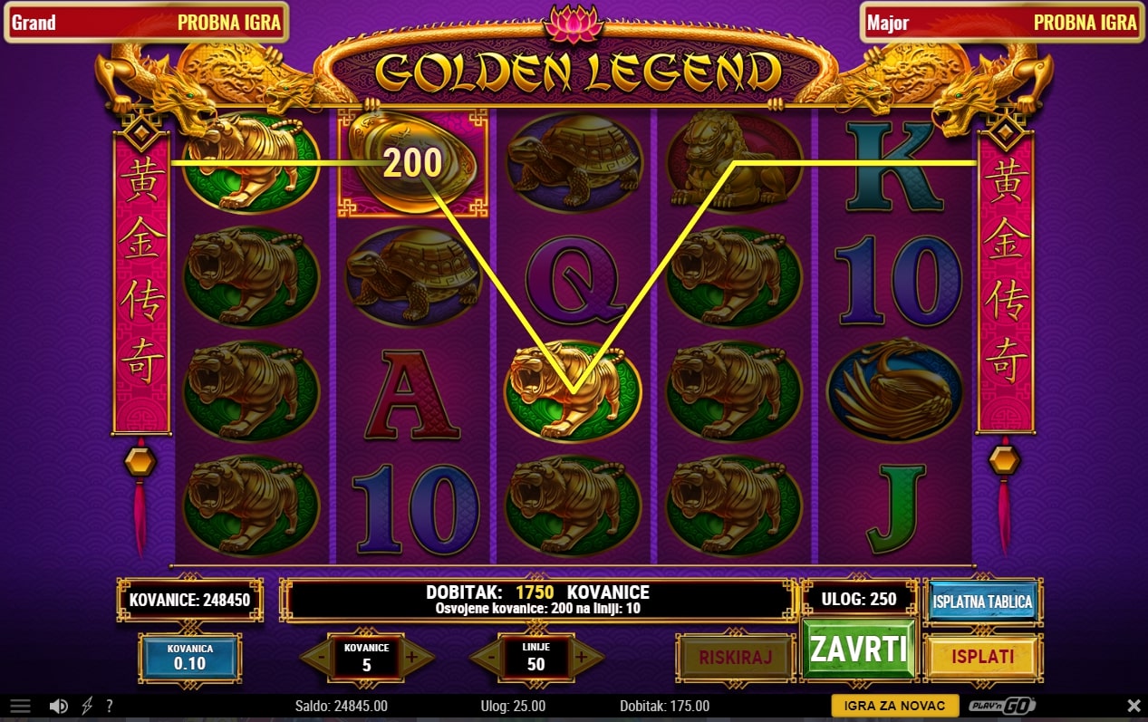 Golden Legend tematska je slot igra koja vodi igrača u drevnu Kinu u potrazi za tajanstvenim blagima prošlosti. Simboli su pozlaćeni i dobitnim kombinacijama isplaćuju odlične nagrade, a najviše vrijede tigrovi, lavovi i kornjače. Igra uz to sadrži posebne simbole Wilda i Scatter zmaja koji mijenjaju druge simbole, odnosno osvajaju igraču besplatne vrtnje. U slučaju dobitka, igrač ga može umnožiti pogađanjem boje ili znaka karte okrenute licem prema dolje. Zaigraj Golden Legend te osvoji vrhunske nagrade!
