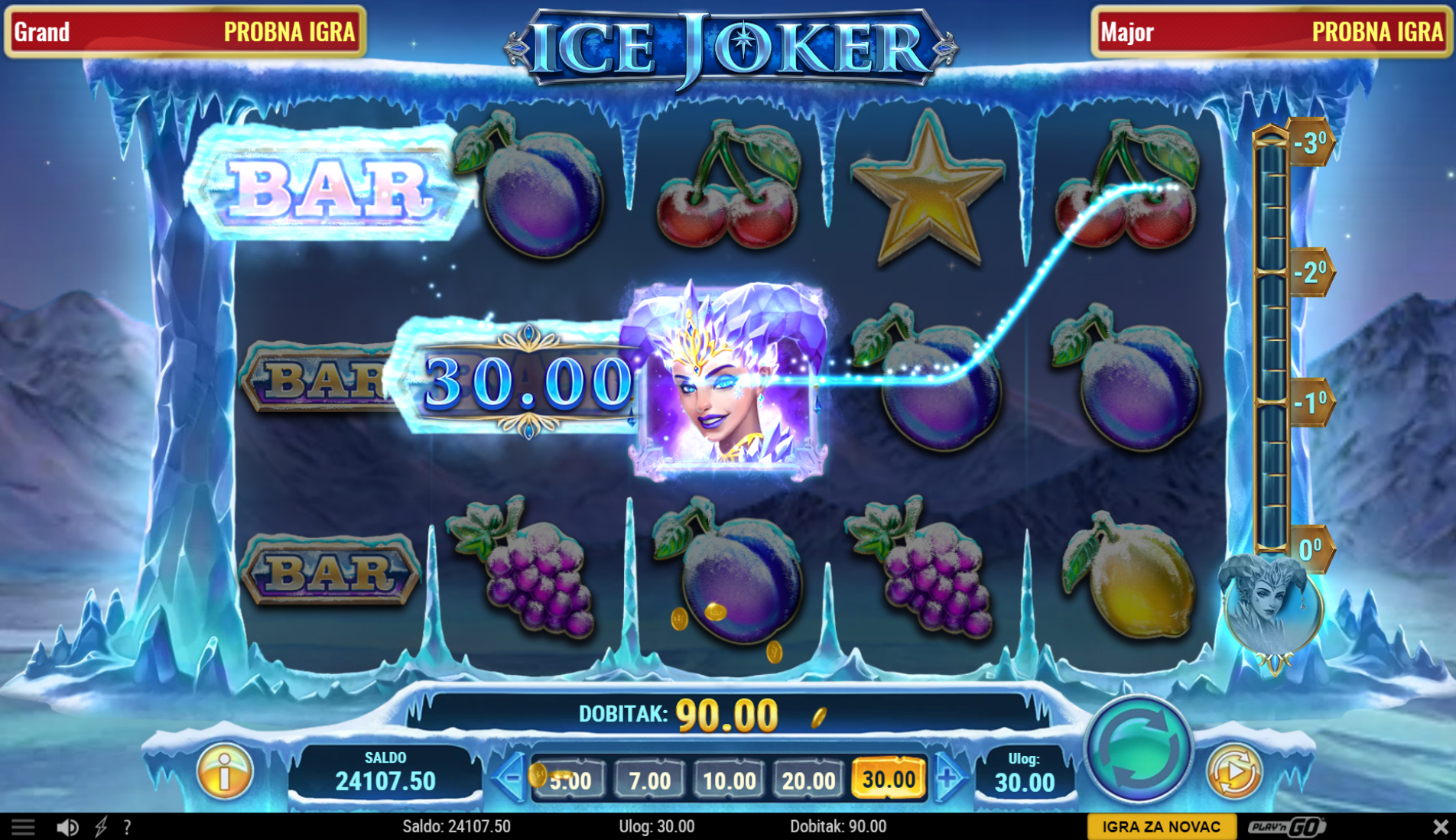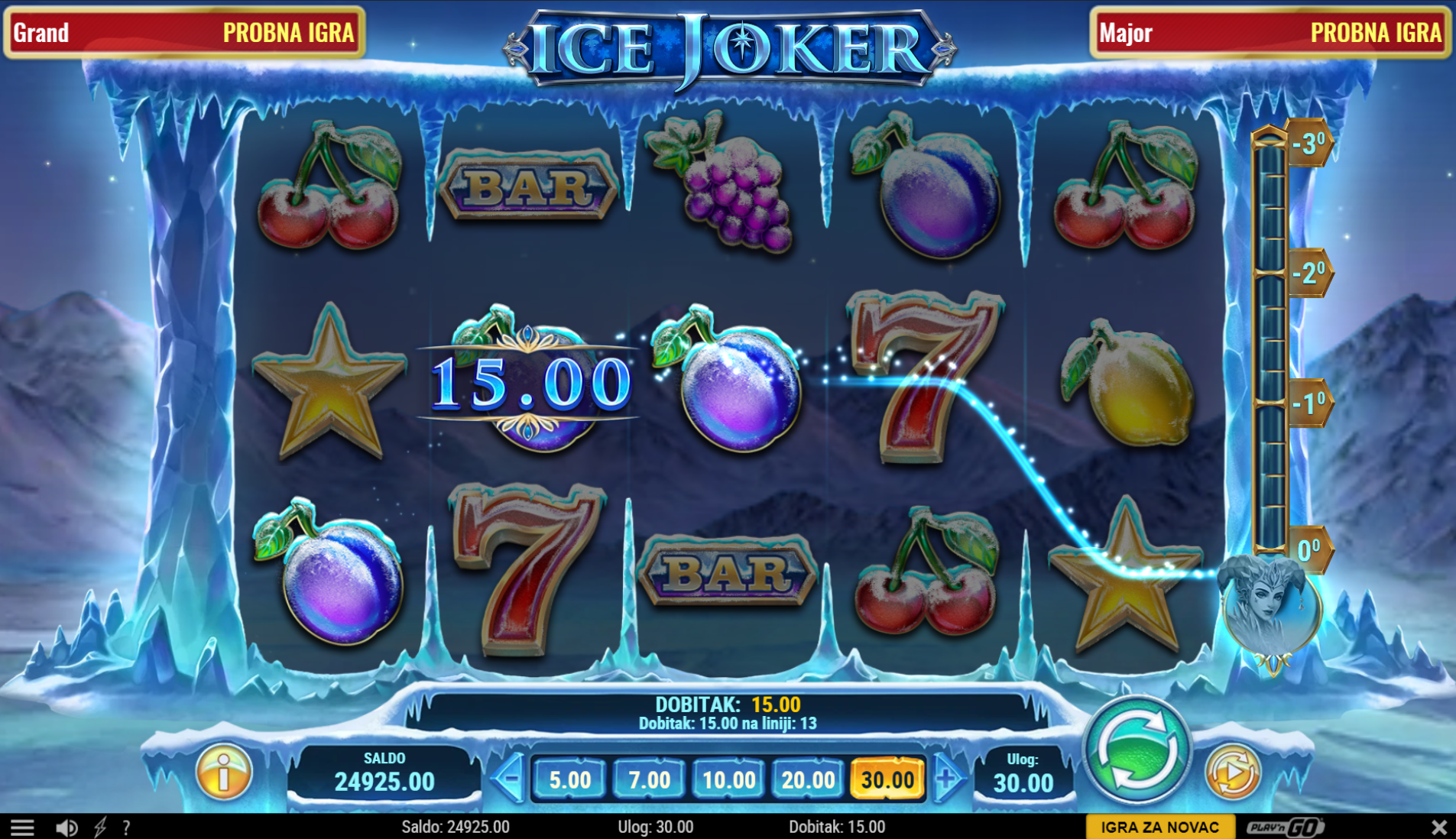 Ljubitelj si klasičnih i jednostavnih voćih slotova? Na pravom si mjestu jer Ice Joker pruža sve to, a i mnogo više. Primamljivo ilustrirano voće jednostavnog dizajna uz dodatak snježnih motiva, kao i način igranja učiniti će dozu zabave i zanimacije nedostižnom! Kako uzbuđenju tu nebi bio kraj, pobrinuti će se ledeni joker simbol i igranje pretvoriti u super uzbudljivo te bogato po pitanju dobitaka! Kao jedan od najpopularnijih slotova, Ice Joker odličan je izbor za sve igrače koji vole izvrstan omjer rizika i dobitaka.