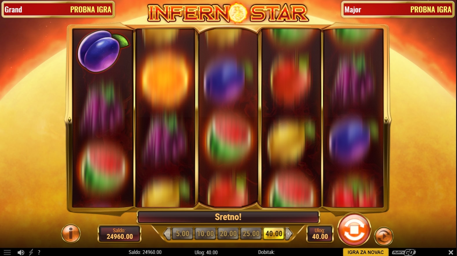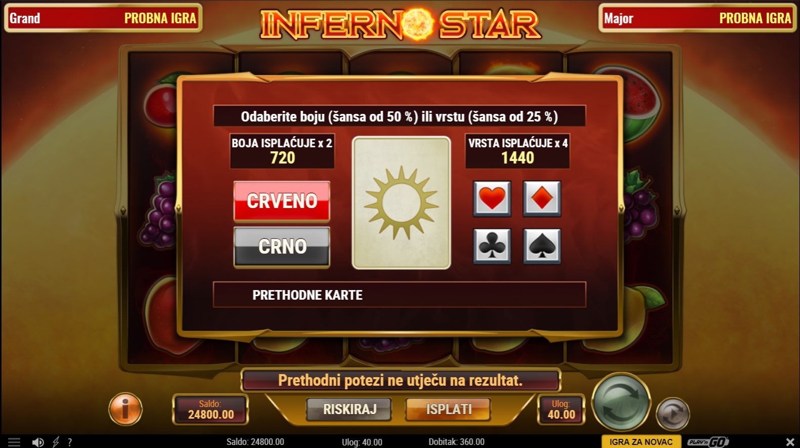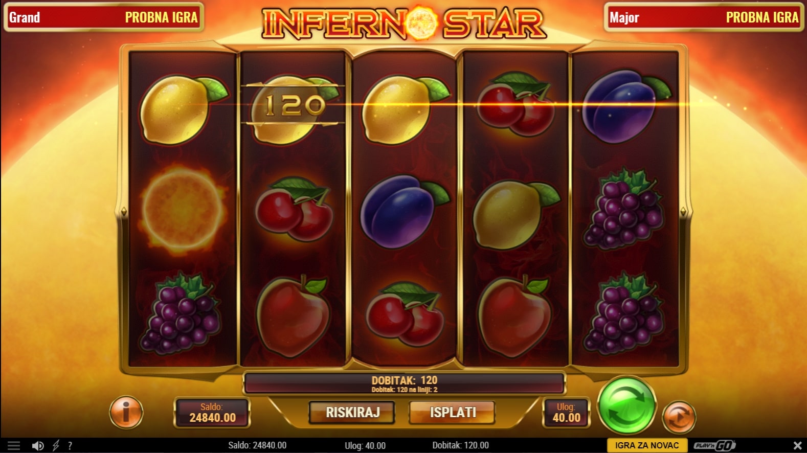 Inferno Star slot je igra klasičnog karaktera koja retro simbolima voća daje novi sjaj i ugođaj. Najviše isplaćuju simboli vatrenih kugli, dok onaj veći simbol sunčeva gnjeva isplaćuje bez obzira gdje se nalazio. U slučaju dobitka, igrač ga može pokušati udvostručiti pogađanjem boje ili znaka karte okrenute licem prema dolje. Zaigraj Inferno Star te osvoji slasne nagrade!