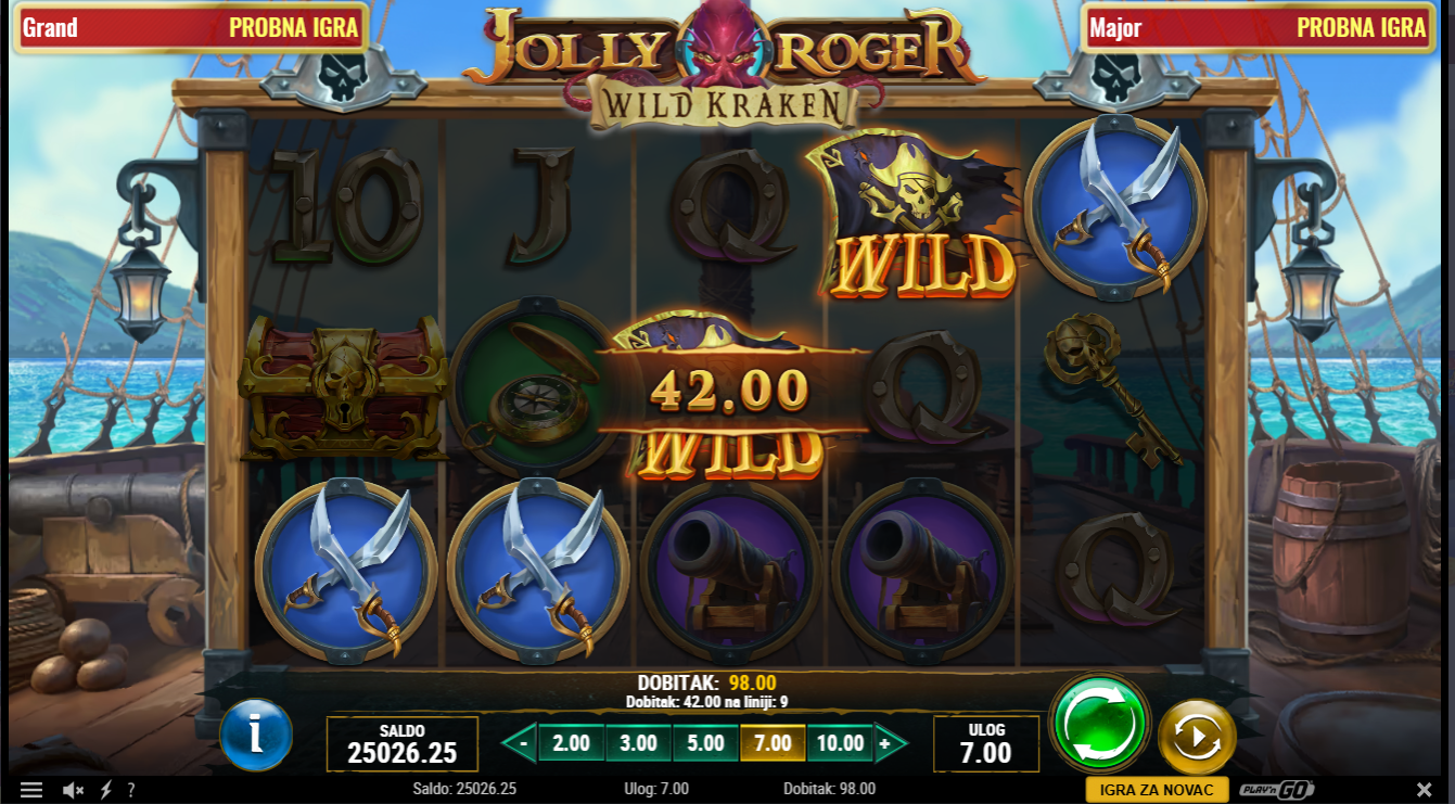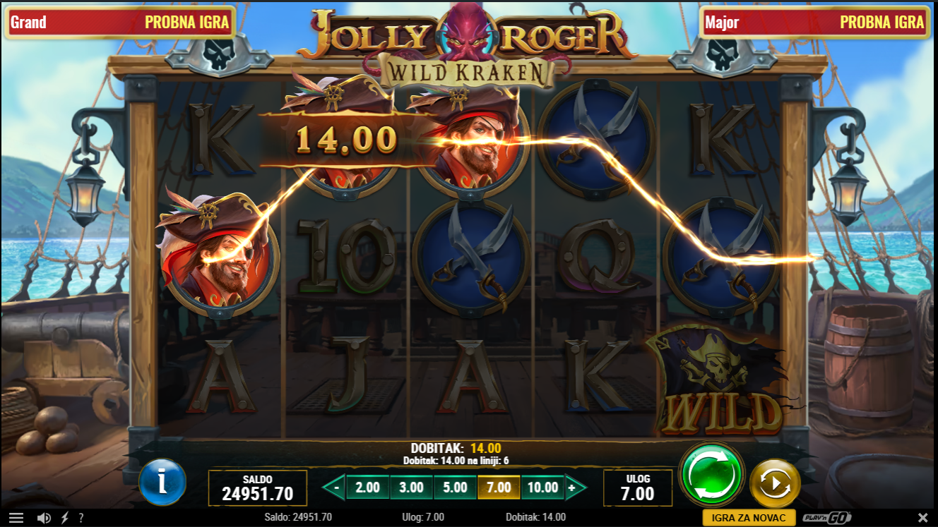 Jolly Roger Wild Kraken od Play'nGodonosi piratsku avanturu na valovima punim blaga, brodoloma i tajanstvenih morskih čudovišta. Igra odiše morskom atmosferom s detaljnim brodovima, blagom i impresivnim Kakenom koji nadgleda svaki spin. Simboli uključuju piratske karte, zlatnike, blago i piratsku posadu svi bogato animirani i u skladu s temom. Posebne značajke poput nasumičnih Kraken napada i multiplikatora stvaraju dodatnu dinamiku i uzbuđenje!