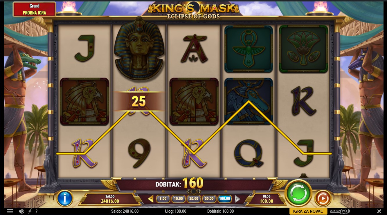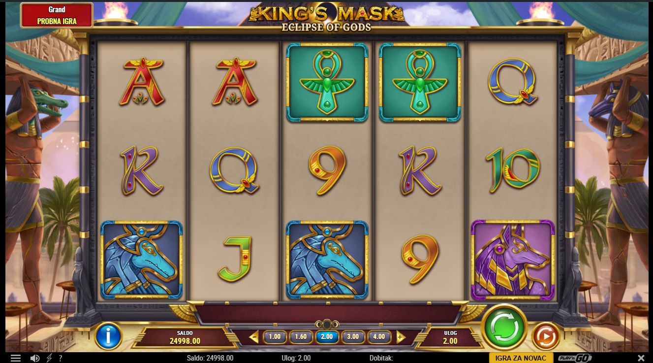 Zakorači u mistični svijet drevnog Egipta uz King’s Mask Eclipse of Gods, spektakularnu slot igru renomiranog providera Play’n GO! Ova uzbudljiva avantura odvija se među piramidama i zlatnim bogovima, gdje svaka vrtnja otkriva nove tajne i prilike za bogate nagrade. Igra se odvija na 5 bubnjeva i 20 isplatnih linija, a uz svaku vrtnju možeš osjetiti moć bogova koji svojim simbolima i značajkama donose dodatno uzbuđenje. Tu su posebne bonus značajke, besplatne vrtnje i moćni simboli koji otkrivaju snagu kraljevske maske, simbola bogatstva, moći i vječnosti. Ako voliš slot avanture s egipatskom temom, King’s Mask Eclipse of Gods nudi pravo putovanje kroz svijet legendarnih bogova i zlatnih misterija!