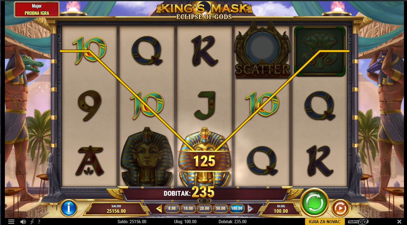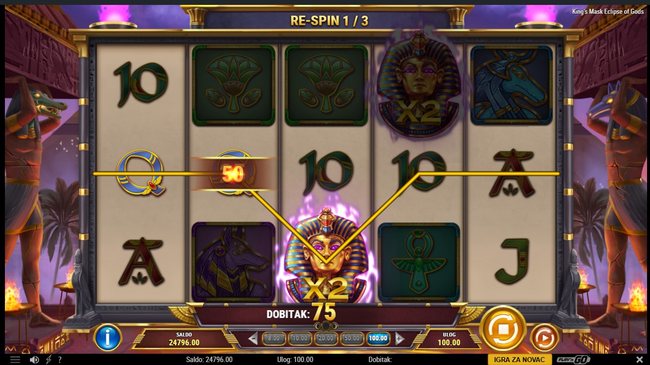 King’s Mask Eclipse of Gods se igra na 5 bubnjeva s 20 isplatnih linija. Dobitne kombinacije formiraju se s lijeva na desno, a Wild simbol zamjenjuje sve ostale simbole osim Scatter simbola. Pojavom tri ili više Scatter simbola aktivira se bonus značajka od 10 besplatnih vrtnji, tijekom kojih se mogu otkriti dodatne funkcije i povećane nagrade. Tijekom osnovne igre mogu se pojaviti posebni simboli bogova koji donose nasumične bonuse, dodatne množitelje ili proširujuće Wild simbole. Odaberi svoj ulog, pritisni Spin i prepusti se moći bogova u King’s Mask Eclipse of Gods!