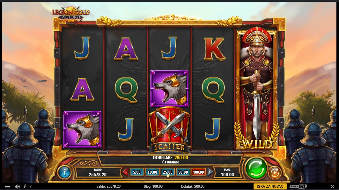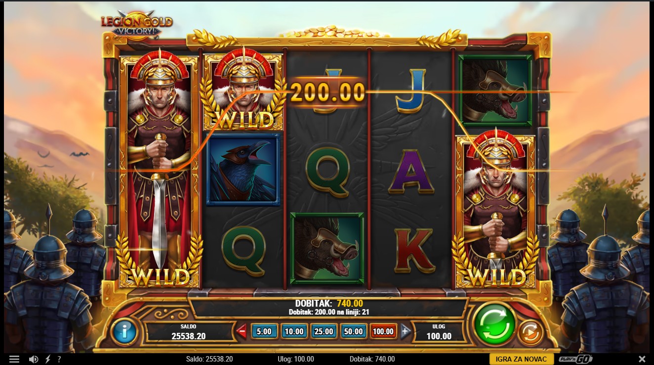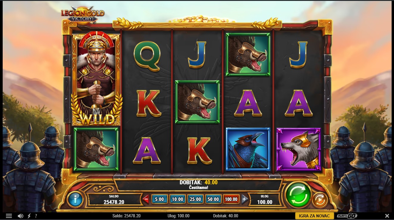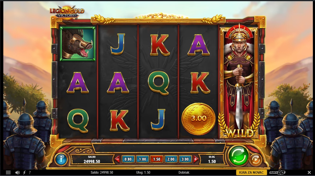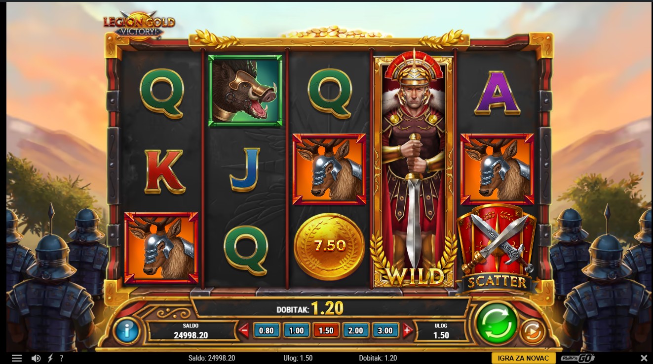 Legion Gold Victory! se igra na 5 bubnjeva i 25 fiksnih linija. Gold Coin simboli pokreću Gold Re-Spins kada se pojavi 6 ili više na rolama, a svaki novi simbol resetira broj preostalih Re-Spinova na 3. Gold Coin Bag isplaćuje ukupnu vrijednost svih prisutnih Gold Coinova i nastavlja doprinositi bonusu. Gold Coins koji se pojave izvan Re-Spinova prikupljaju se u Victory Gold, s mogućnošću osvajanja Victory Prize. Tri Scatter simbola pokreću Mega Free Spins, a bonus Gold Re-Spins može se aktivirati putem Mega Gold Coina tijekom Free Spinova.