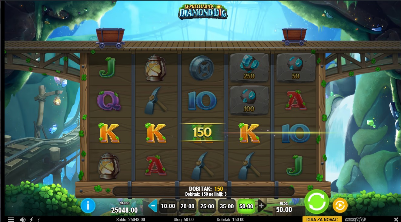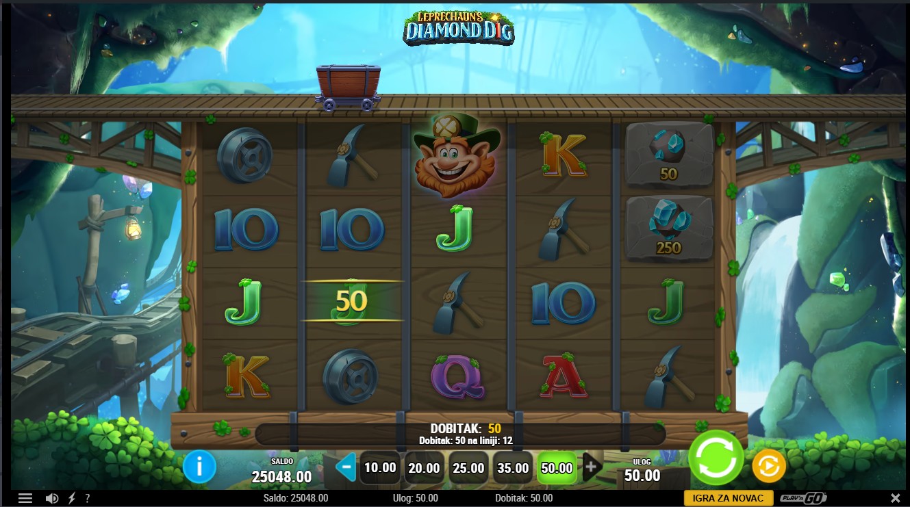 50x ukupnog uloga. Bilo koja kombinacija Diamond simbola također može isplatiti ako stvori dobitnu isplatnu liniju. Tri ili više Leprechaun