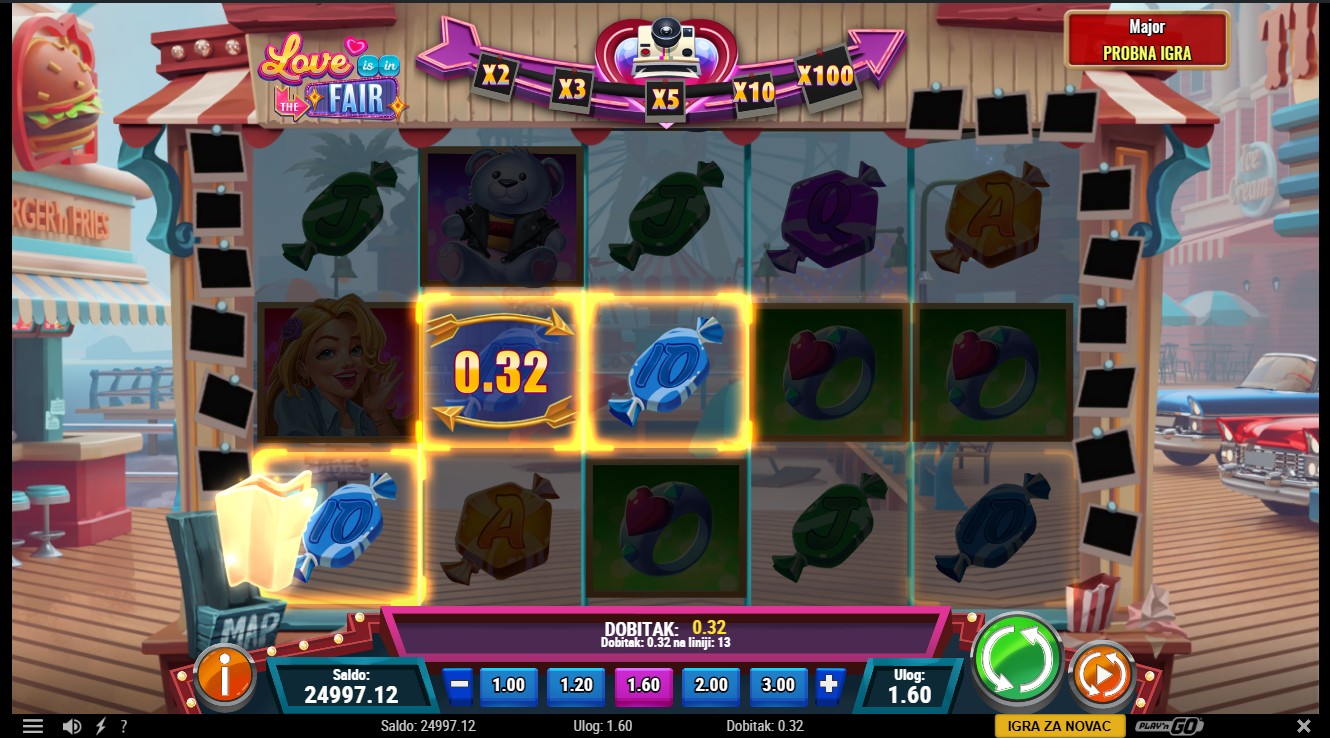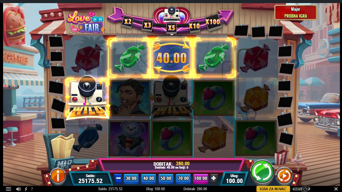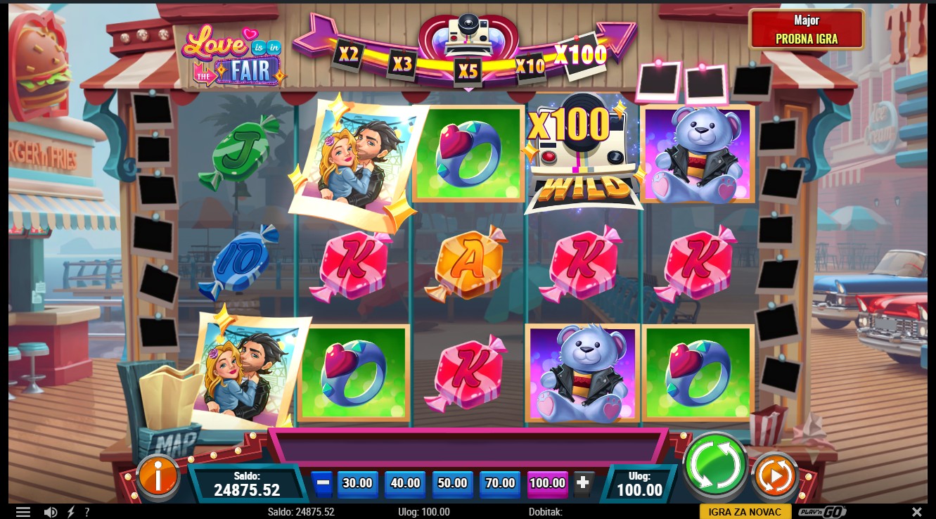 Zakorači u svijet romantike s Love is in the Fair, slot igrom s 5 bubnjeva i 20 fiksnih isplatnih linija renomiranog providera Play’n GO! Simbol Romantic Pic (Scatter) može se pojaviti na bilo kojoj roli, a naslagani Scatteri u tri simbola visine mogu pokrenuti Free Spins. Simbol Love Cam (Wild) zamjenjuje sve simbole osim Scattera i može se pojaviti kao Multiplier Wild s vrijednostima od 2x do 100x. Vrijednost Multiplier Wild simbola tijekom Free Spins raste s brojem sakupljenih Scatter simbola, a dodatna tri Free Spina dodjeljuju se za svaku novu etapu skupljanja.