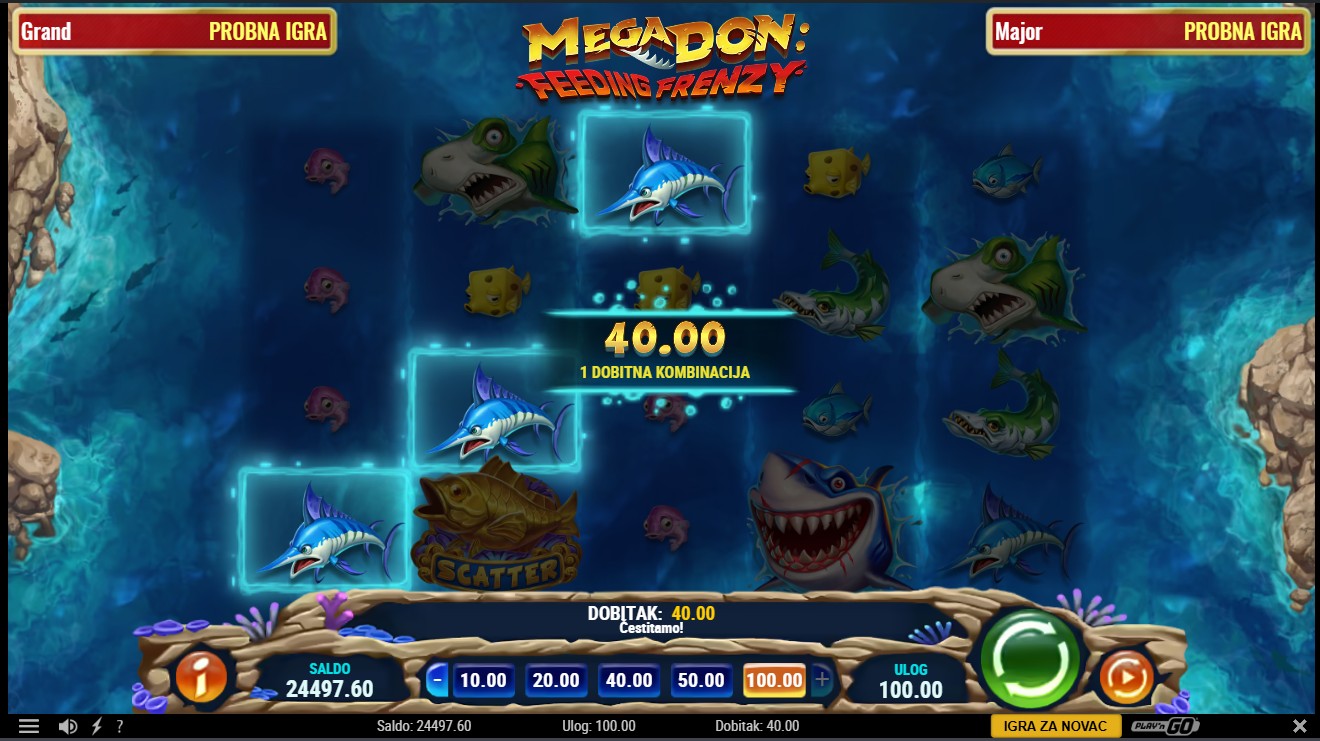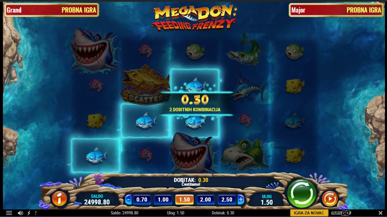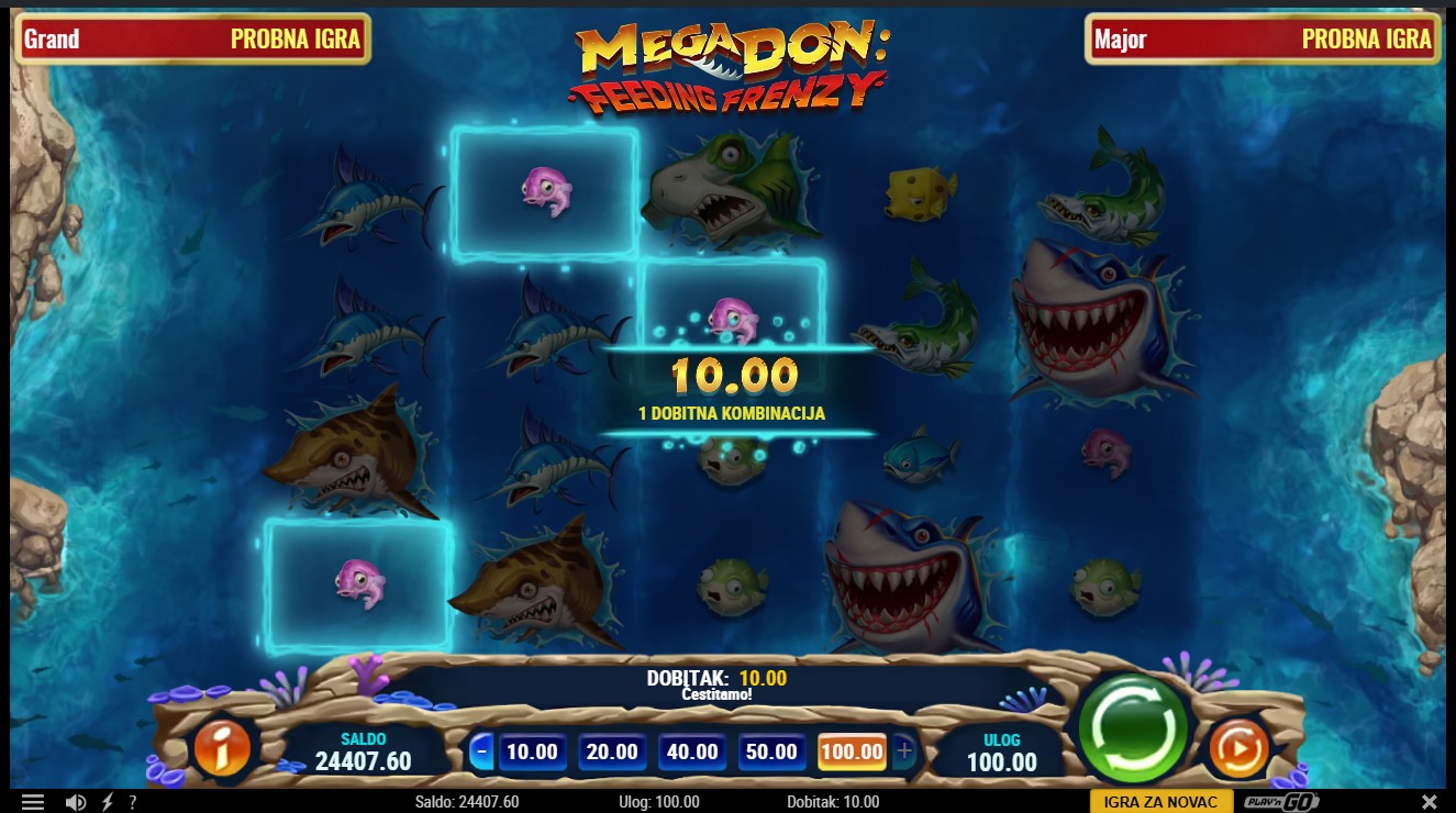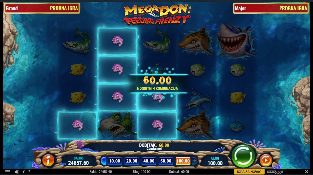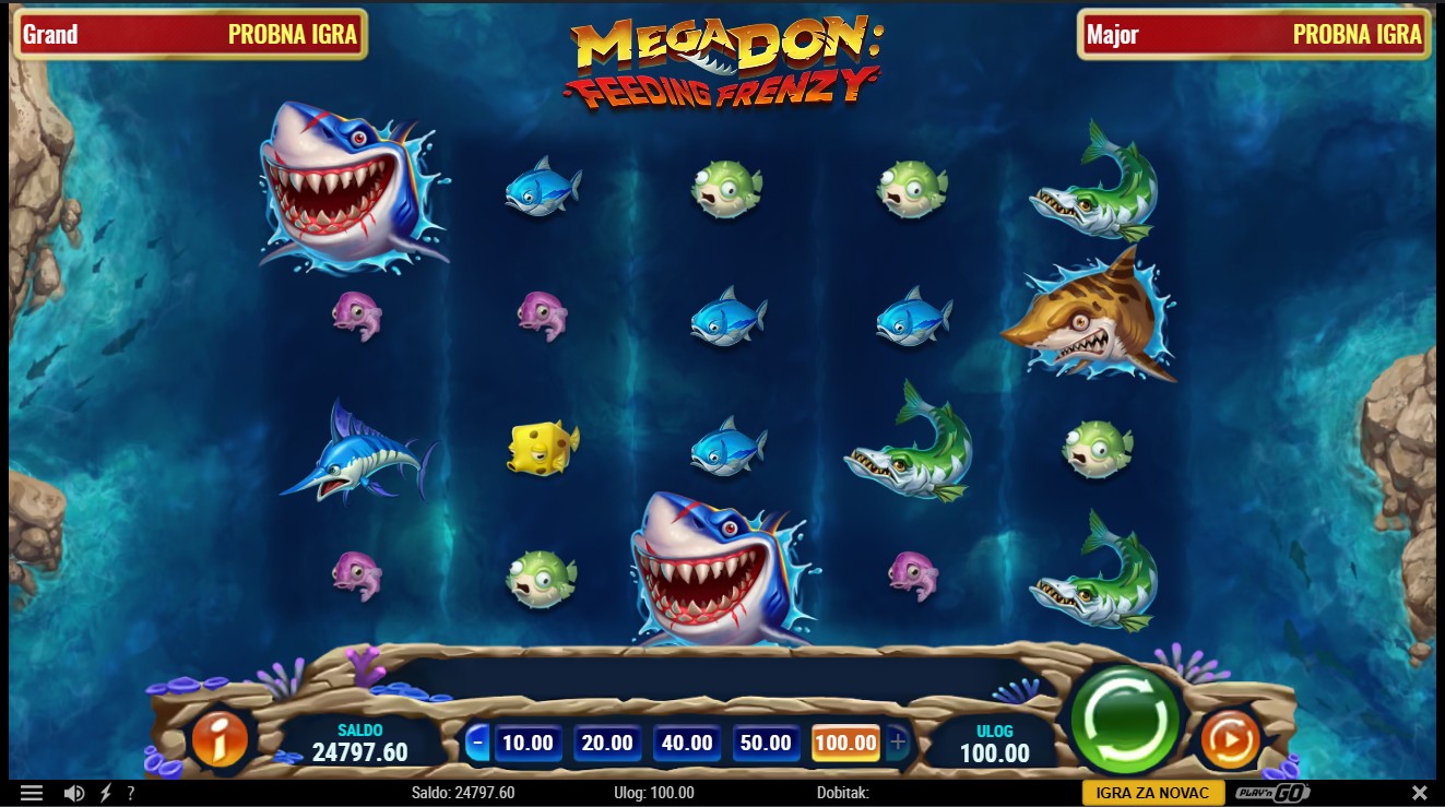 Mega Don: Feeding Frenzy vodi te u nezaboravnu morsku avanturu. Ova slot igra providera Play’n GO vodi te u podvodni svijet prepun riba i morskih pasa. U igri s 5 rola i 1024 potencijalna dobitna kombinacija, možeš aktivirati značajku Vrijeme za zalogajčić koja pretvara ribe u simbole morskih pasa. Pokreni bonus Gozba morskih pasa i odaberi između Leoparda, Hammerheada ili Mega Dona kako bi osvojio Free Spinove i dodatne simbole unapređenja. Tijekom bonusa možeš ponovno aktivirati Free Spinove i uživati u nagradama dok skupljaš simbole za maksimalan dobitak.