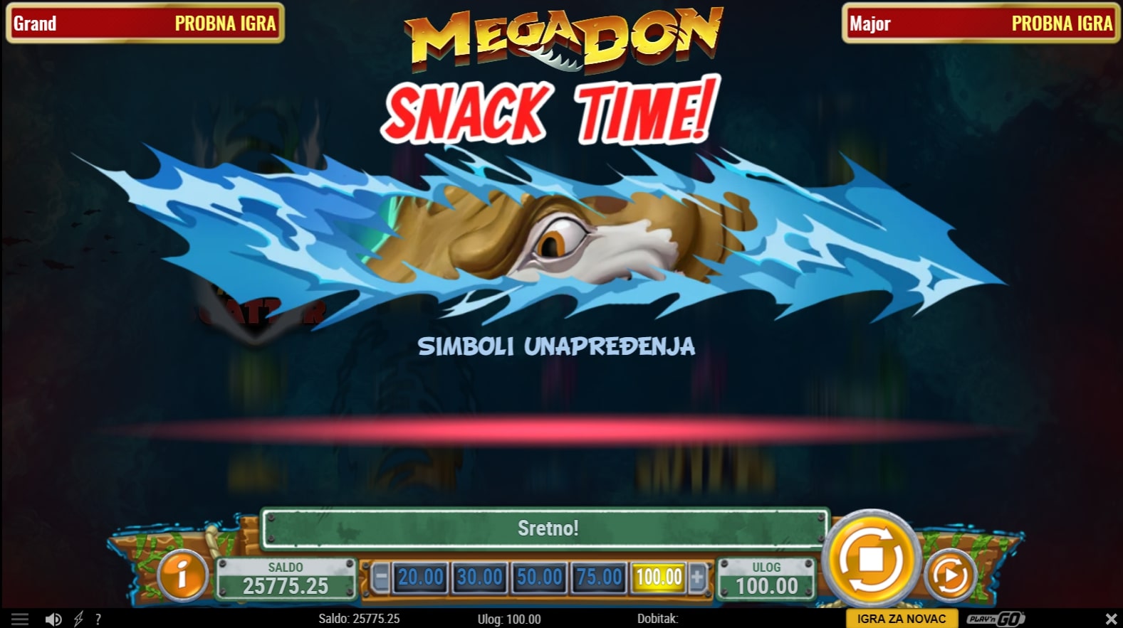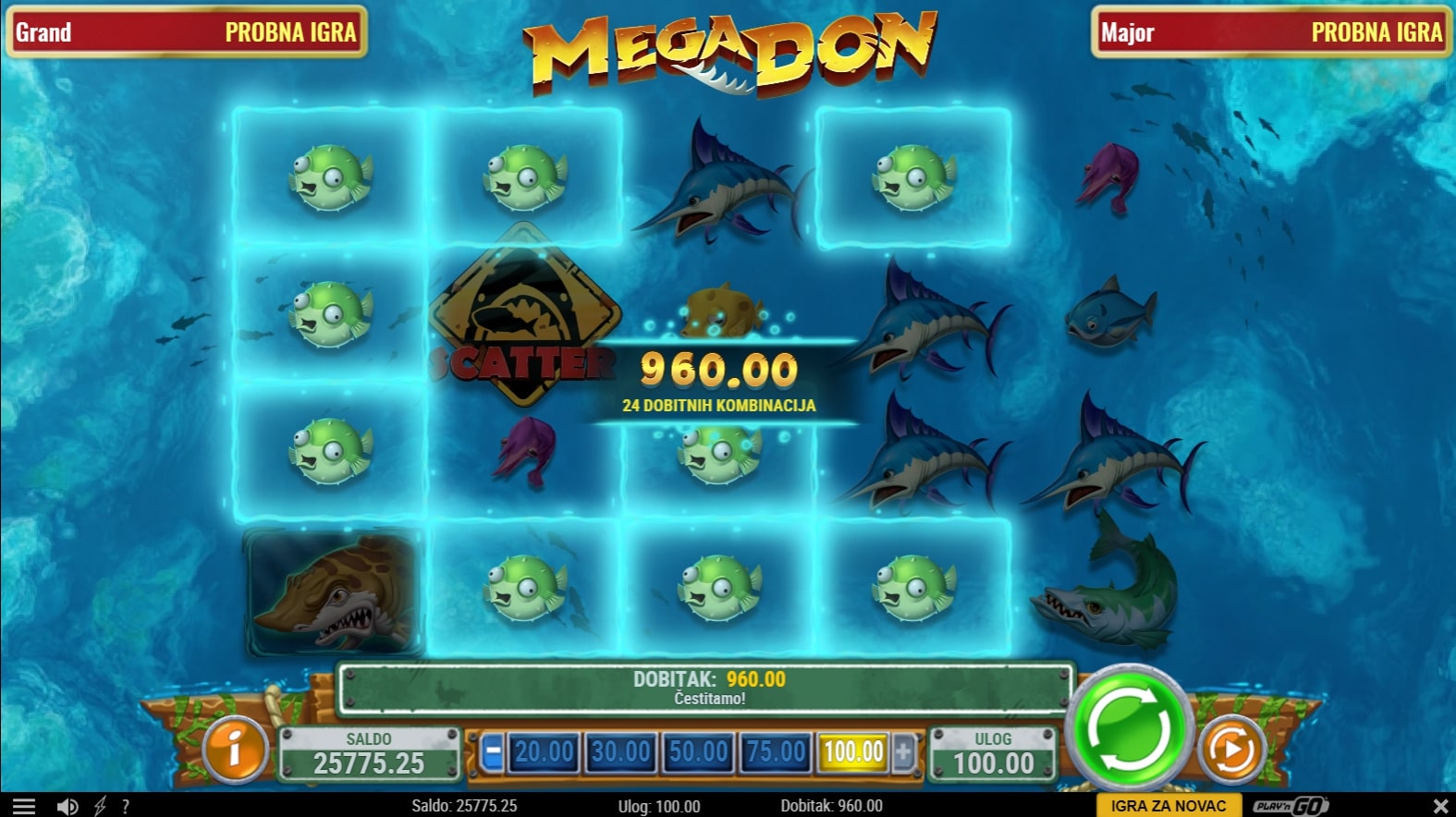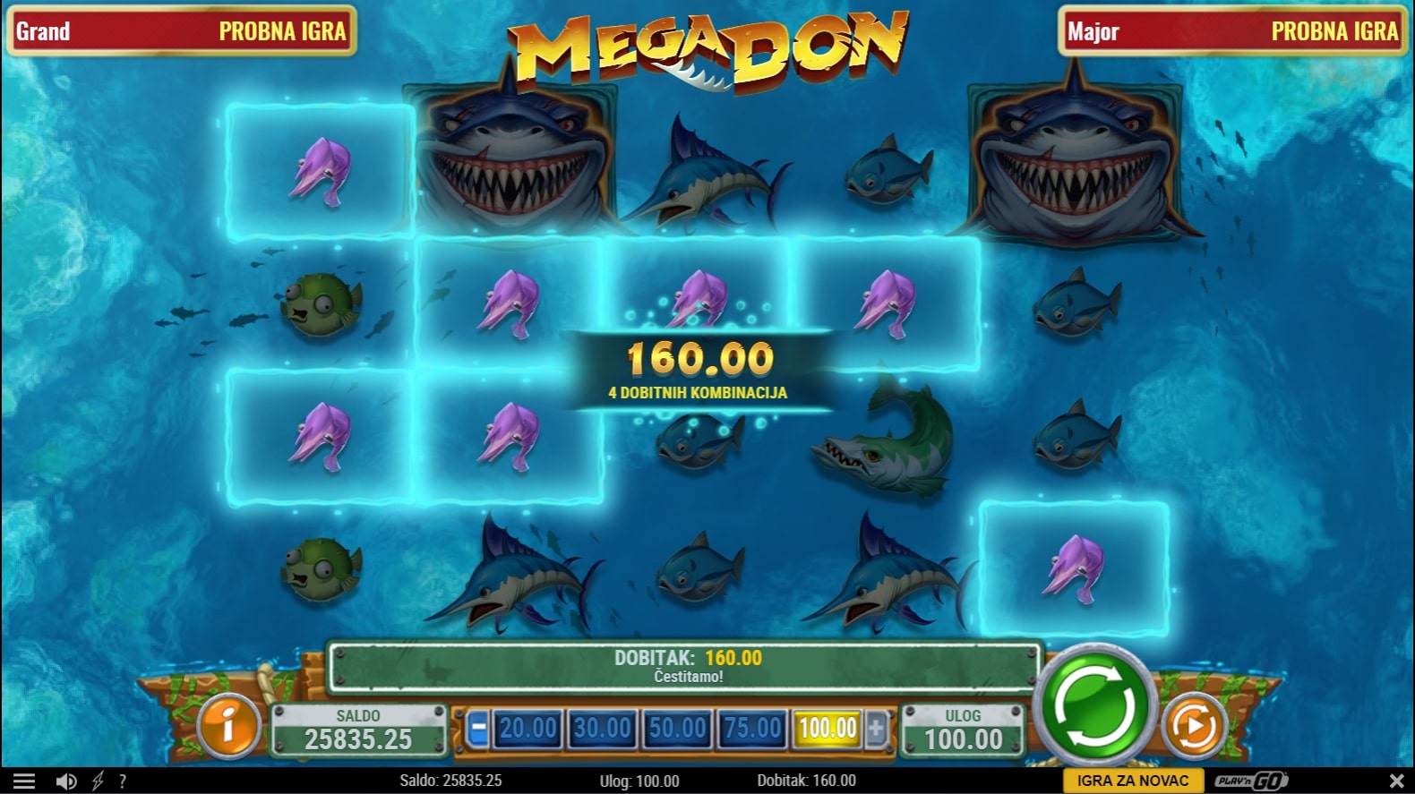 Mega Don slot je igra tematskog karaktera koja vodi igrača u mračni svijet morskih dubina u lov na epske dobitke. Najviše isplaćuju različite vrste morskih pasa, dok Wild simbol pomaže u stvaranju dobitaka zamjenom drugih simbola. Uz to, igrač može osvojiti besplatne vrtnje javljanjem Scatter simbola. Usred igre nasumično može doći 'vrijeme za zalogajčić' kada se nasumični simboli unapređuju u one viših vrijednosti. Zaigraj Mega Don te osvoji najveće nagrade!