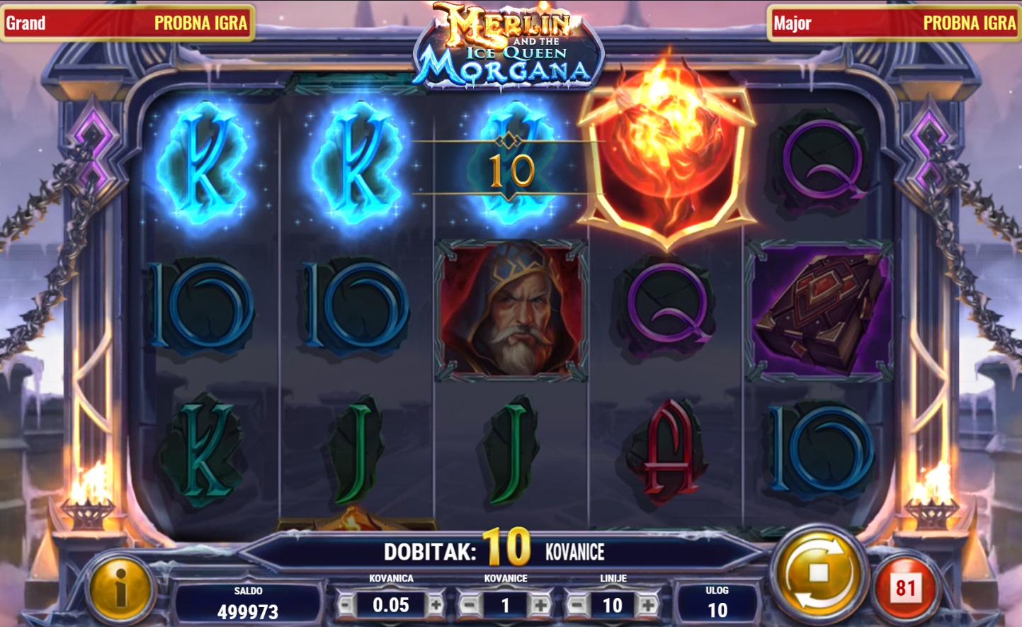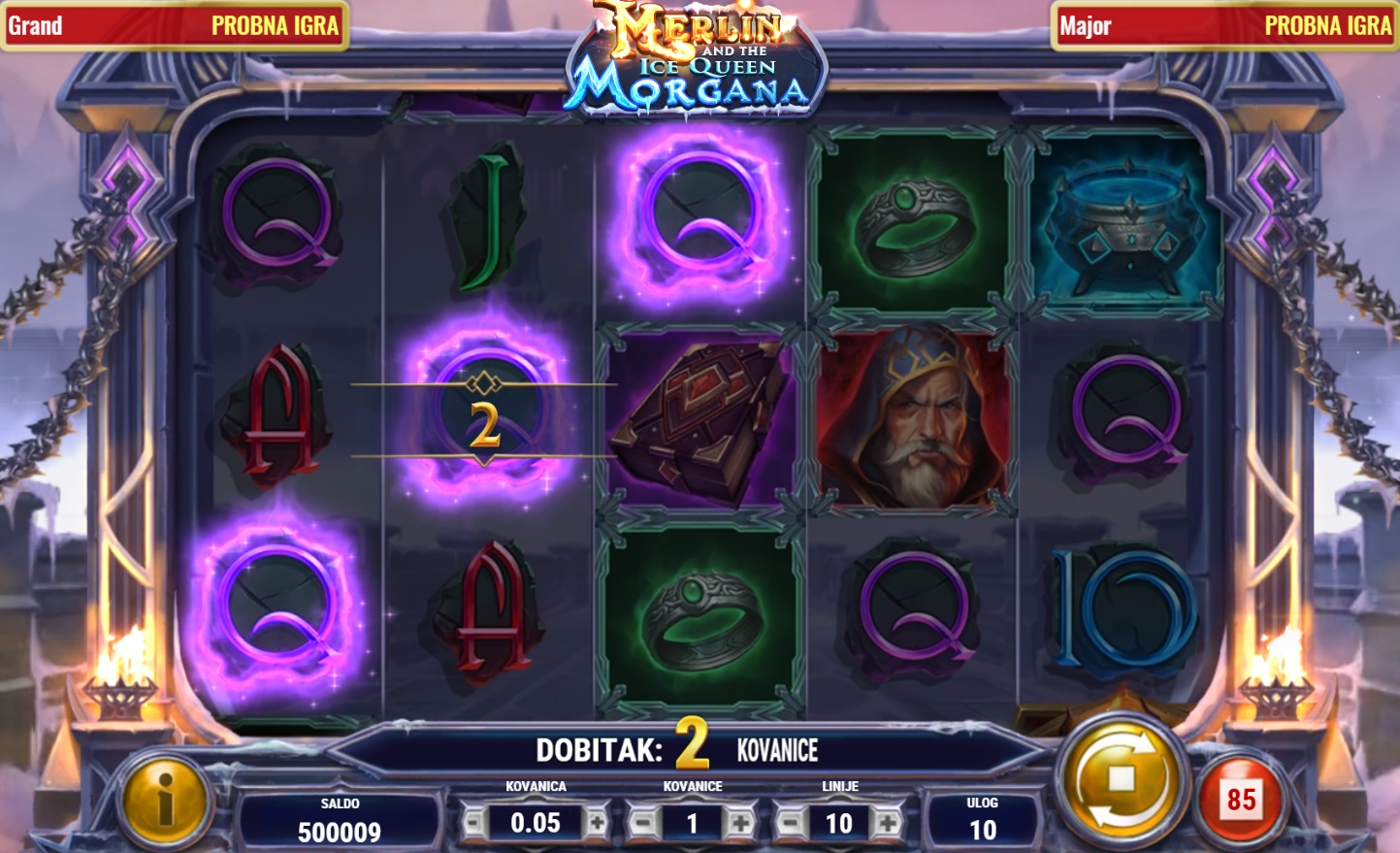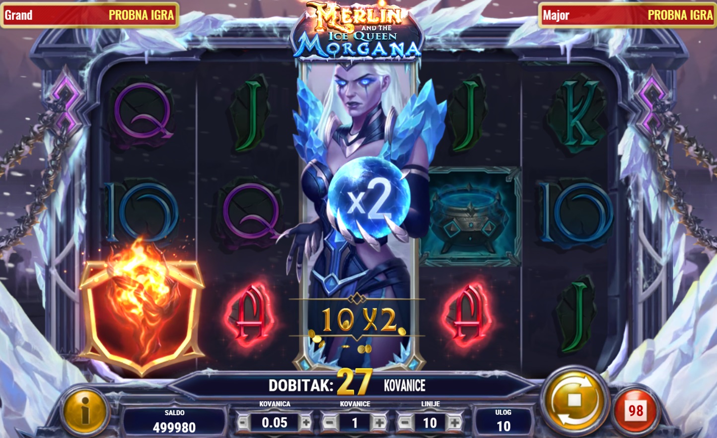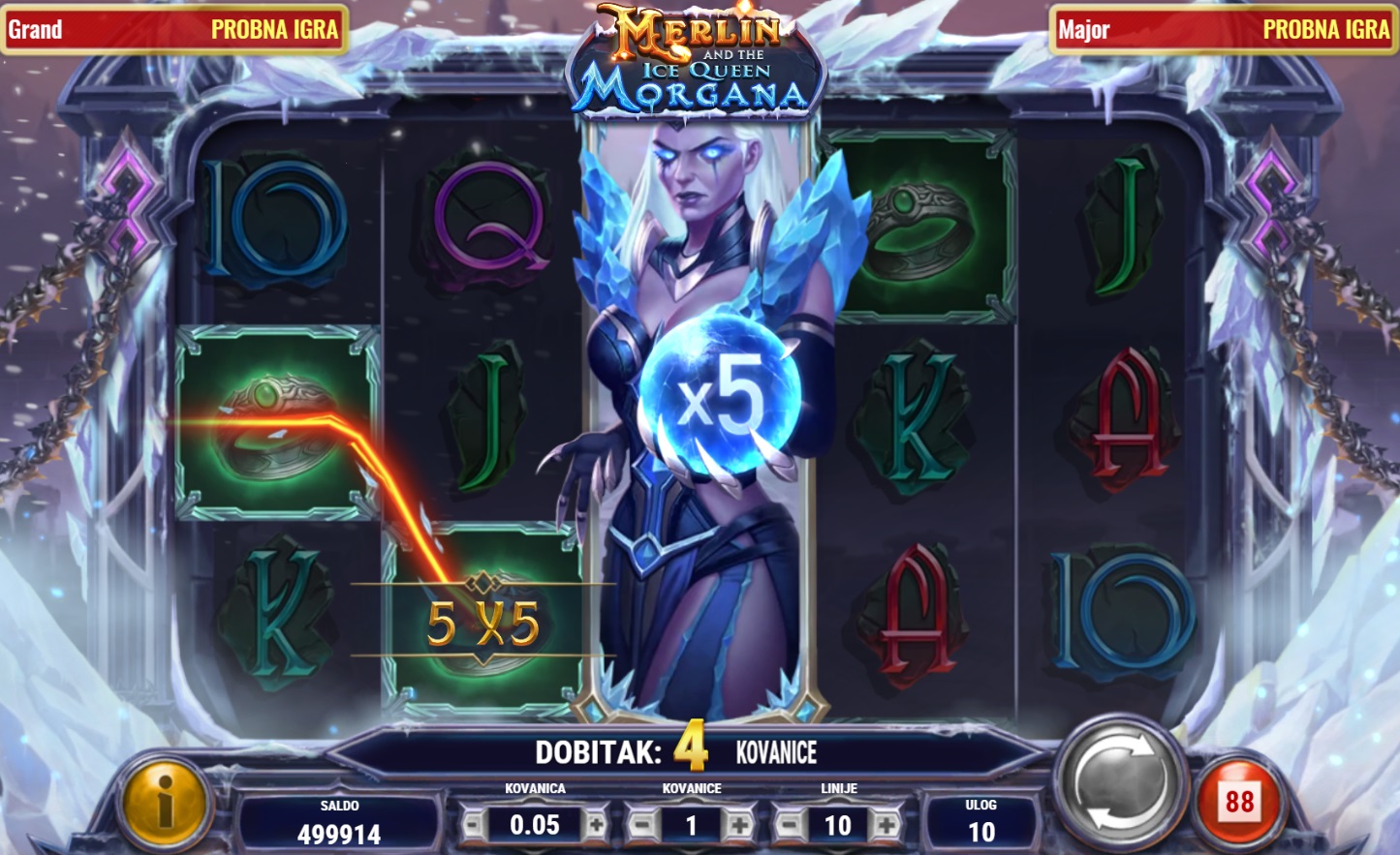 Merlin and the Ice Queen Morgana vodi te na magično putovanje kroz svijet legendarnih likova i moćnih simbola. Ovaj videoautomat s 5 x 3 polja i 10 isplatnih linija nudi uzbudljive mogućnosti dobitka. Scatter simboli pokreću besplatne vrtnje, a Morgana Wild simbol nudi dodatne šanse za velike nagrade. Multiplikatori do x8 udvostručuju tvoje dobitke, dok se tijekom besplatnih vrtnji biraju posebni simboli koji se šire preko cijelih rola, čime dodatno povećavaju šanse za veliki dobitak.