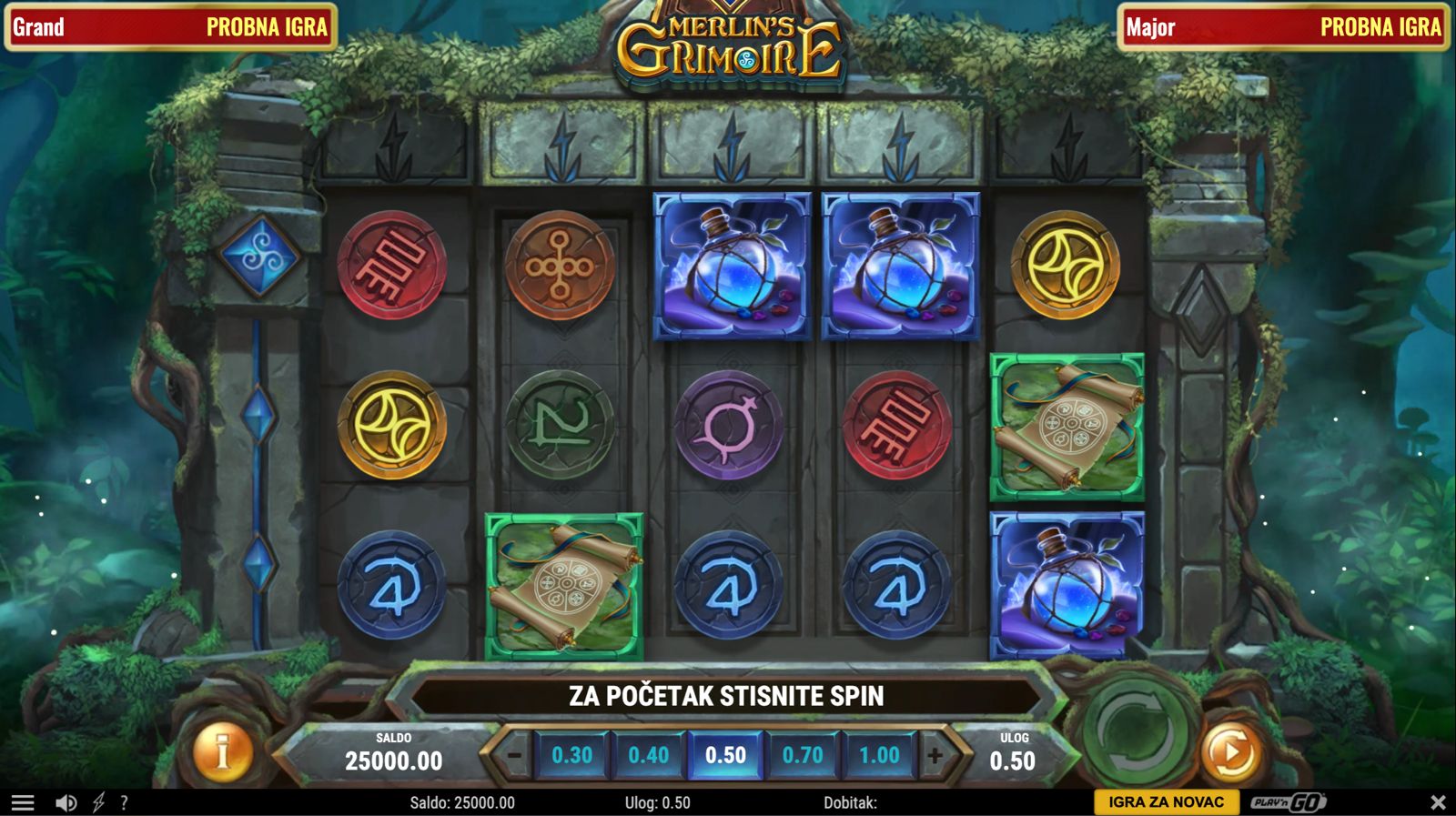 Merlin’s Grimoire igra se na 5 rola, a cilj je složiti iste simbole na aktivnim dobitnim linijama, počevši s lijeve strane, kako bi se ostvarili dobitci. Simboli inspirirani magijom i drevnim grimoarima donose razne razine nagrada, dok posebni bonusi i jackpot značajka mogu dodatno povećati tvoje šanse za impresivne isplate. Postavi željeni ulog, zavrti role i prepusti se čarobnoj avanturi kroz svijet magije i neograničenih mogućnosti!