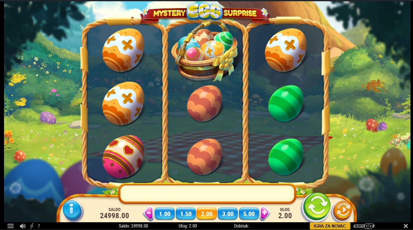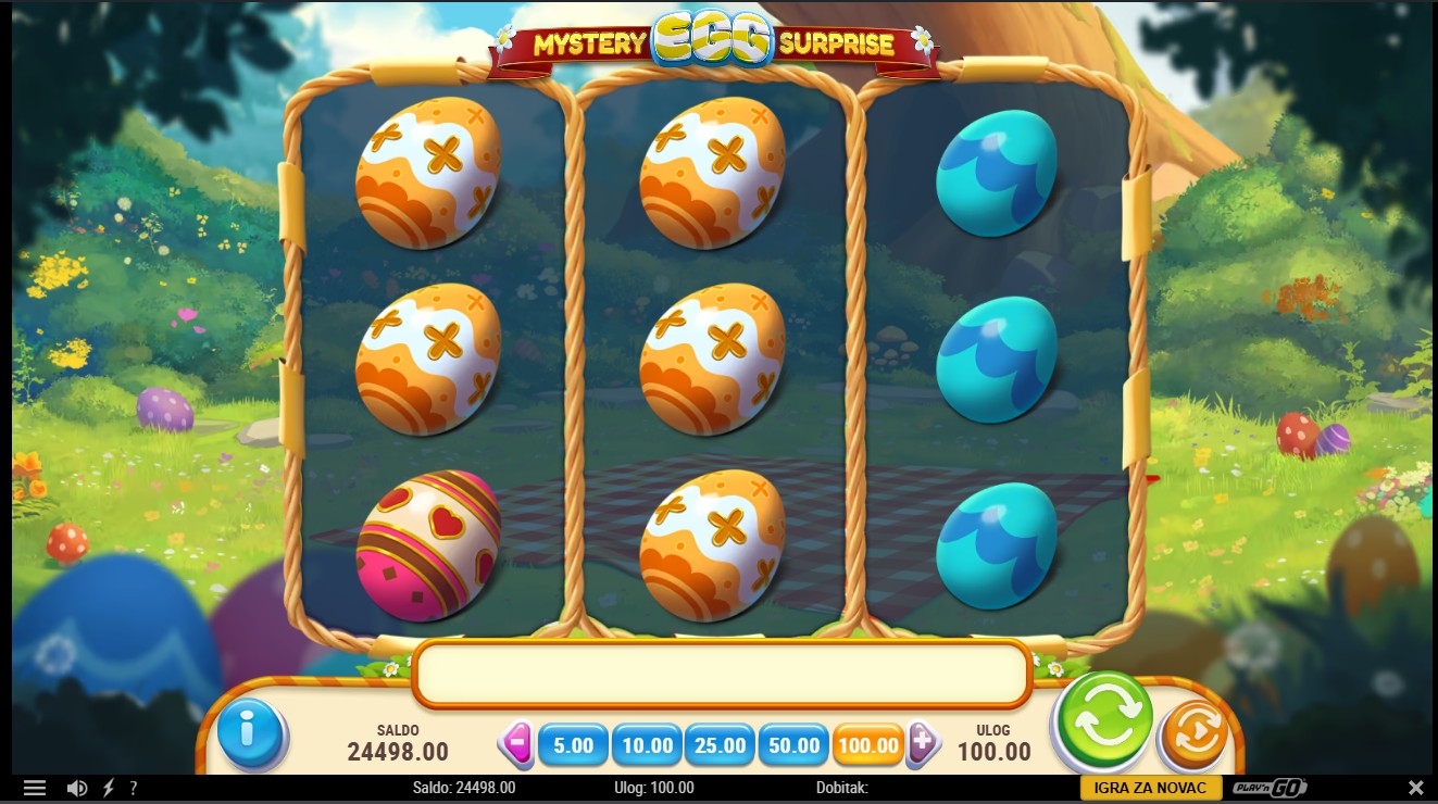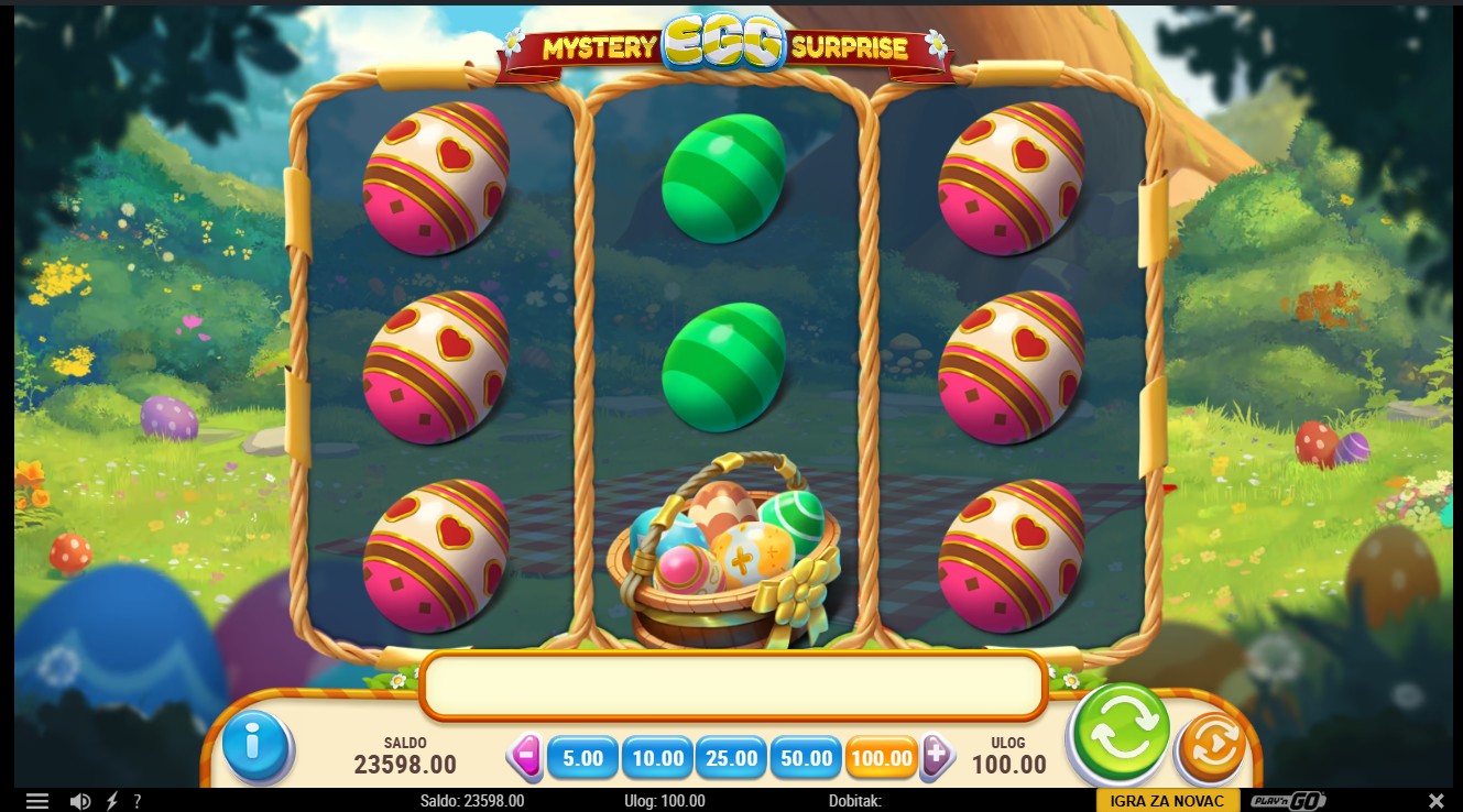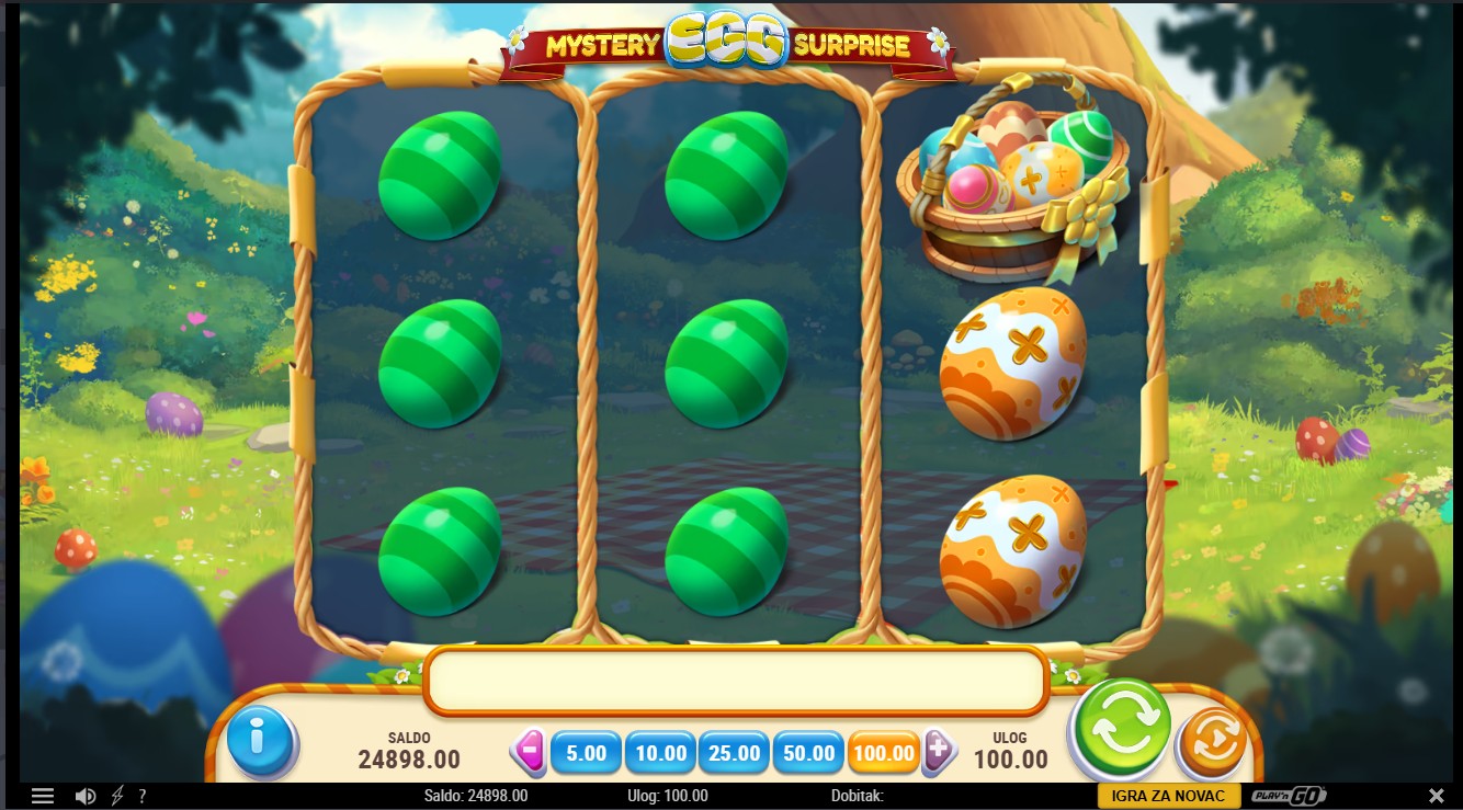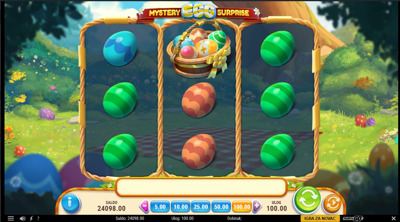 Mystery Egg Surprise je vesela slot igra providera Play’n GO s 3 koluta i 5 fiksnih isplatnih linija. Svaki simbol u igri predstavlja šareno uskrsno jaje koje skriva iznenađenje. Kada se formira dobitna kombinacija, jaja pucaju i otkrivaju svoje skrivene poslastice, stvarajući veselu i dinamičnu animaciju. U osnovnoj igri Scatter simbol u obliku košare s jajima (Egg Basket) može se pojaviti bilo gdje na kolutima, a tri takva simbola aktiviraju bonus značajku Free Spins s 10 besplatnih vrtnji. Tijekom besplatnih vrtnji, Egg Basket se pretvara u Mystery Egg Scatter, koji može donijeti nasumične nagrade do 100x ukupnog uloga i dodatne besplatne vrtnje.