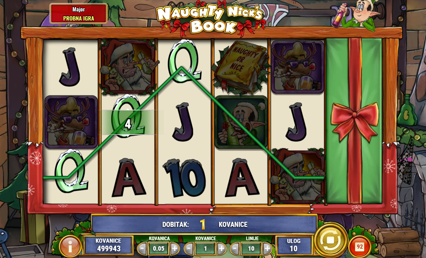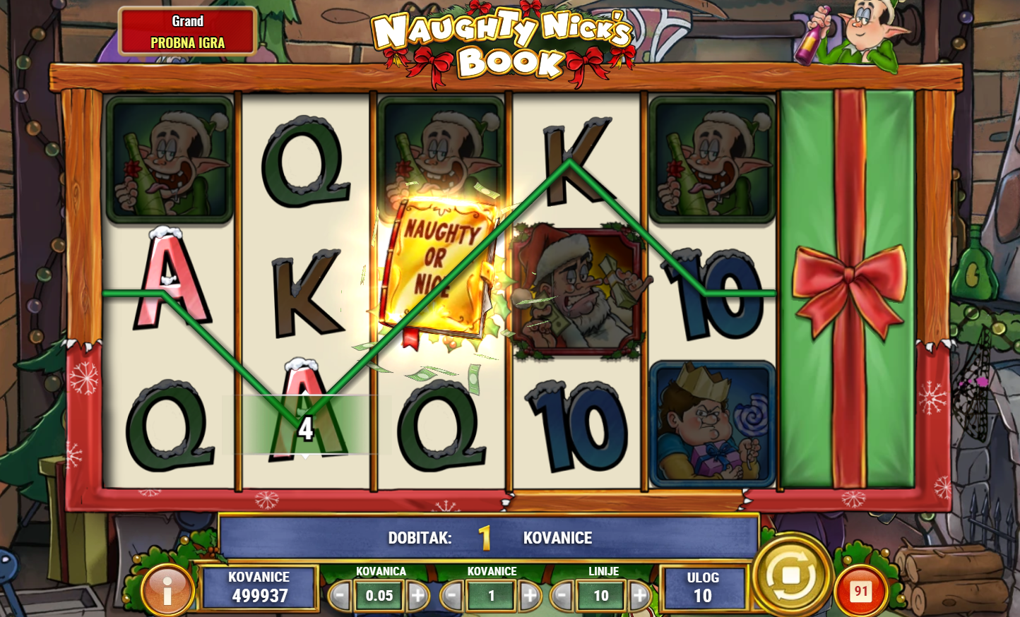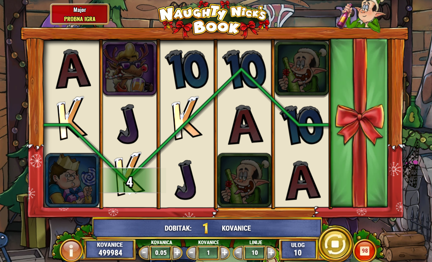 U igri Naughty Nick's Book uživat ćeš u raznolikim bonusima i šarenim simbolima. Ova igra nudi uzbudljive mogućnosti za dobitak uz fantastične free spinove i velike jackpote. Naughty Nick's Book je videoautomat s 6 rola i 3 retka te 10 dobitnih linija. U glavnoj igri, 6. rola je zaključana, a 3 ili više scatter simbola aktiviraju bonus igru s dodatnim besplatnim vrtnjama. Igra također nudi opciju riskiranja, pružajući šansu za udvostručivanje ili učetverostručivanje dobitaka.