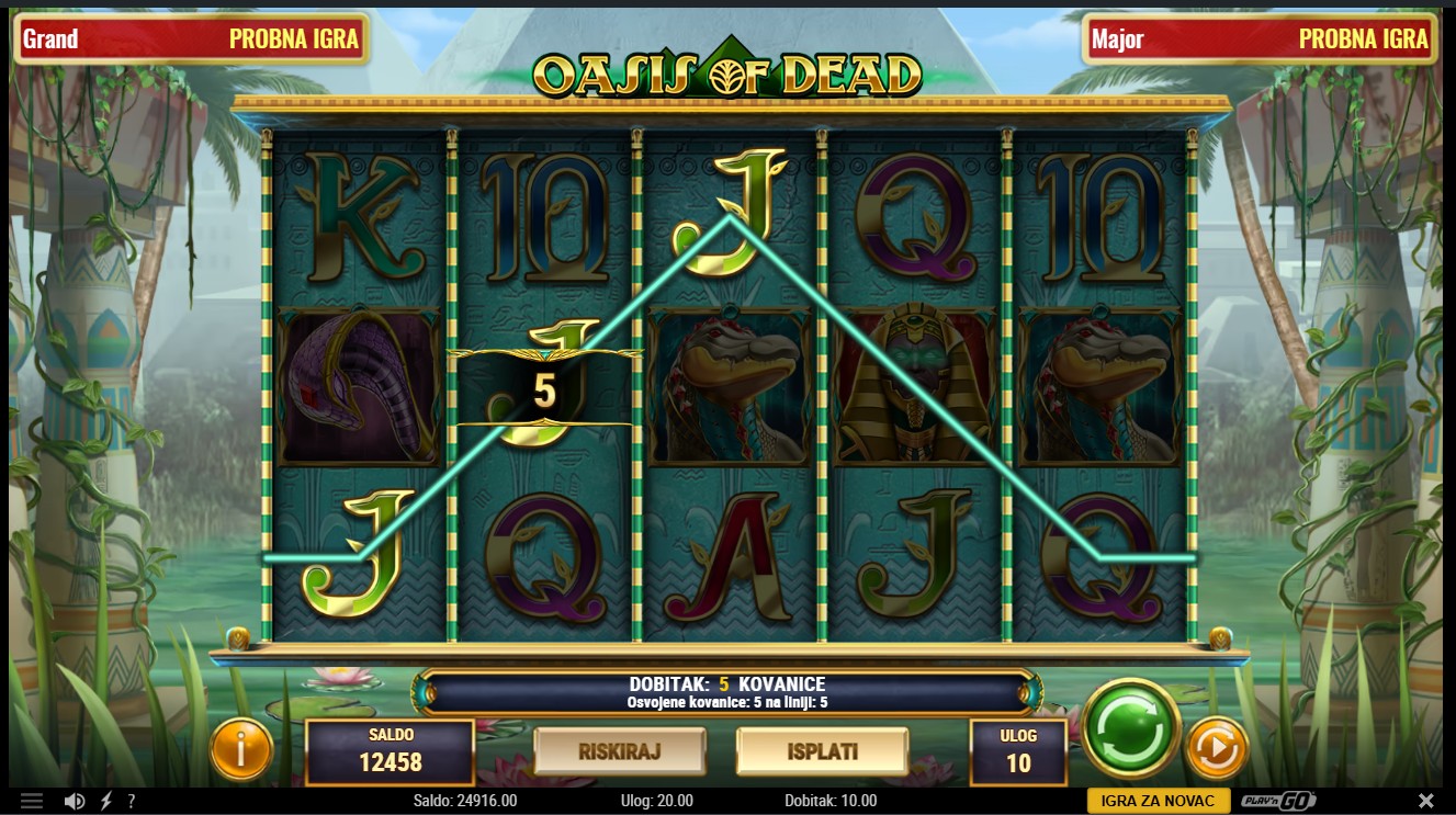 Oasis of Dead donosi ti pustinjsku avanturu smještenu duboko u tajanstvene egipatske dine, gdje skriveni hramovi čuvaju davno izgubljena blaga i tajne drevnih bogova. Ova slot igra s 5 koluta i 10 linija dolazi od providera Play’n Go. Mistična atmosfera, zlatni simboli i moćni scatteri stvaraju doživljaj kao da si na pragu otkrivanja faraonske grobnice.