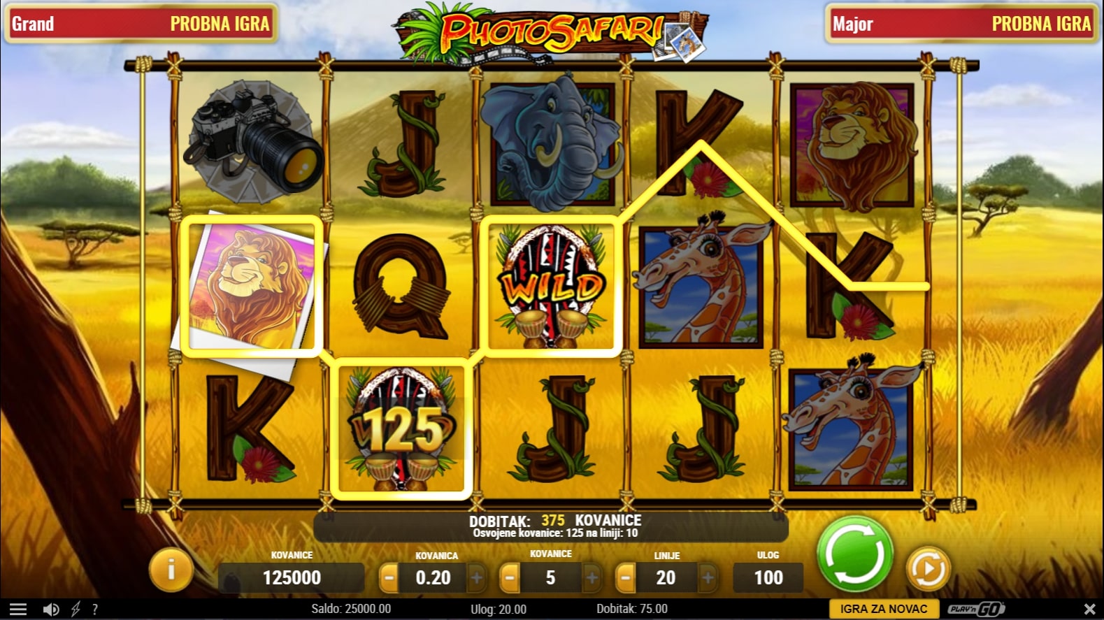 Photo Safari slot je igra istraživačke tematike koja vodi igrača u nezaboravnu avanturu afričkim savanama u društvu veličanstvenih životinja. Najviše isplaćuju simboli lava, slona, žirafe ili zebre, dok posebni Wild simbol pomaže u stvaranju dobitaka mijenjajući druge simbole. Javljanjem kombinacija filmske vrpce ili kamere igrač može osvojiti vrhunske besplatne igre. Zaigraj Photo Safari te osvoji fenomenalne nagrade!