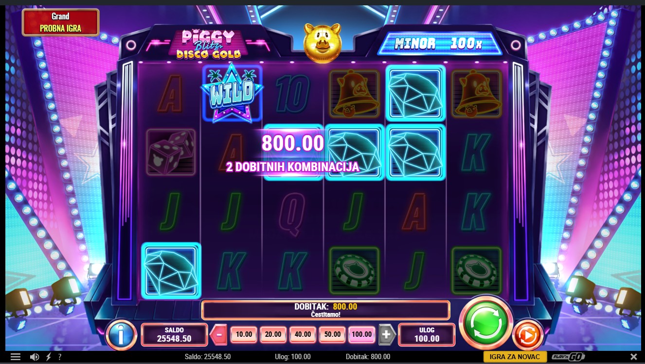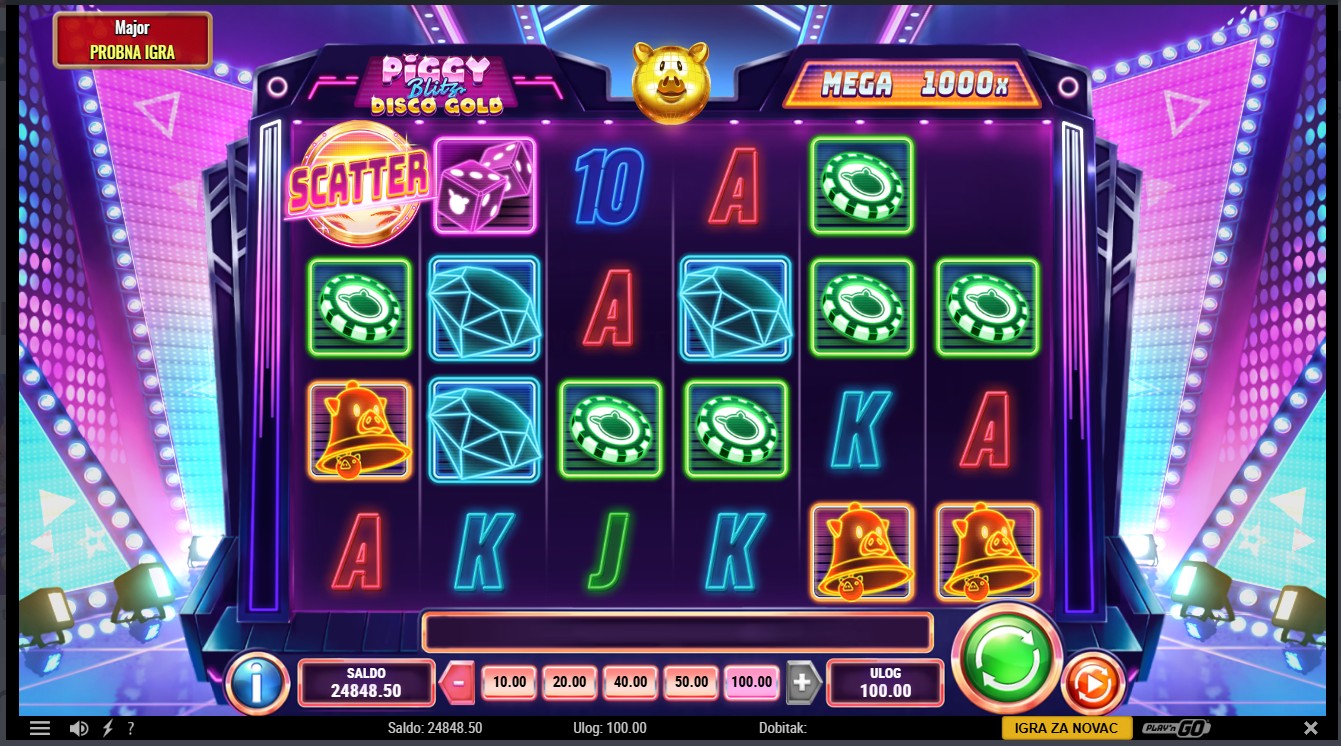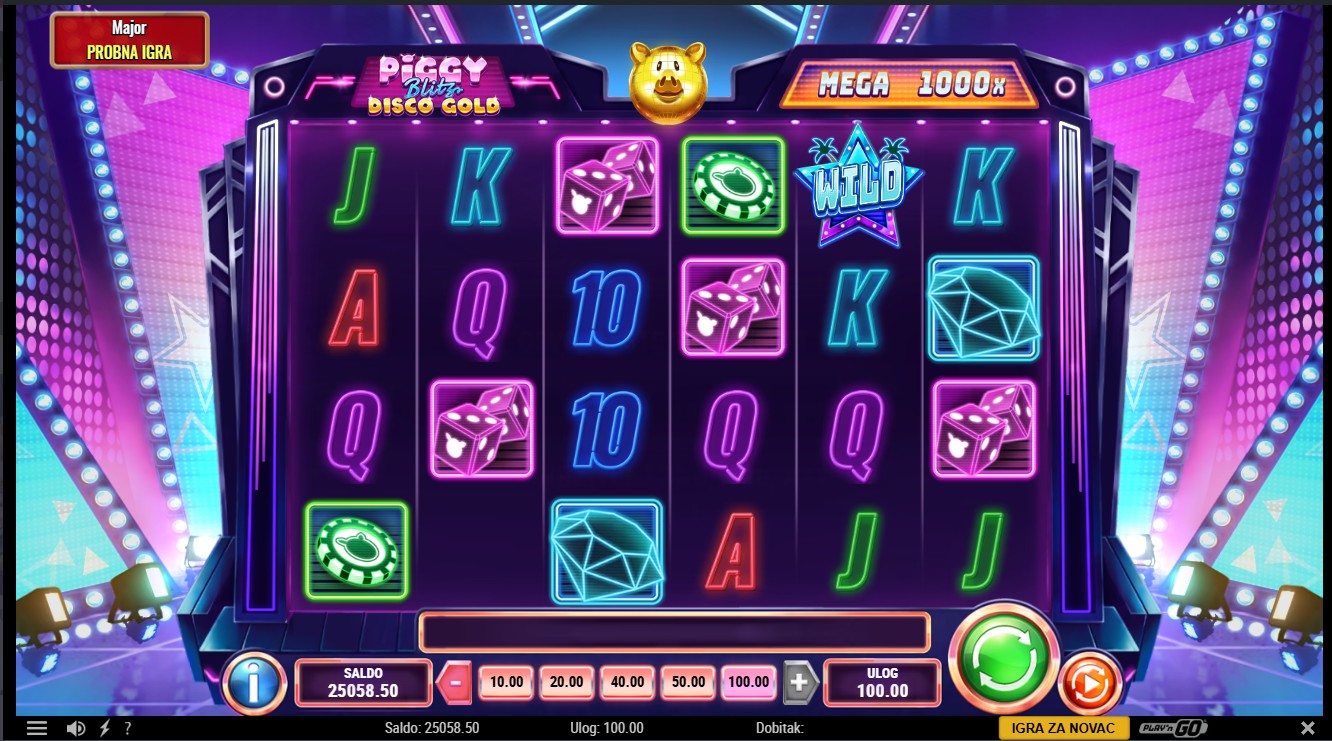 Piggy Blitz Disco Gold providera Play’n GO vodi te u svijet blještavih diskoteka i sjajnih nagrada. Ova slot igra sa 6 rola i 4096 isplatnih kombinacija kombinira Cash Coin simbole, Piggy Bank simbole i kasicu-prasicu Gold Piggy koja nasumično dodjeljuje izravne nagrade.Scatter simboli pokreću uzbudljive značajke Blitz Spinz, Free Spinz i Mystery Spinz, a posebni multiplikatori i bonus simboli čine igru dinamičnom i punom iznenađenja.