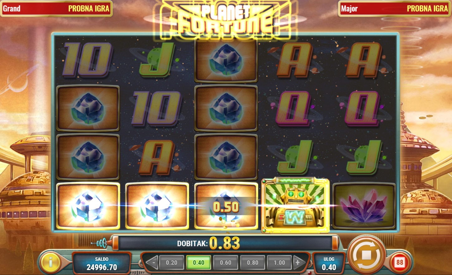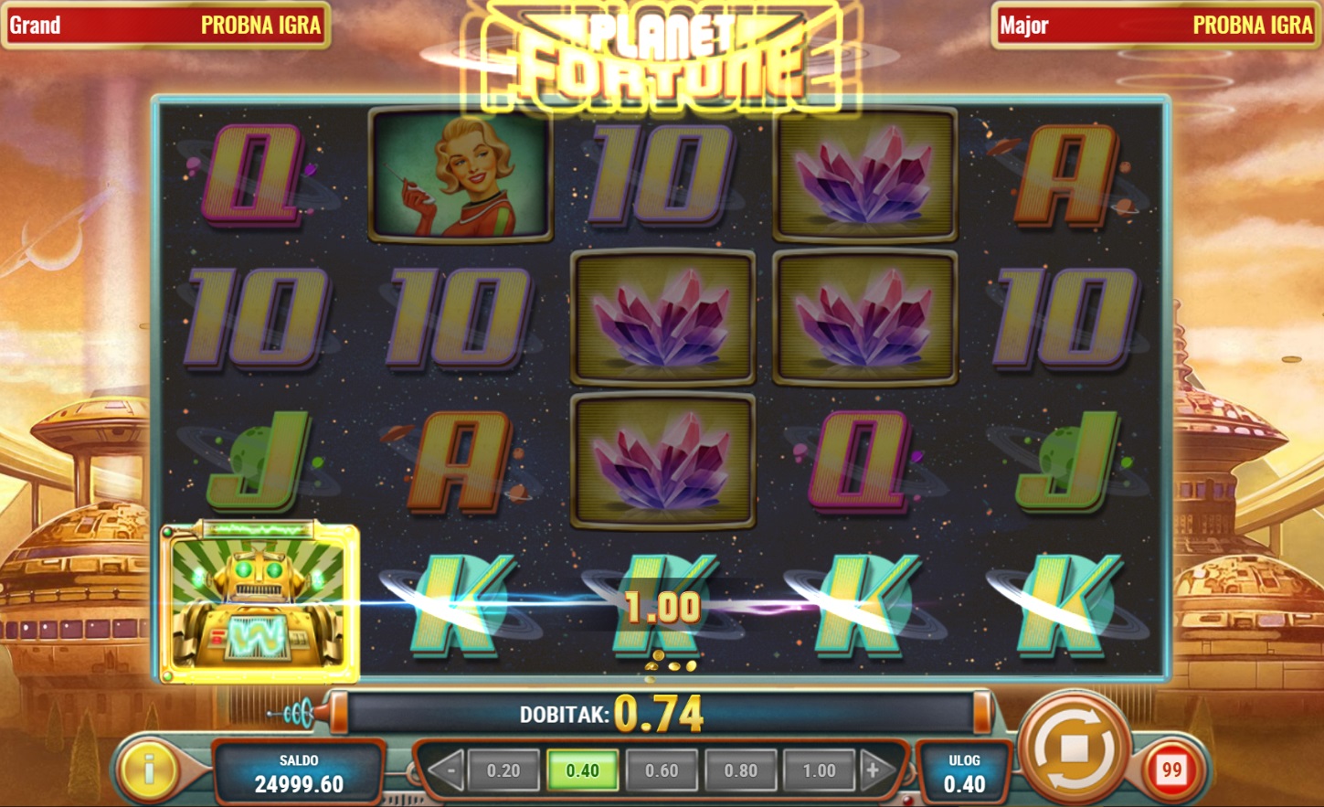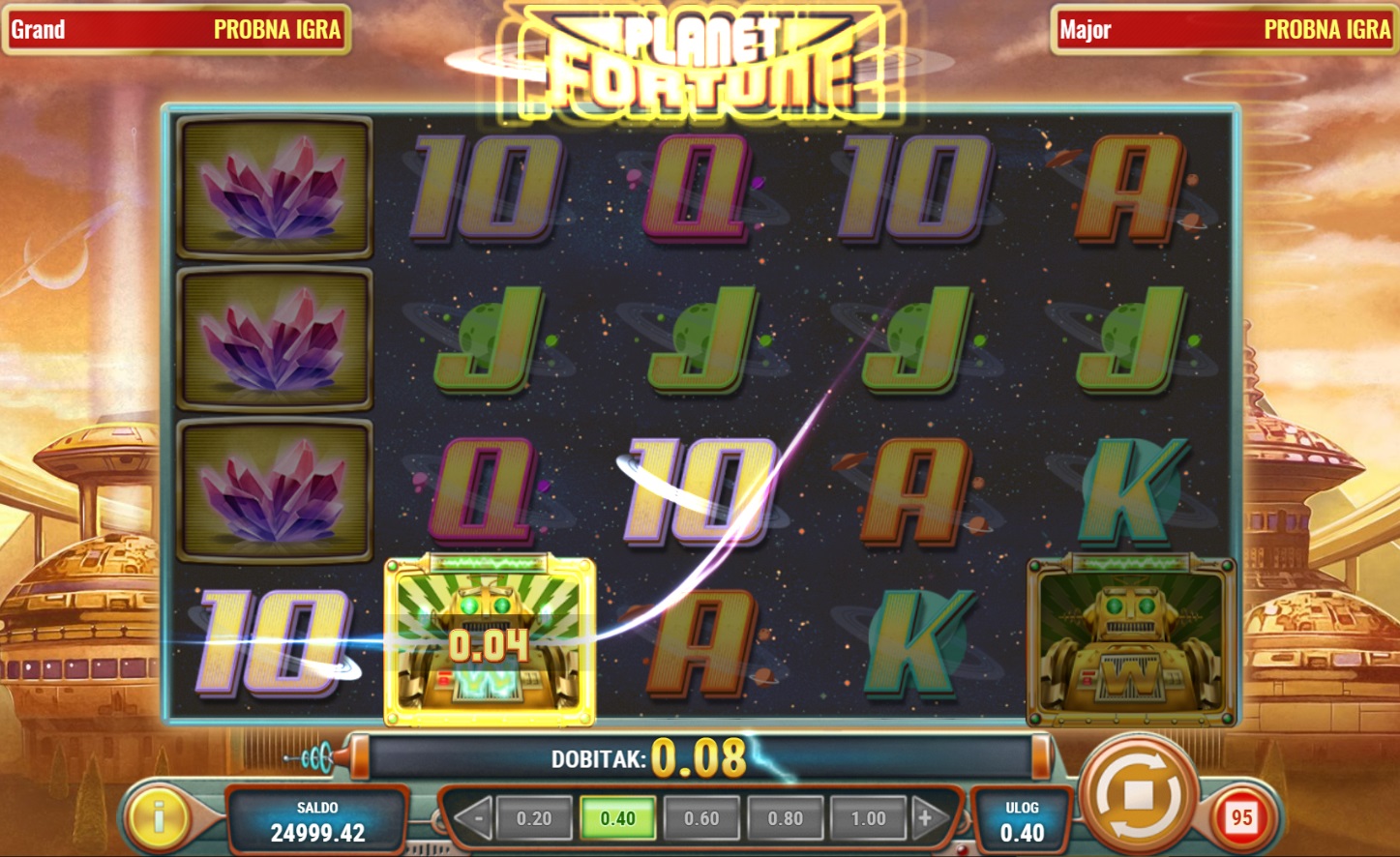 Planet Fortune nudi zabavan i dinamičan gameplay s naglaskom na Wild simbolima i bonus značajkama. Igra se odvija na 5 rola s 40 isplatnih linija. Tvoj cilj je povezati simbole s lijeva nadesno, dok Wild simbol može zamijeniti sve druge simbole i pomoći u stvaranju dobitnih kombinacija. Tri ili više robota aktiviraju bonus igru Revolucija robota, gdje dobivaš 10 besplatnih vrtnji, a Wild simboli se fiksiraju i pomiču s rolama. Magnetski kaos može nasumično spojiti dvije ili tri role, što povećava šanse za veće dobitke s većim simbolima.