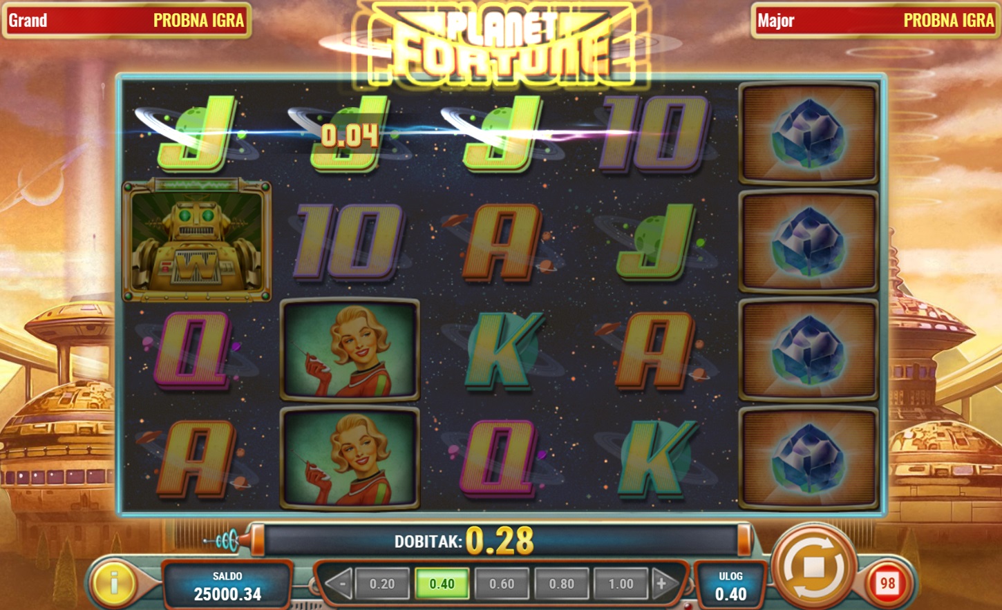 Planet Fortune je video slot s 5 rola i 40 isplatnih linija koji te vodi u svijet retro-futurizma. U ovoj igri istražuješ univerzum prepun blaga, dok su simboli naslagani u stogove na rolama, osim simbola A-K-Q-J-10 i Wild simbola. Wild simbol, koji predstavlja robota, može zamijeniti bilo koji drugi simbol i stvoriti dobitne kombinacije. Posebne bonus značajke uključuju Revoluciju robota, koja donosi 10 besplatnih vrtnji s fiksiranim Wild simbolima, te Magnetski kaos, gdje se role spajaju i prikazuju velike simbole. Uživaj u igri i istraži mogućnosti za velike dobitke na Planet Fortune!