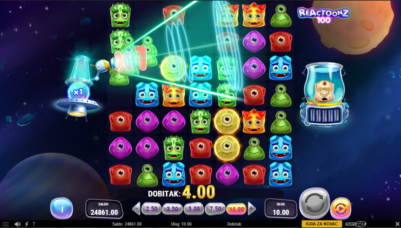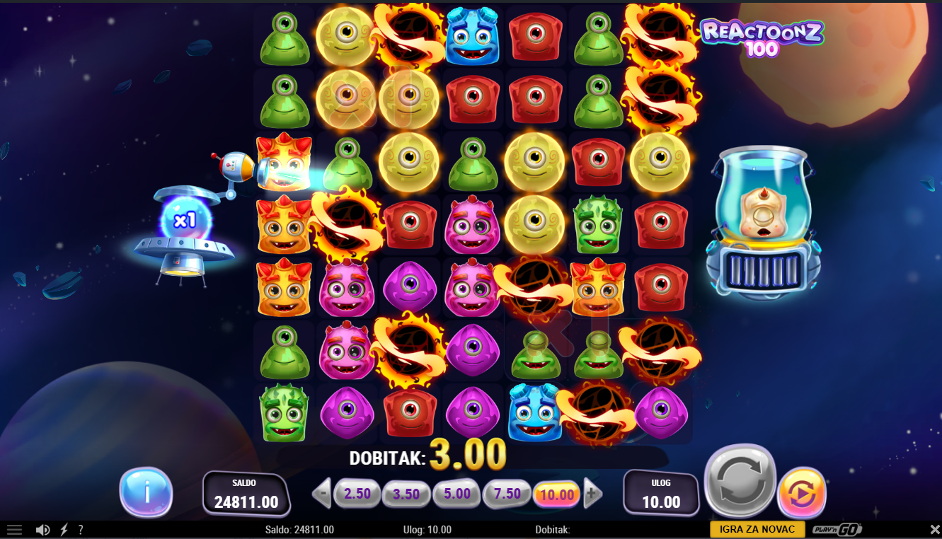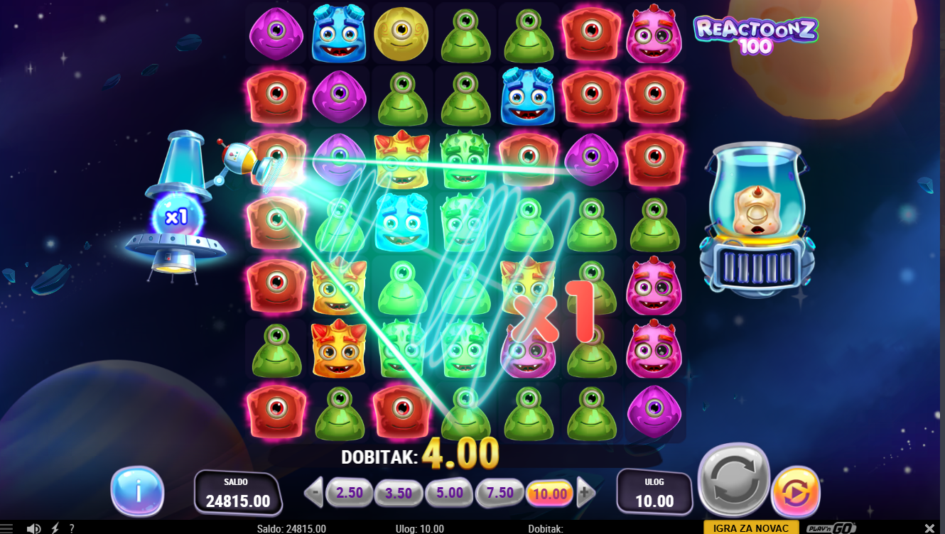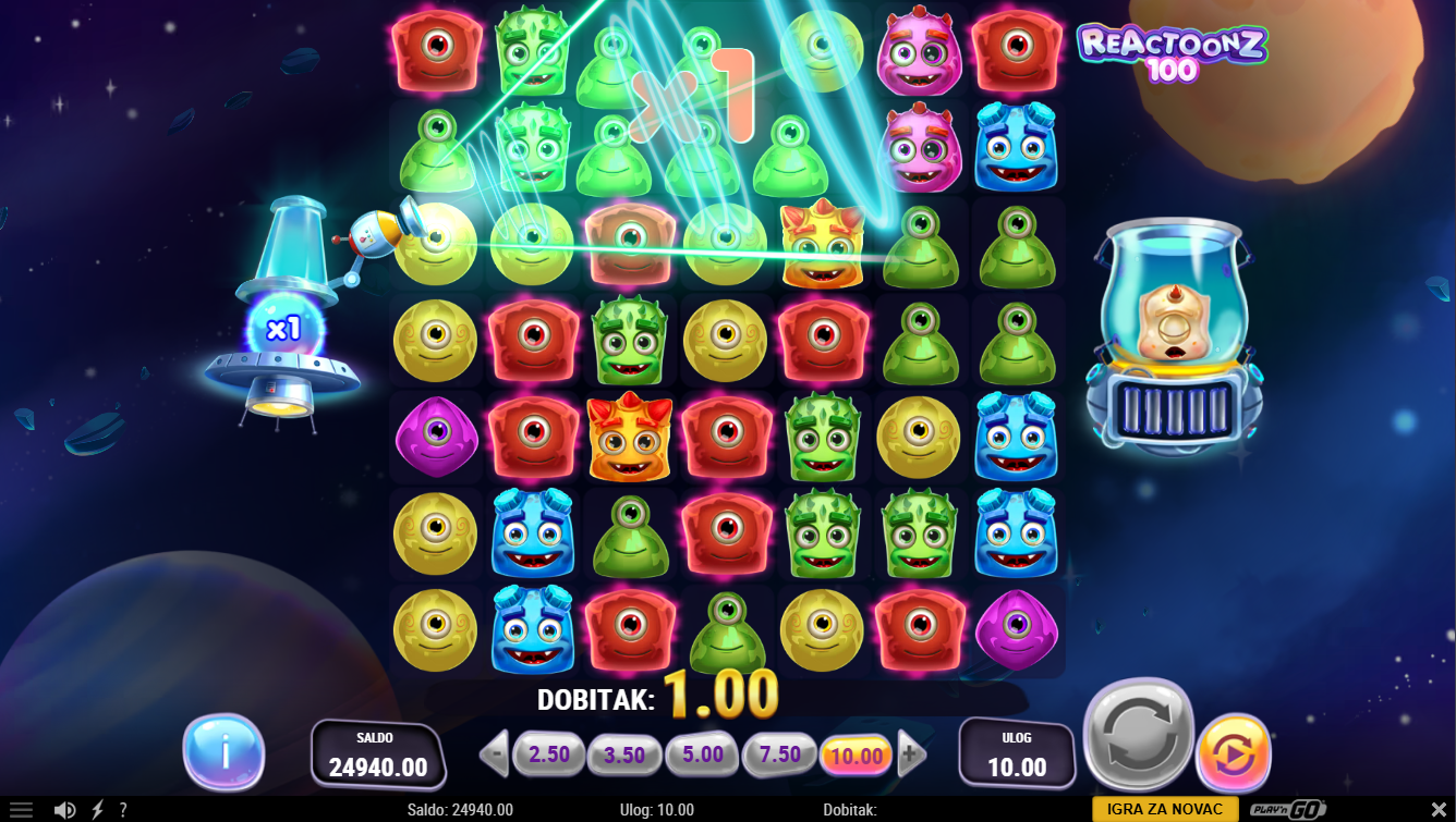 Reactoonz 100 od Play'nGo je online video slot u znatno proširenoj verziji od klasičnog. Igra je smještena u vanzemaljski svemir pun simpatičnih čudovišta (Reactoonz likova). Ima mrežu od sedam redova i sedam bubnjeva. Dobitci se ostvaruju kada se pet ili više istih simbola spoje horizontalno ili vertikalno.